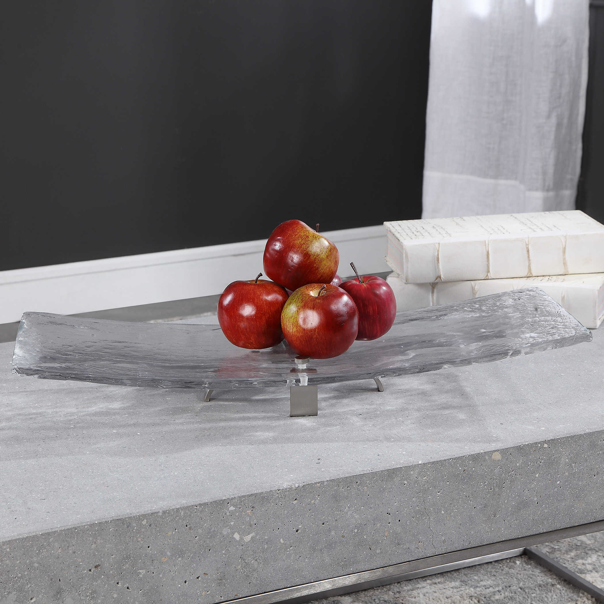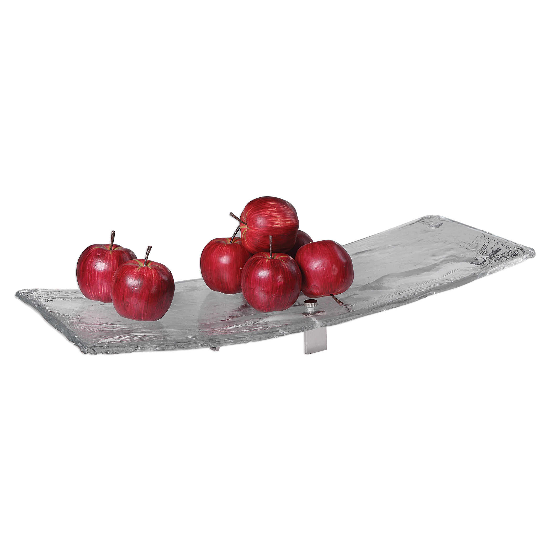 Представляем поднос Mika - изящный и элегантный. Его прозрачное художественное стекло обладает небольшим изгибом, что придает ему утонченный вид. Он стильно дополняется матовым никелевым основанием с открытой аркой, создавая привлекательное сочетание материалов и форм.