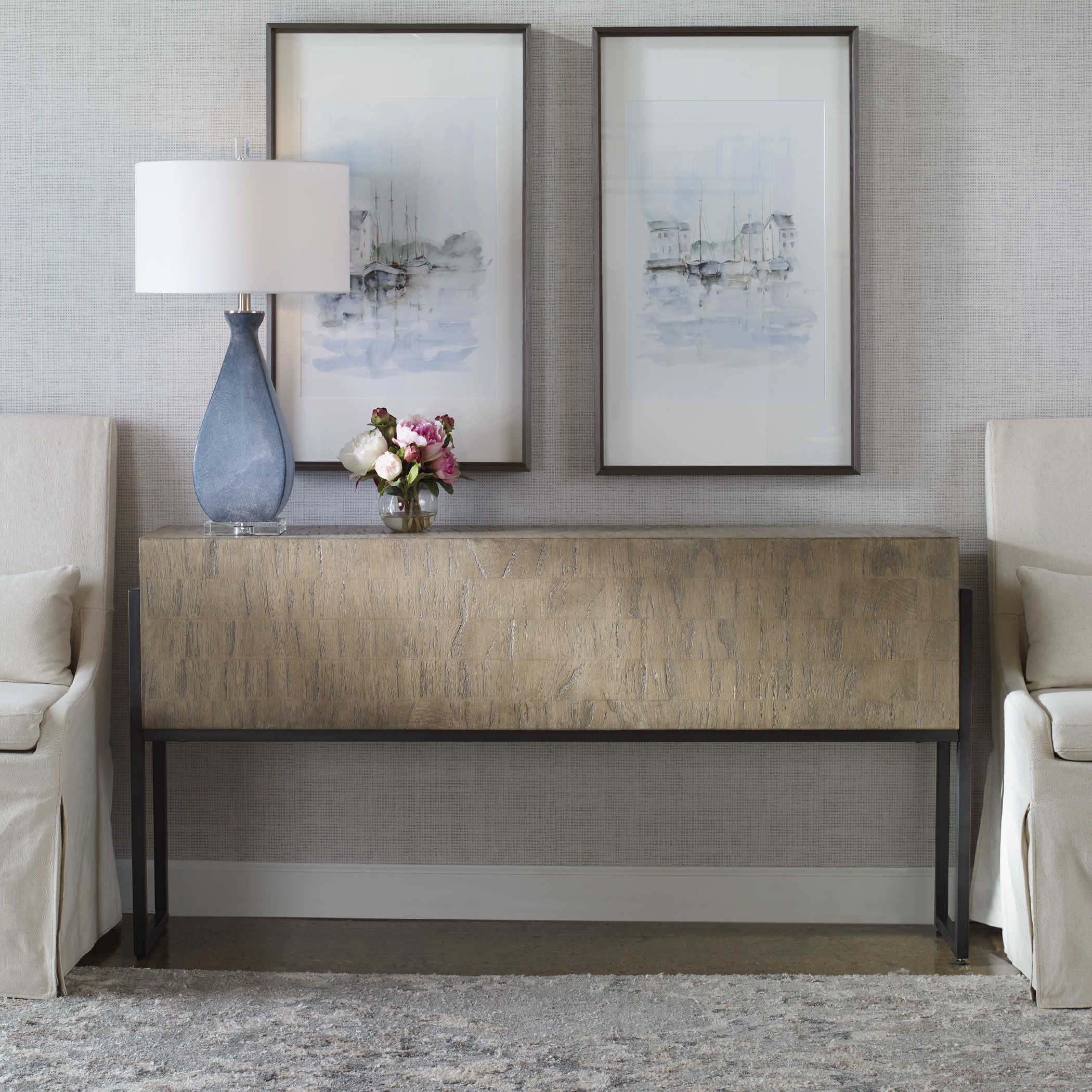 Корпус консоли украшен шпоном, который наносится слоями, создавая прекрасные узоры зерен. Этот процесс придает консоли неповторимый характер и добавляет ей дополнительную глубину. Корпус вставлен в железный каркас, который придает консоли стабильность и современный акцент.