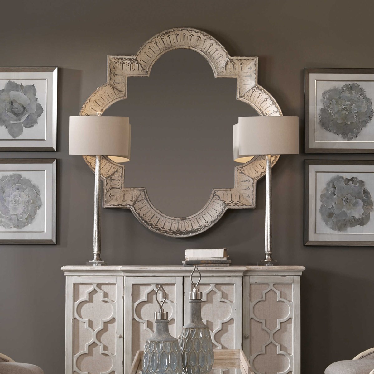 Настольная лампа Fiona - это прекрасное сочетание изысканости и элегантности. Ее коническое ребристое ртутное стекло создает особый визуальный эффект, вдохновляя игрой света и тени. Матовые никелированные детали и хрустальная ножка добавляют этой лампе изысканности и блеска.