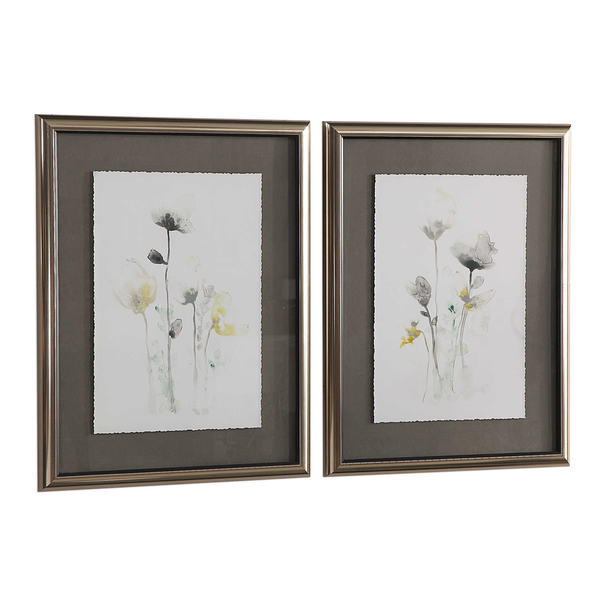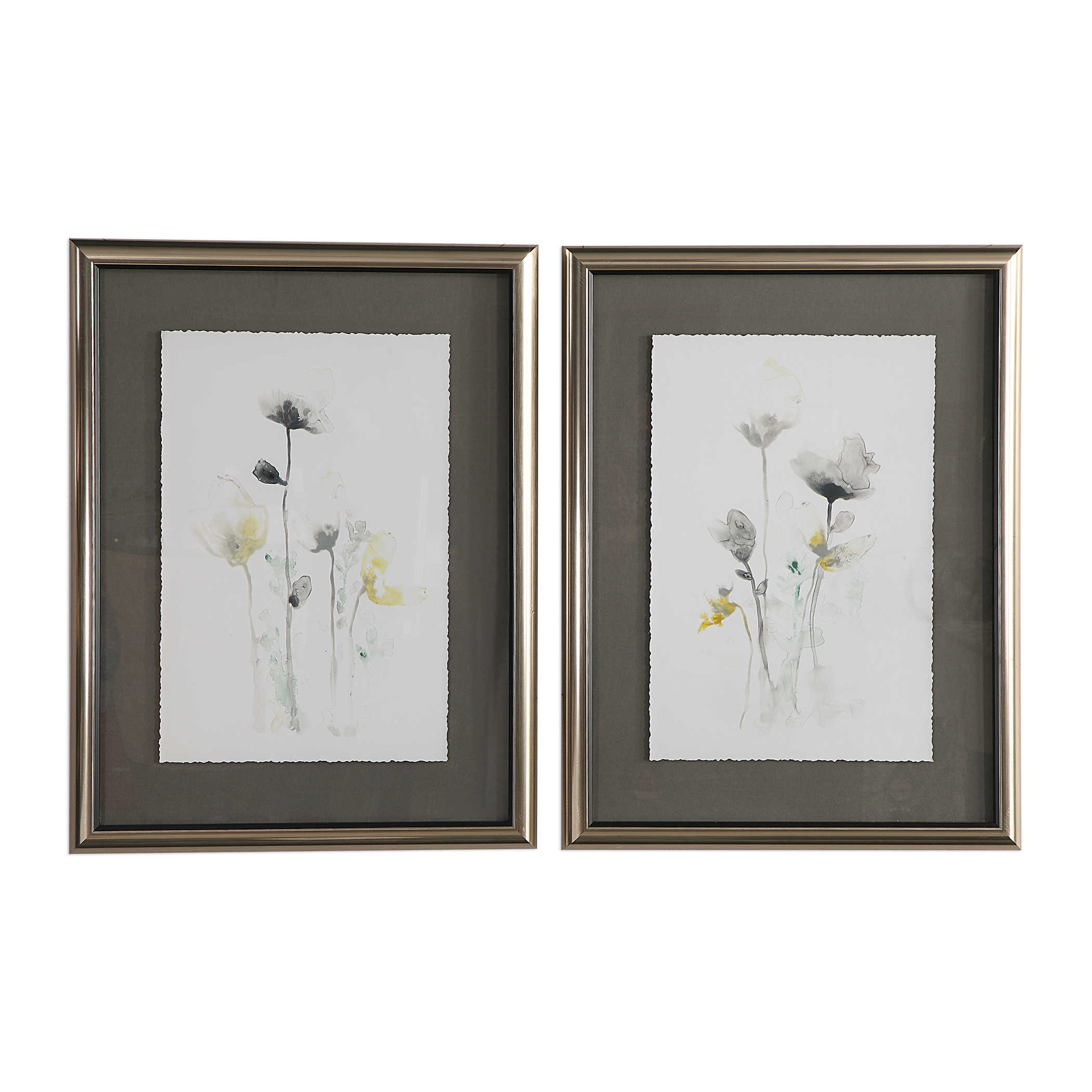 Эти цветочные принты сочетают в себе лучшие черты традиционного и современного стилей и создают удивительное произведение искусства. Оттенки темно-зеленого, желтого и серого цвета танцуют на фоне, который не совсем белый и имеет неровные края, придавая произведению дополнительный характер.