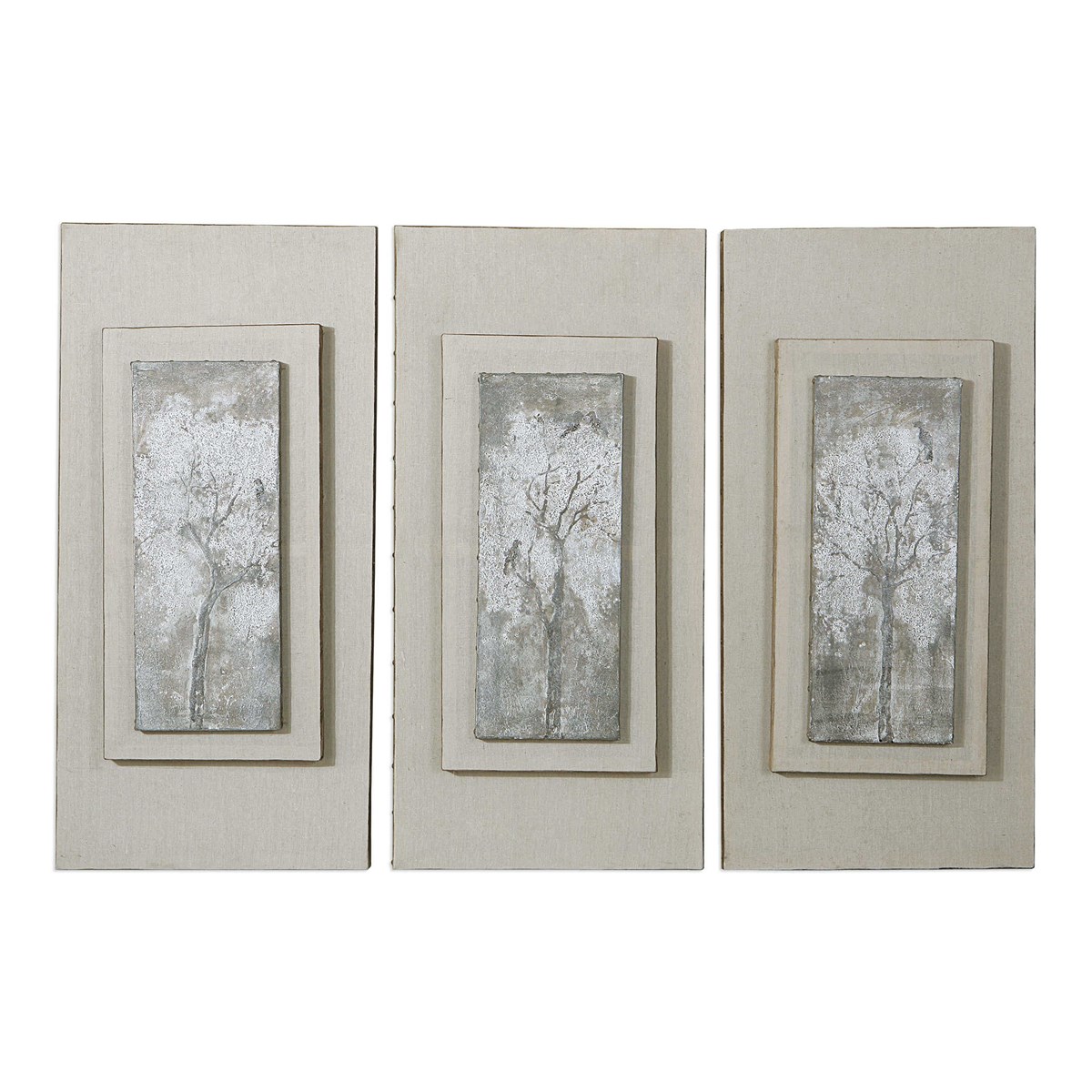 Эти переходные по стилю полотна, входящие в коллекцию Triptych Trees от американского бренда Uttermost, восхищают своим утонченным трехмерным видом. Каждая картина в этом серебристо-сером ландшафтном триптихе тщательно натягивается и крепится к деревянной раме, а затем ловко размещается на досках. Внешний край каждого изображения украшен коричневой заливкой, а изысканные акценты в виде шляпок гвоздей добавляют особый шарм. Благодаря ручной работе каждое произведение обладает своей уникальностью и характером.