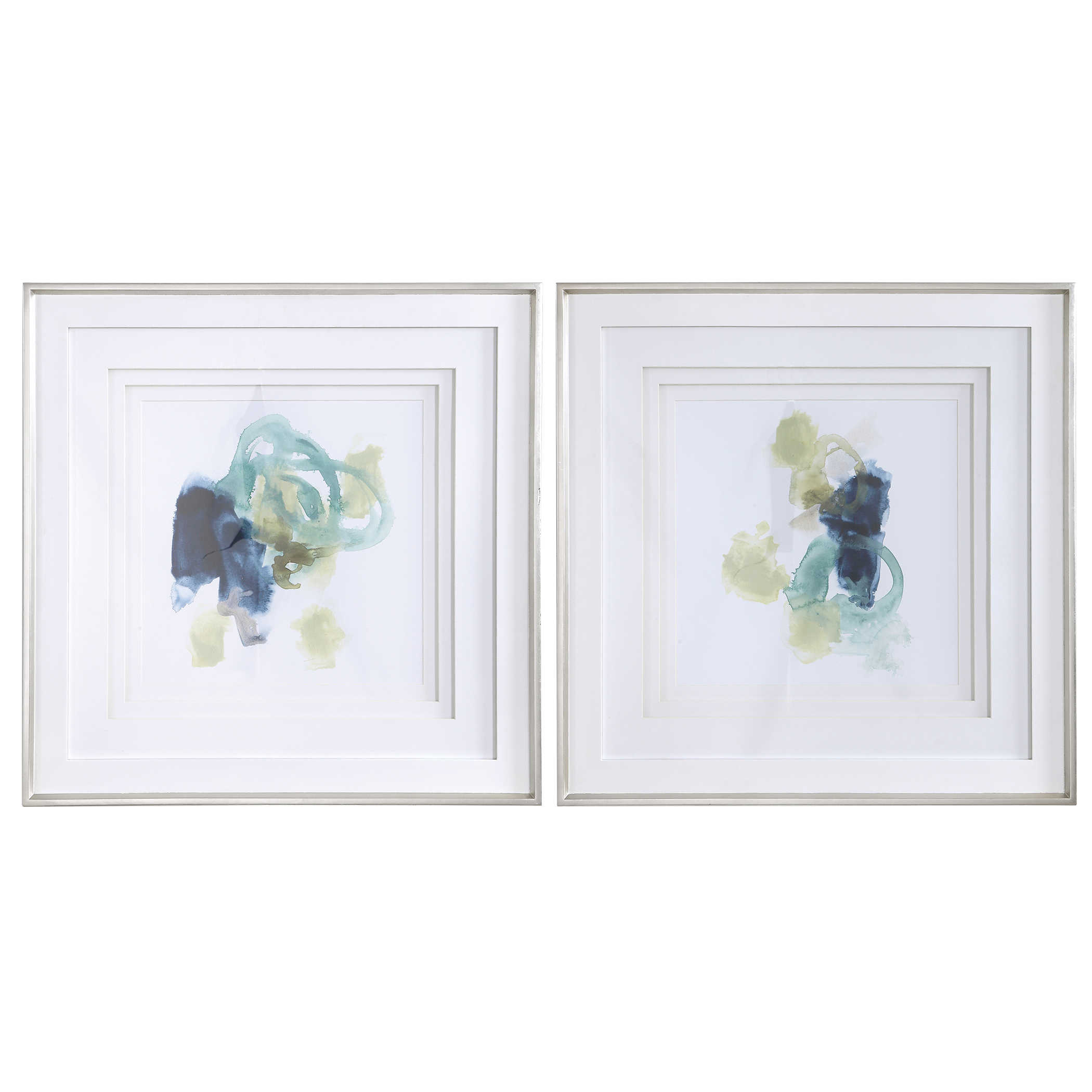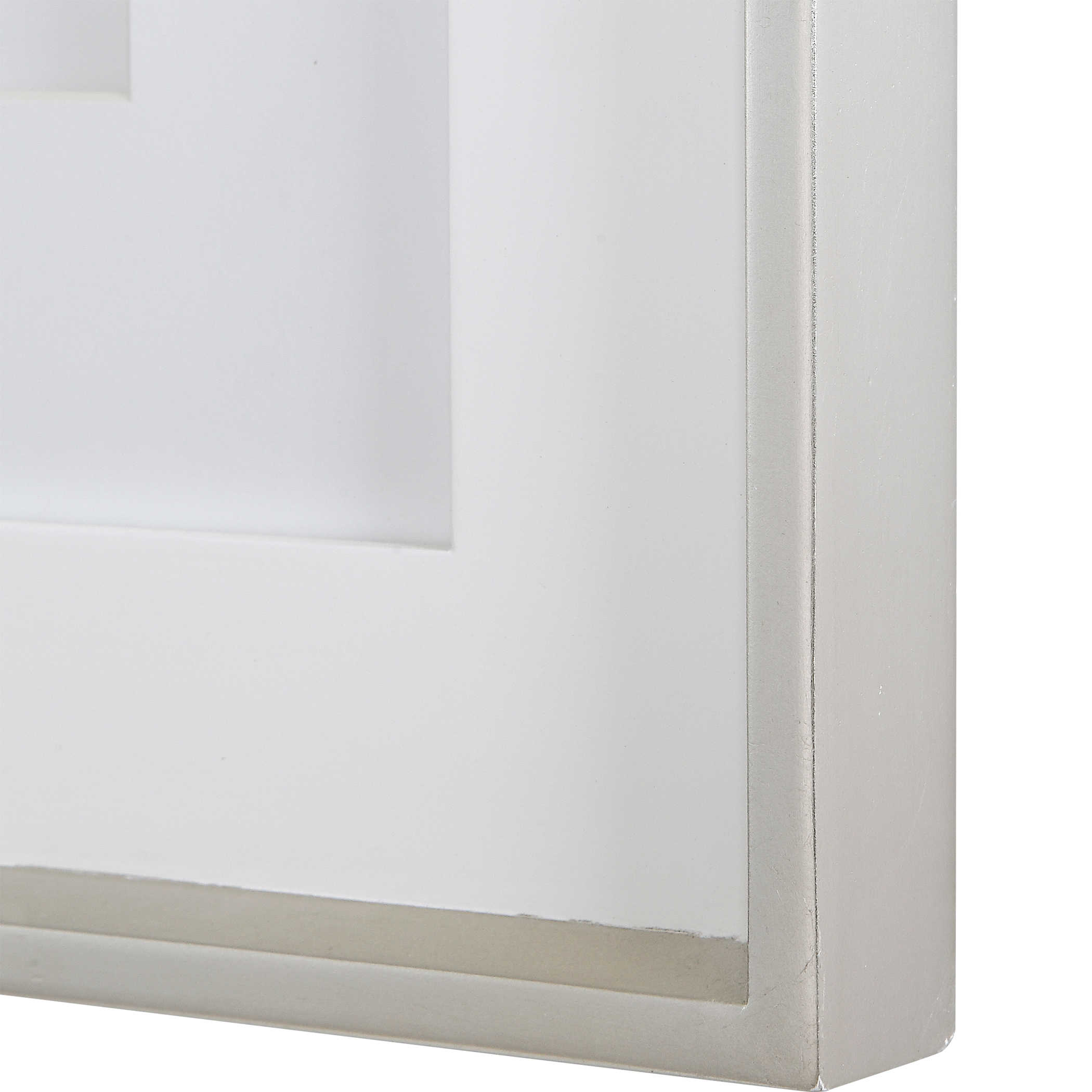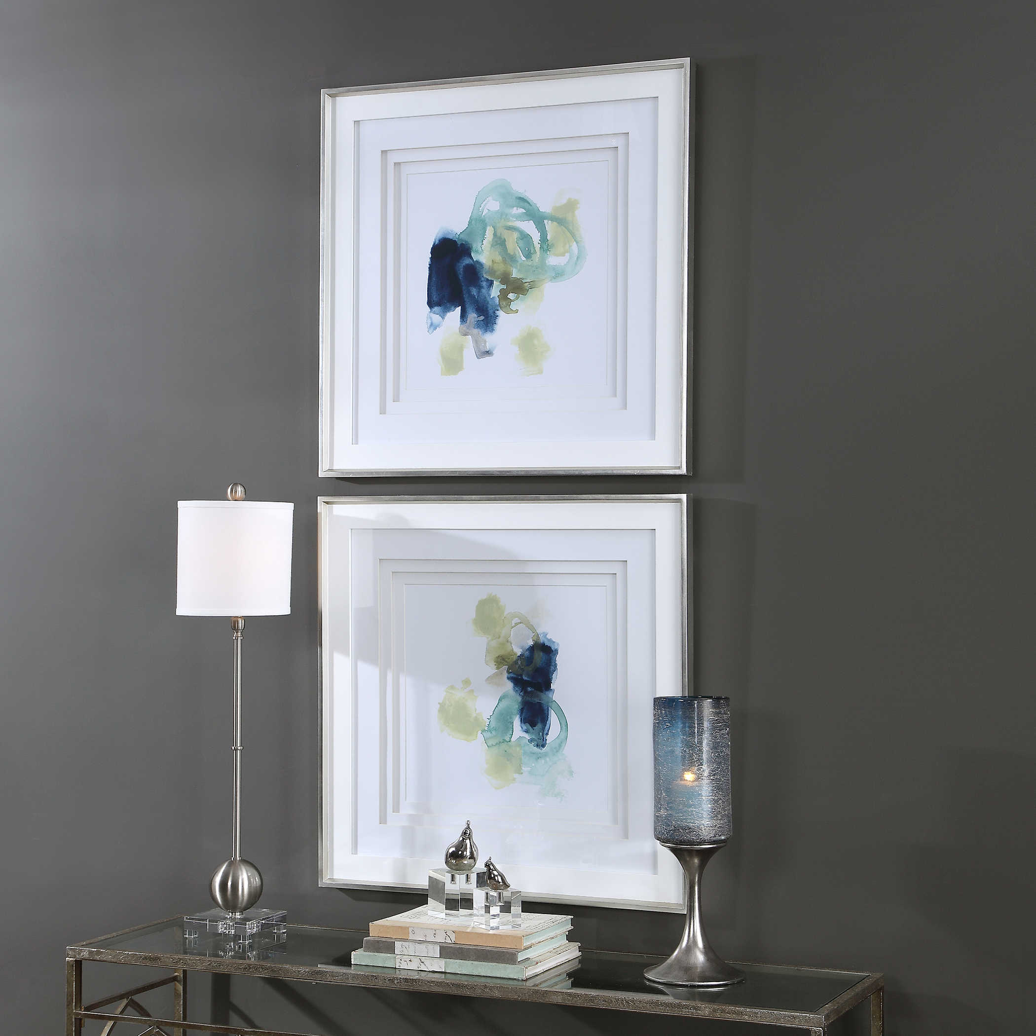 Эти современные абстрактные принты в рамках Integral Motion привносят яркие акварельные тона бирюзового, королевского синего и желто-зеленого на светлый белый фон. Эффект тройного матирования и дополнительные прокладки создают ощущение объема и глубины в каждом произведении. Они окружены белыми рамами, украшенными серебряной фольгой, что добавляет элегантности этому набору. Каждый отпечаток метикулезно помещен под защитное стекло, сохраняя его качество и сохранность. Эти произведения искусства станут стильным украшением вашего интерьера, придавая ему современный акцент.