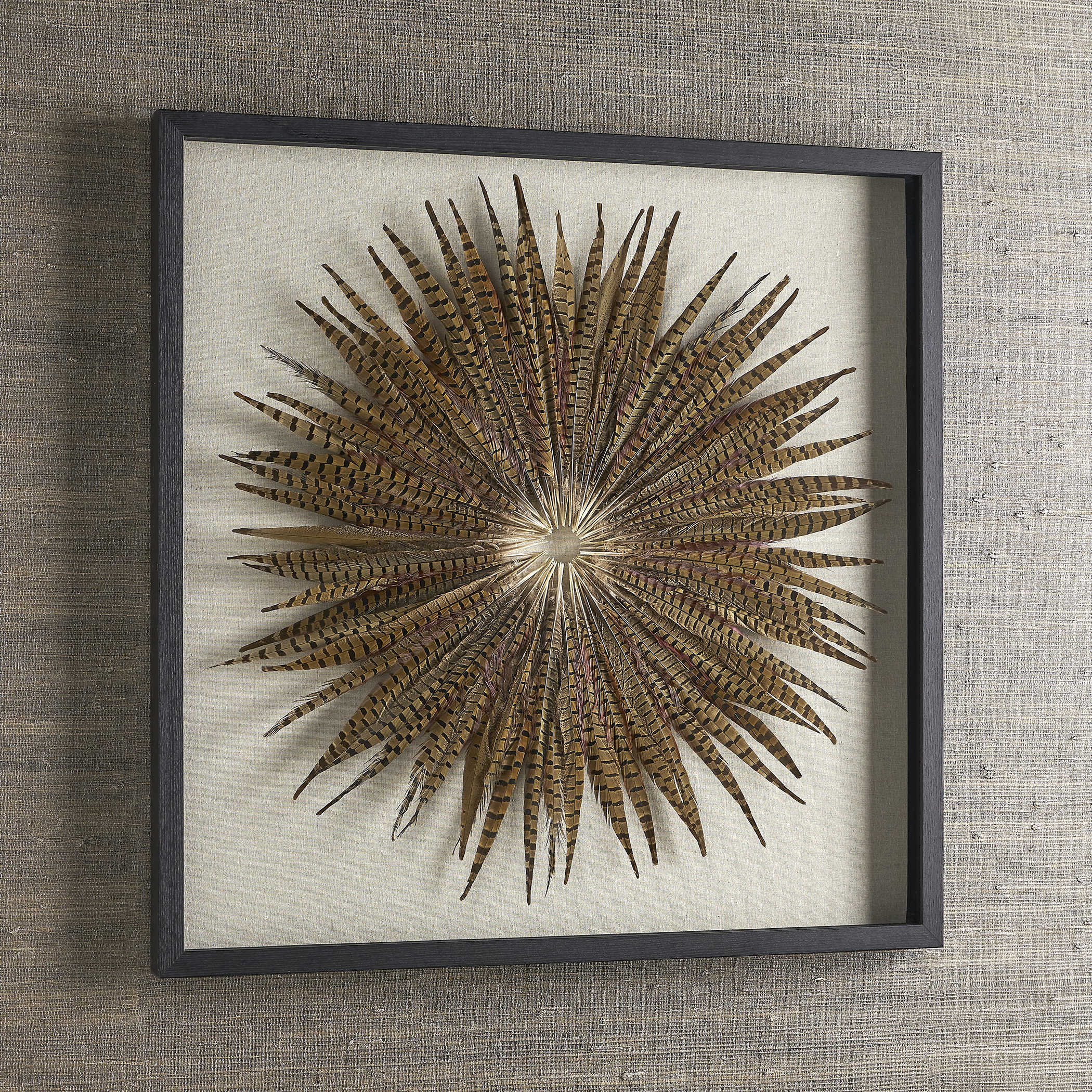 Удивительное мастерство в создании этого декора выражается в рамке для теней из елового дерева с мягкой черной отделкой. Рамка подчеркивает красоту и изысканность работы, придавая ей особый шарм. Настенный декор Feather Burst также защищен стеклом, что придает ему дополнительную глубину и защищает от повреждений.