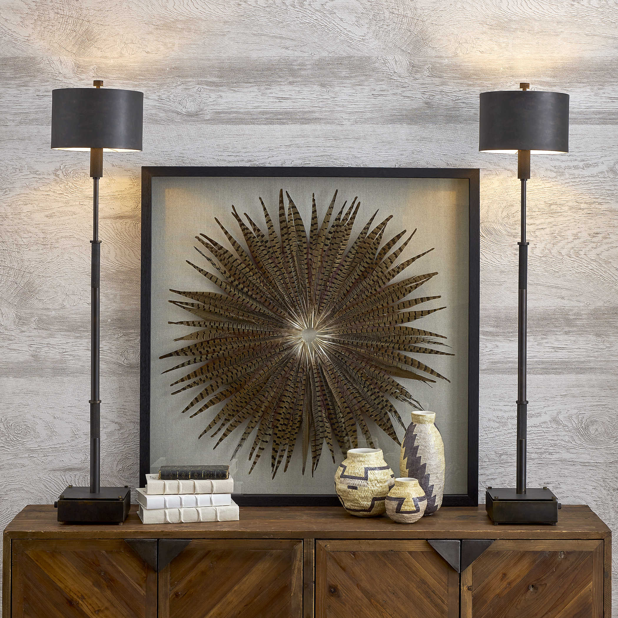 Изысканный настенный декор Feather Burst привносит в ваше пространство эффектный дизайн в виде звездочек, созданных из натуральных коричневых перьев фазана с нюансами синего и бордового. Каждое перо тщательно уложено вручную на основу из натуральной льняной ткани, придавая этому произведению искусства уникальный вид.