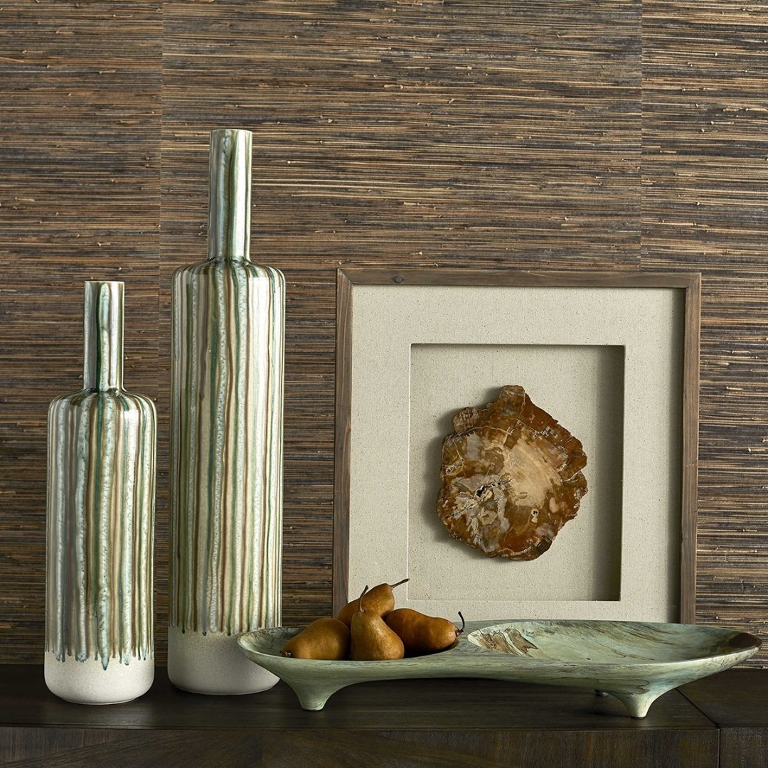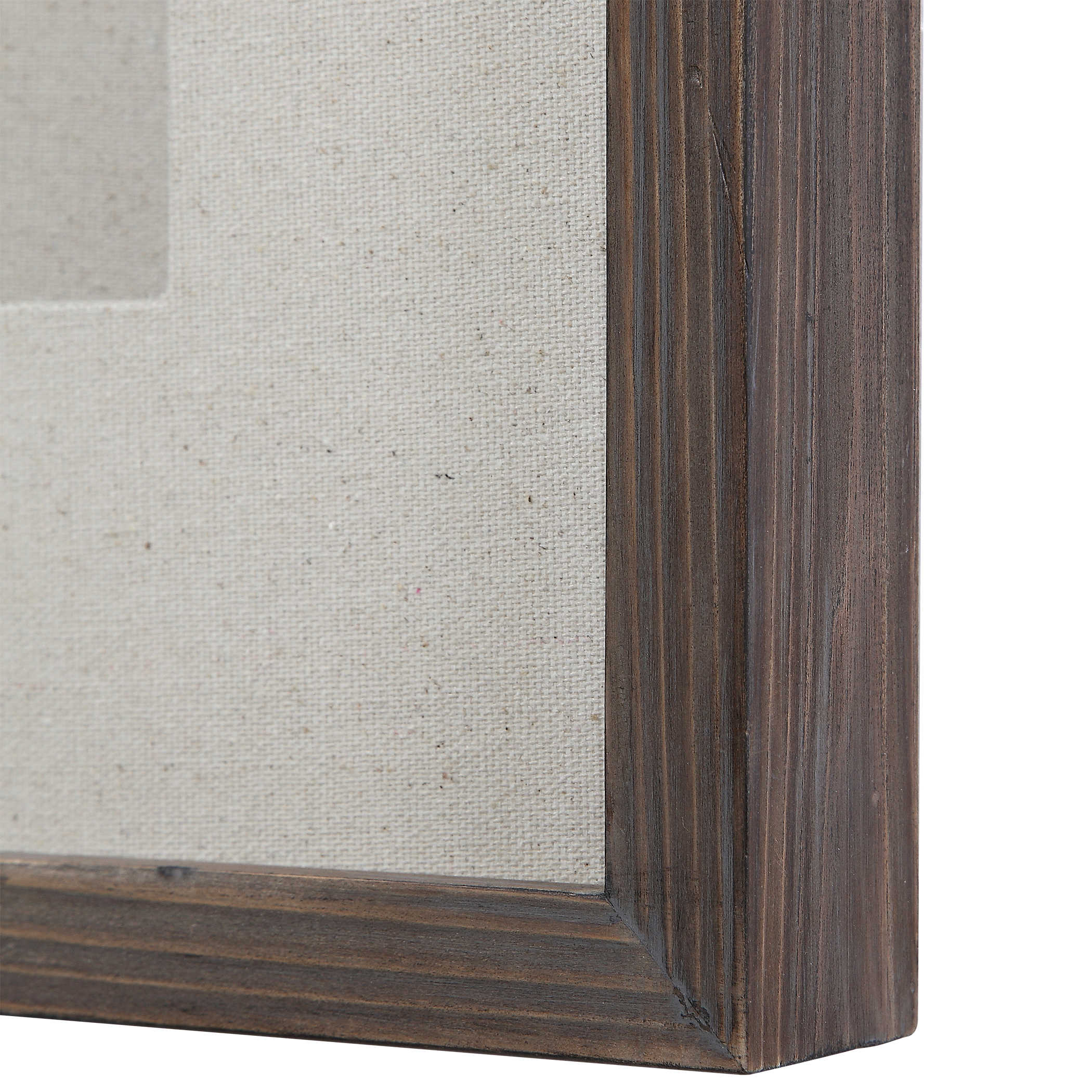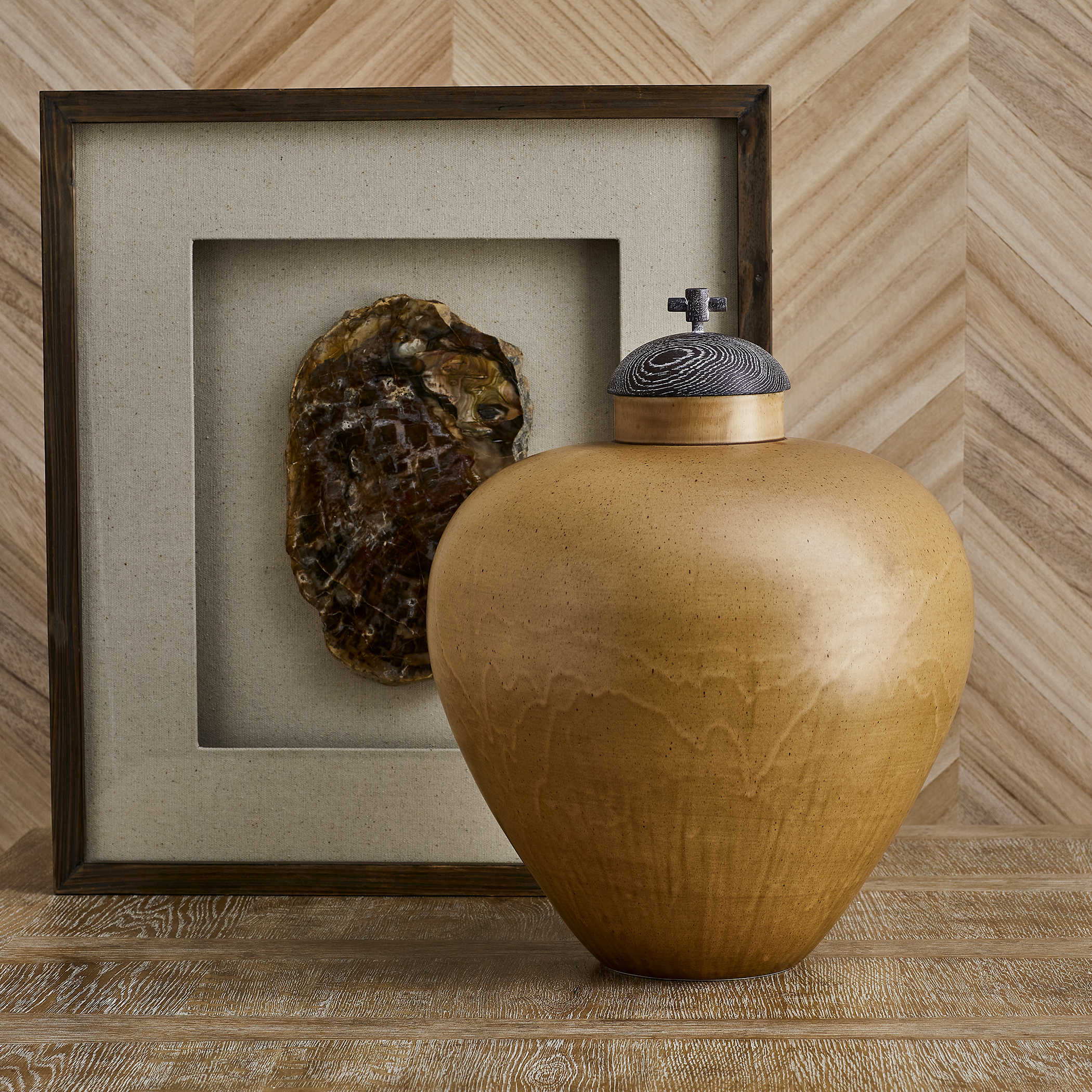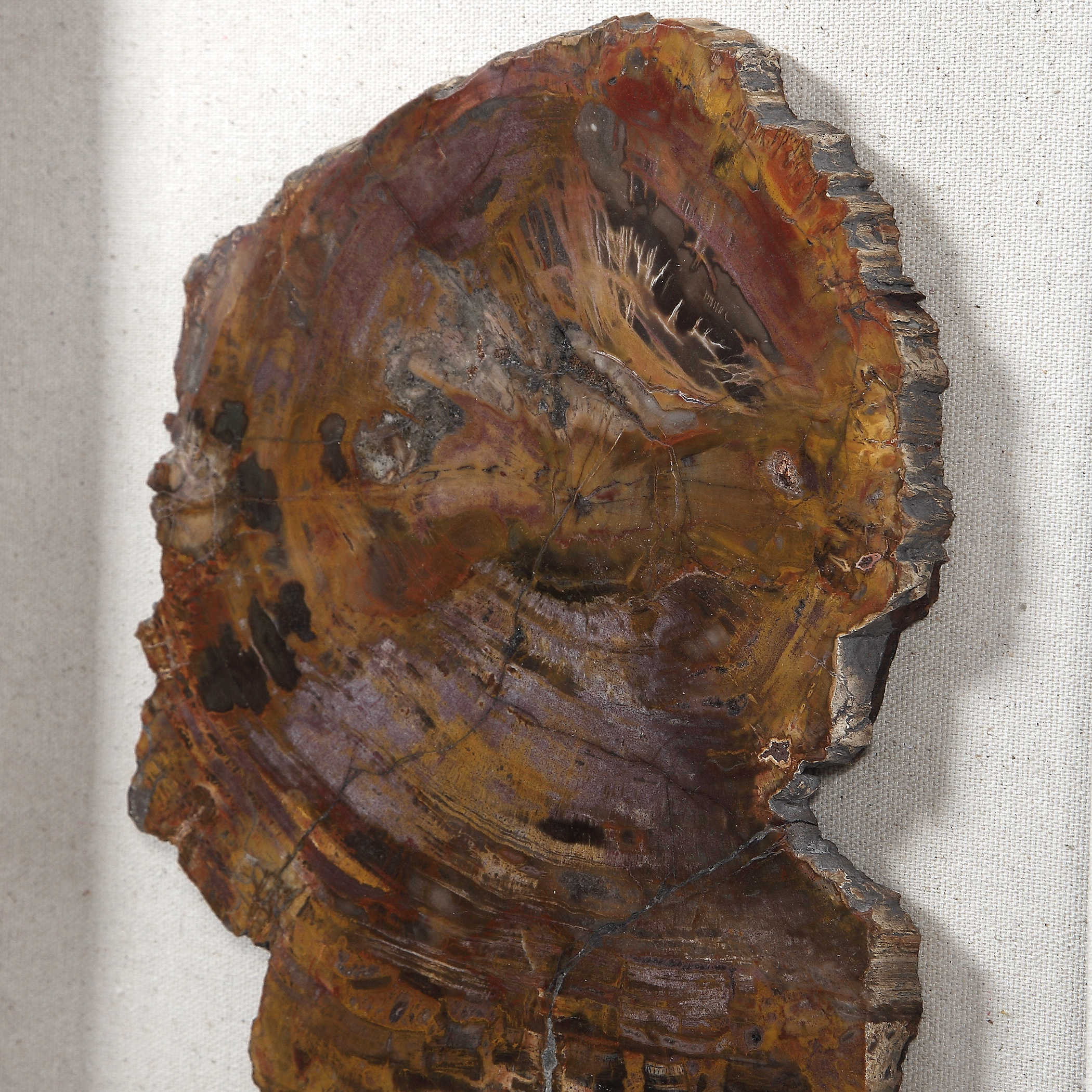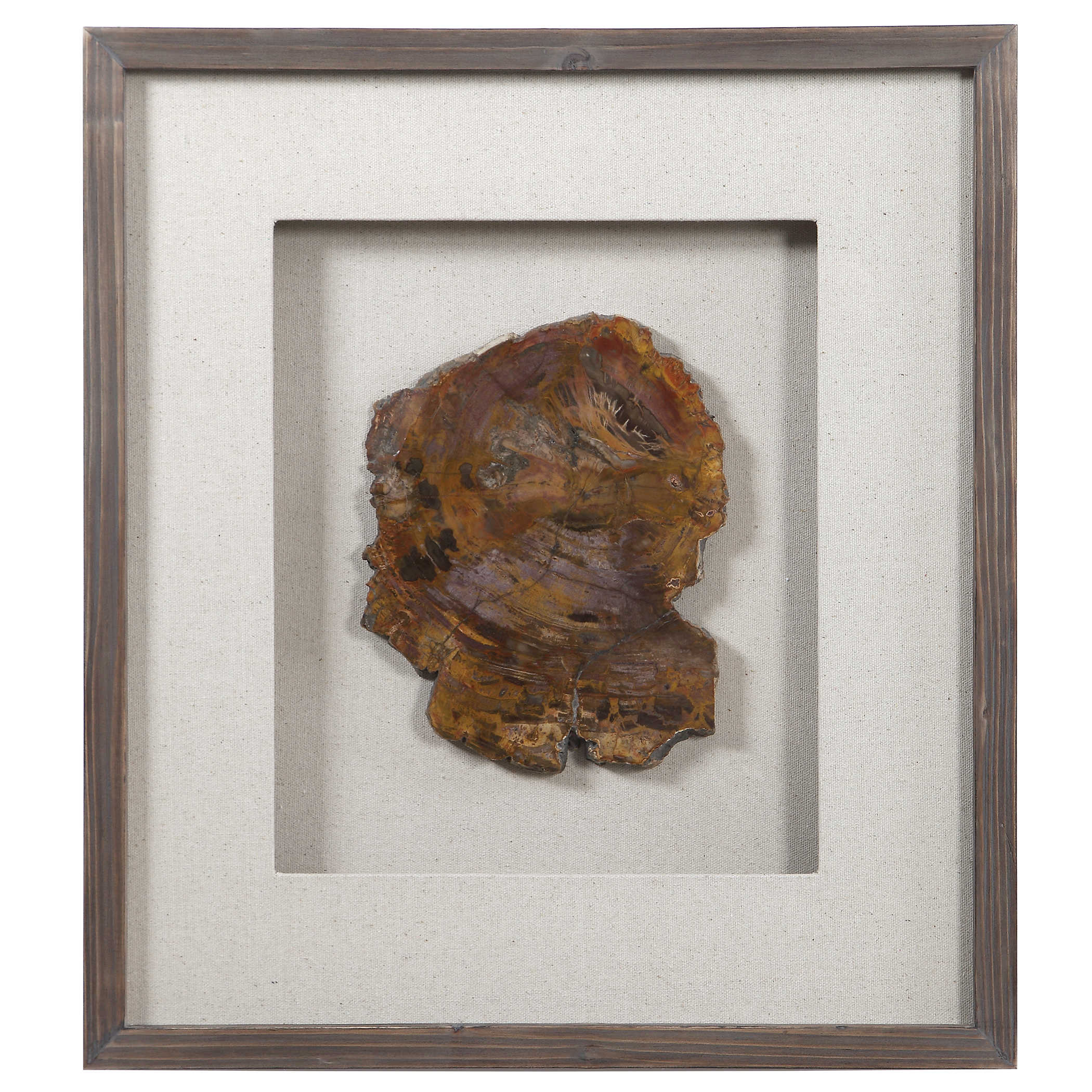 Настенный декор Uly в стиле shadow box представляет собой полированный срез окаменевшего дерева, помещённый под стекло в раму из елового дерева с тёмной ореховой отделкой и светло-бежевым льняным фоном. Благодаря естественным особенностям древесины каждый экземпляр отличается уникальным цветом и размером.