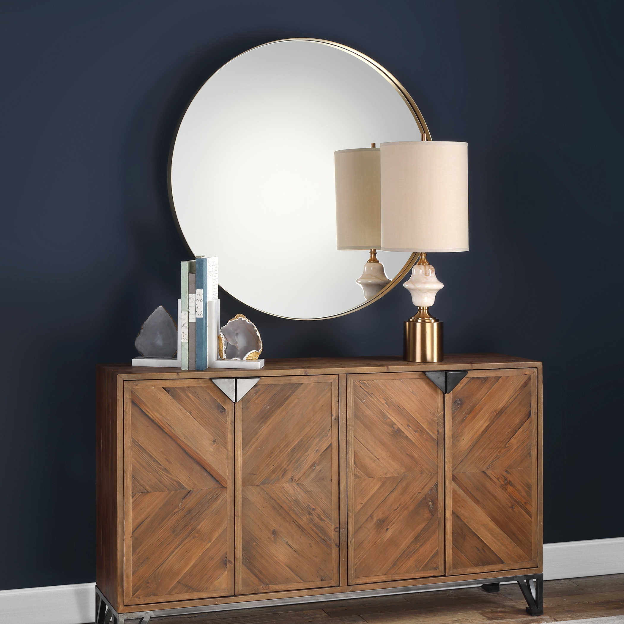 Pardria Round - это зеркало от американского бренда Uttermost, который выделяется своим элегантным дизайном, который при этом остается простым и сдержанным. Зеркало воплощает стиль с помощью толстой рамы из стальной ленты, украшенной отделкой из полированной латуни с металлическим покрытием. Это сочетание создает великолепное визуальное впечатление, где минимализм и изящество идеально сочетаются.