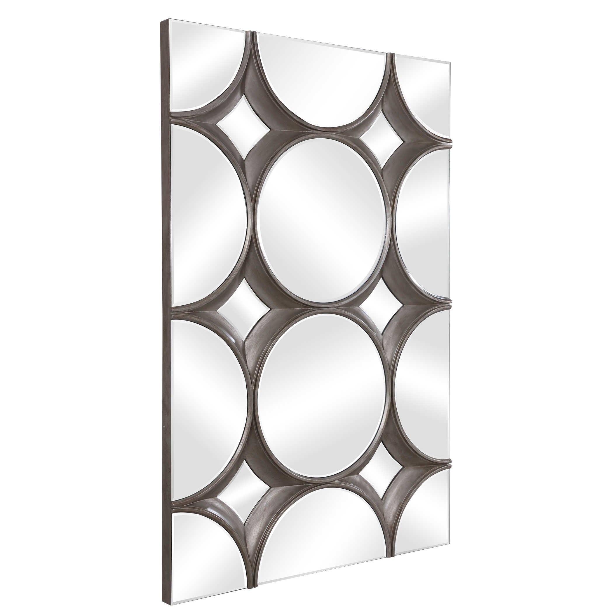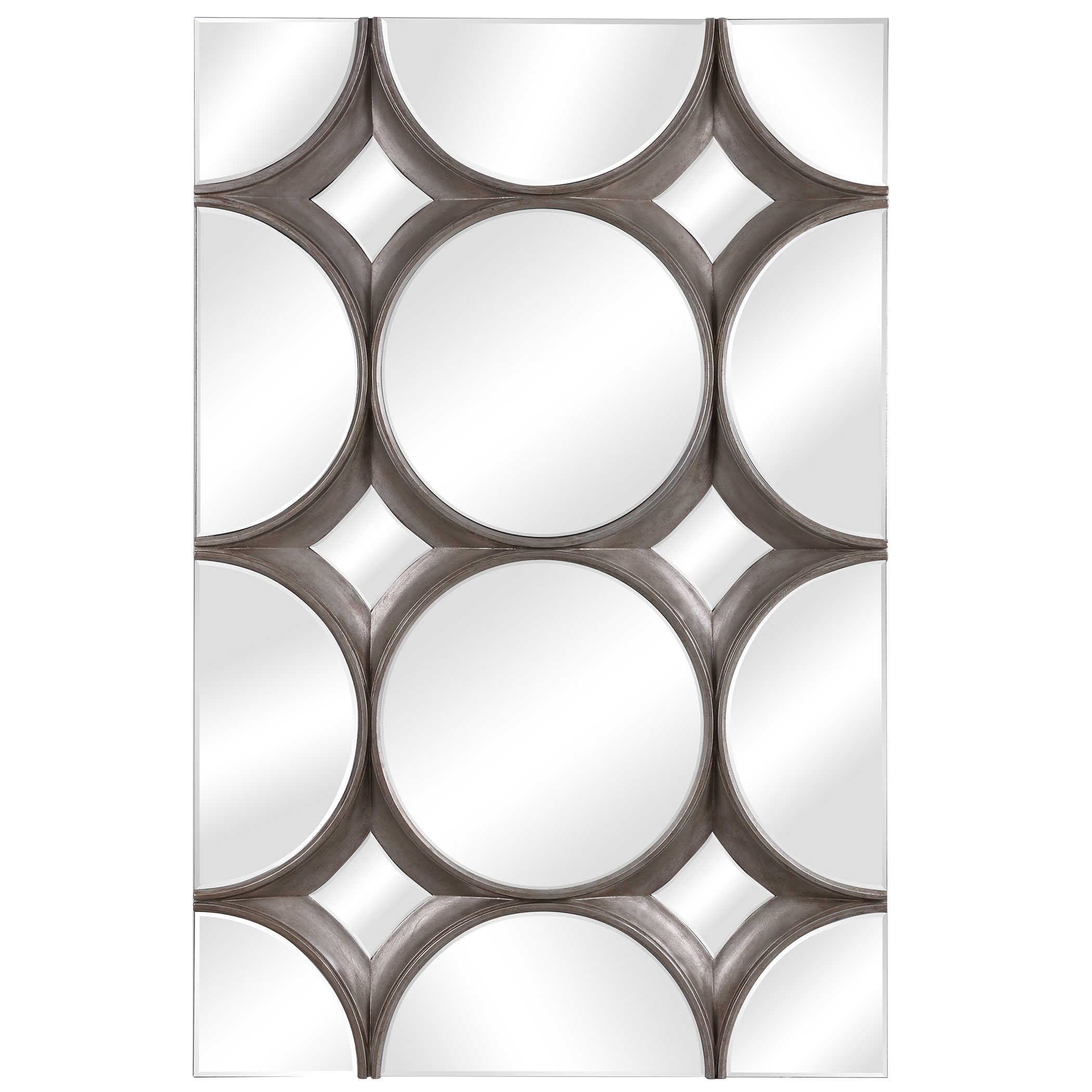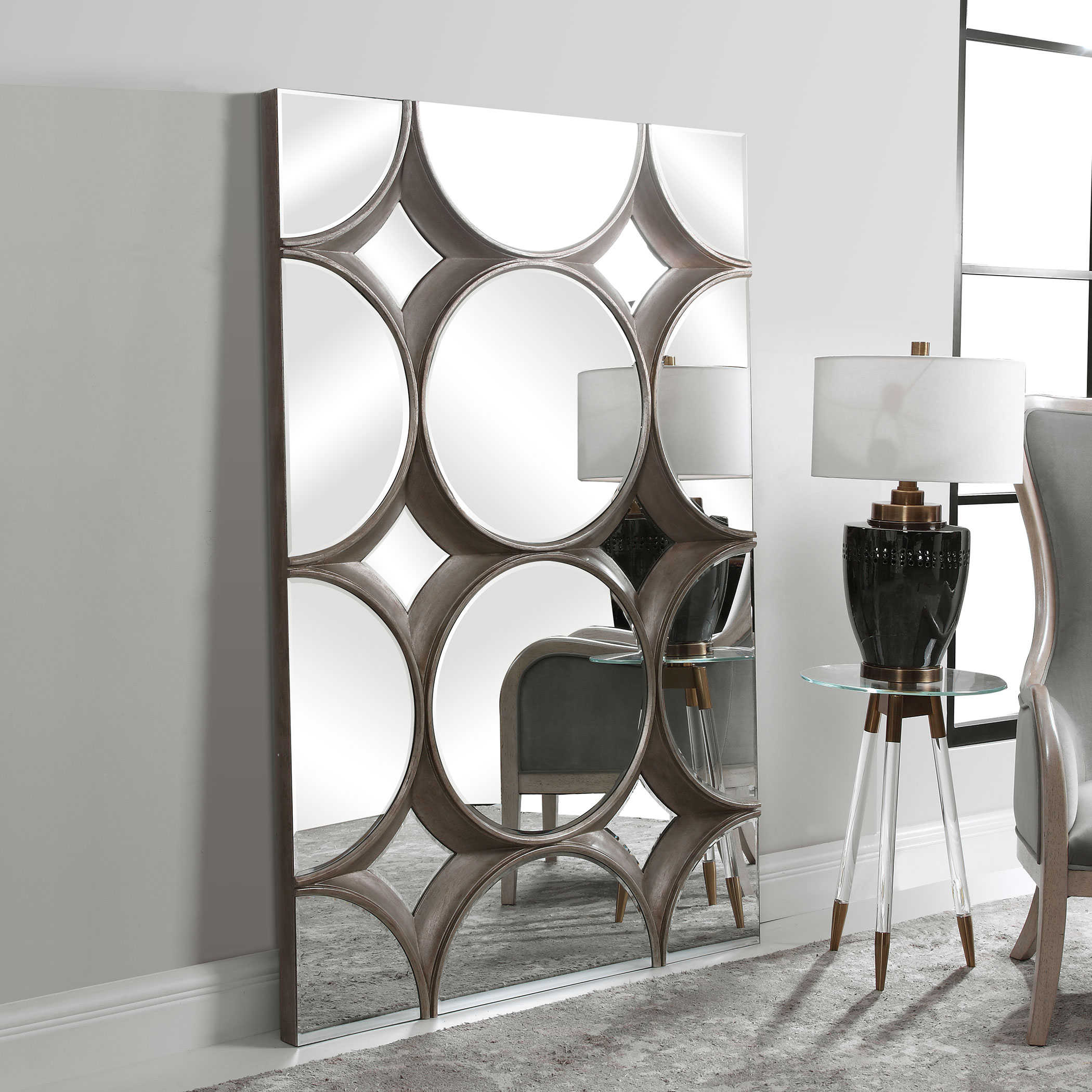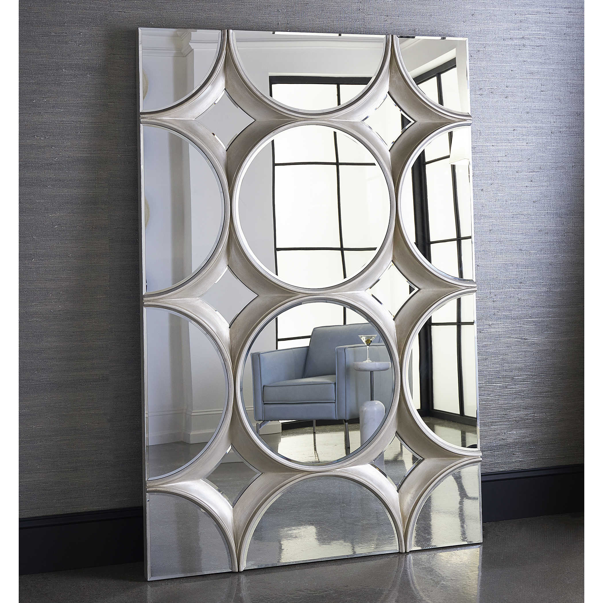Зеркало Bracelet от американского бренда Uttermost — это произведение искусства с объемной эстетикой, украшенное акцентами из серебряного листа и круглыми зеркалами со скошенной кромкой. Создайте выразительный акцент, группируя несколько таких зеркал на стене. Это универсальное зеркало можно подвесить как горизонтально, так и вертикально, что дает вам свободу в оформлении интерьера и позволяет добавить изысканности и характера вашему пространству.