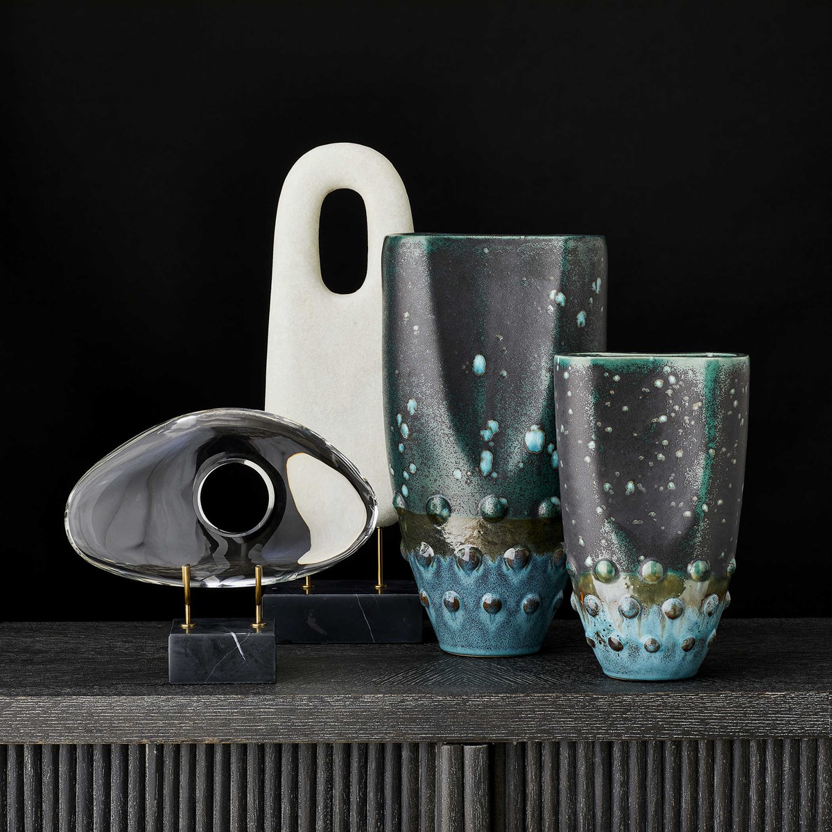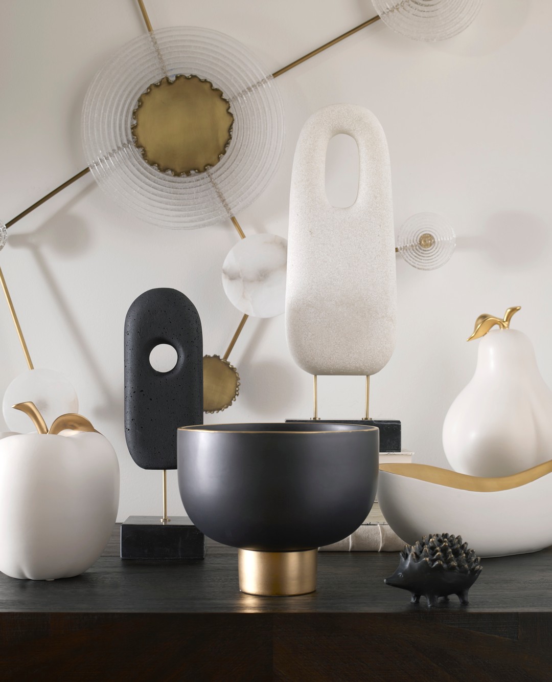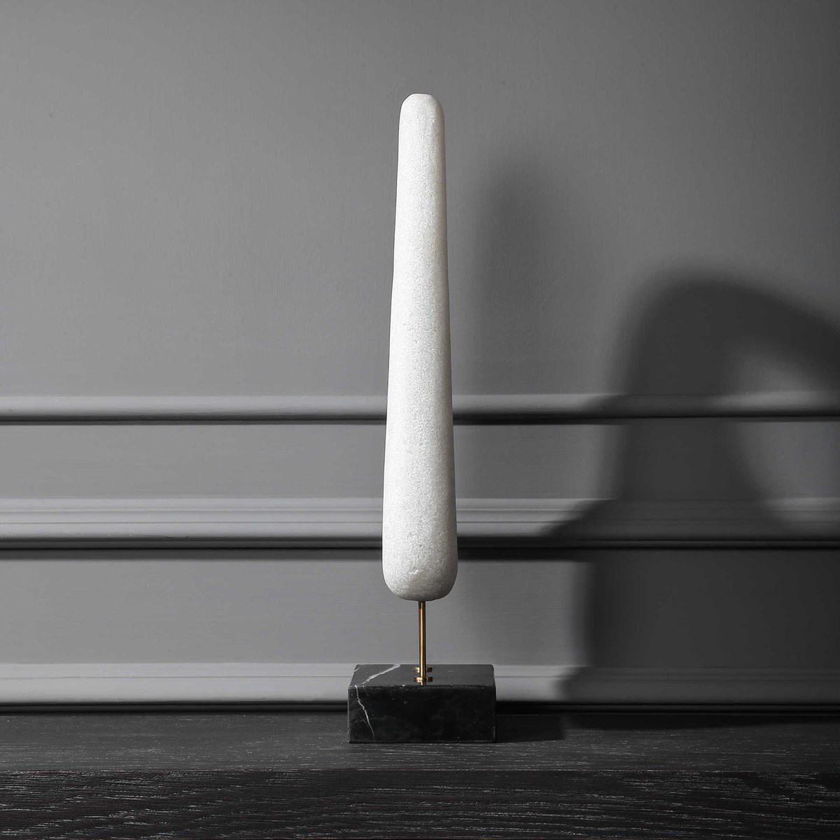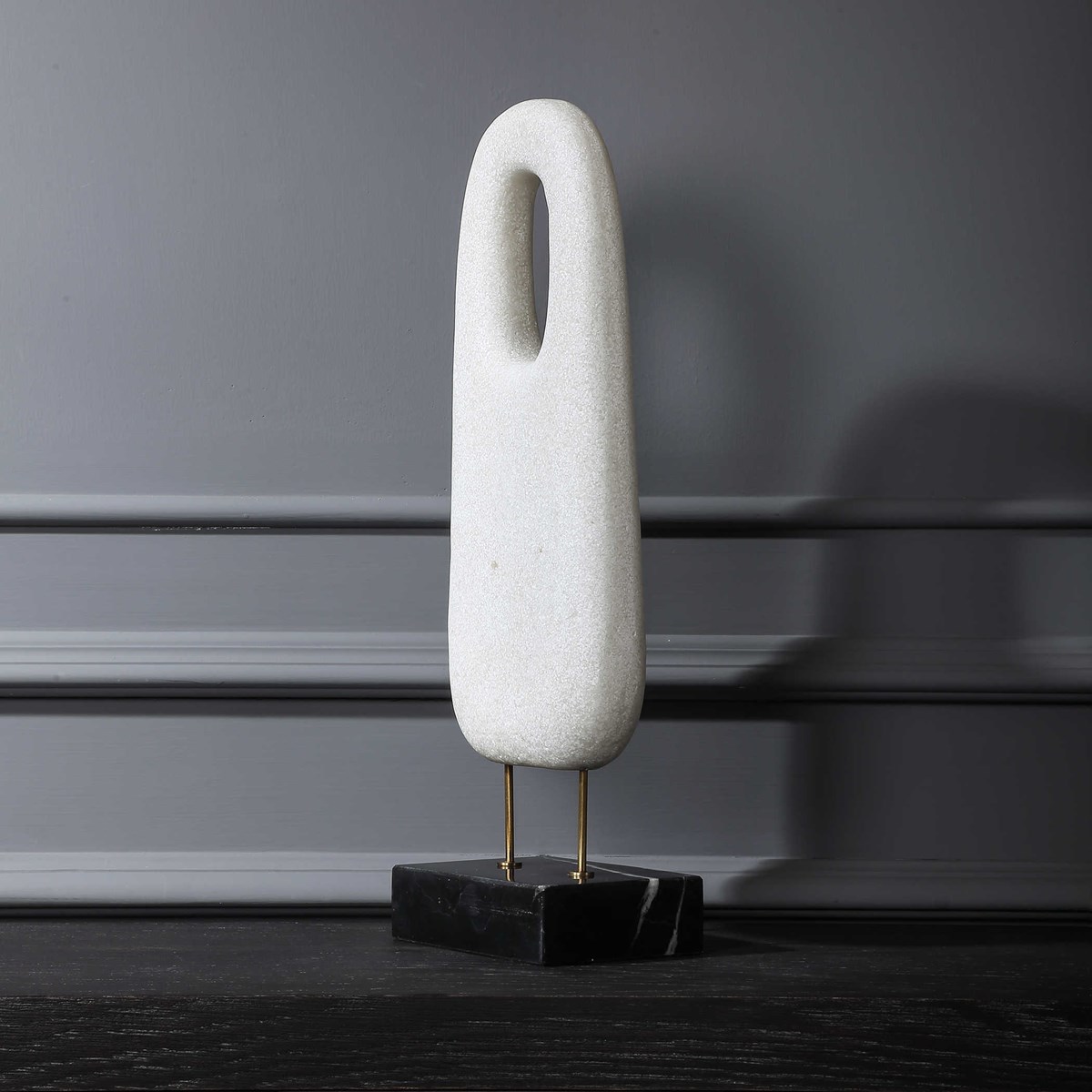 База скульптуры изготовлена из отшлифованного черного мрамора, что создает контрастный и визуально впечатляющий фон для монолитной формы. Латунные штифты, которые украшают эту скульптуру, придают ей роскошное ощущение и дополняют общий эстетический облик.