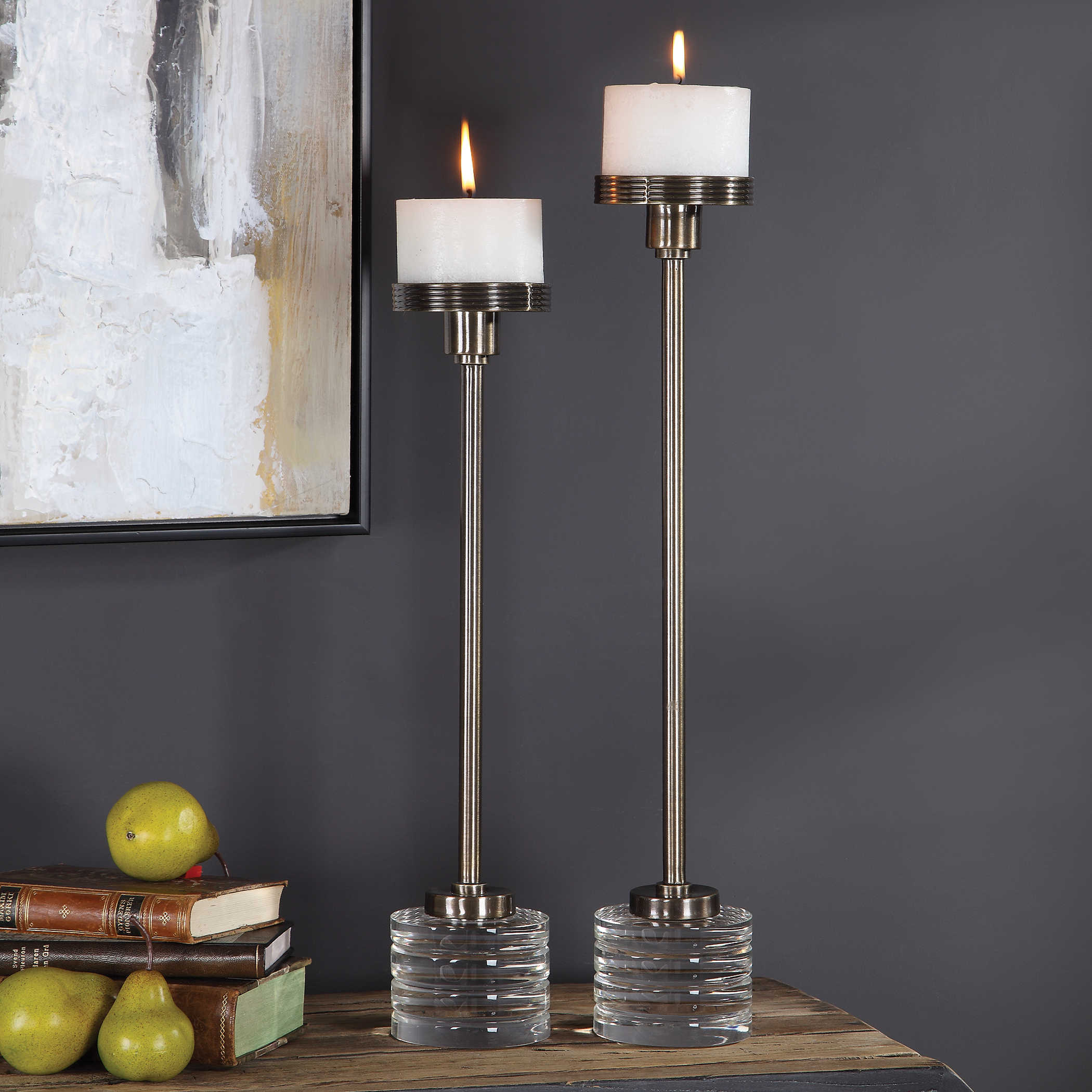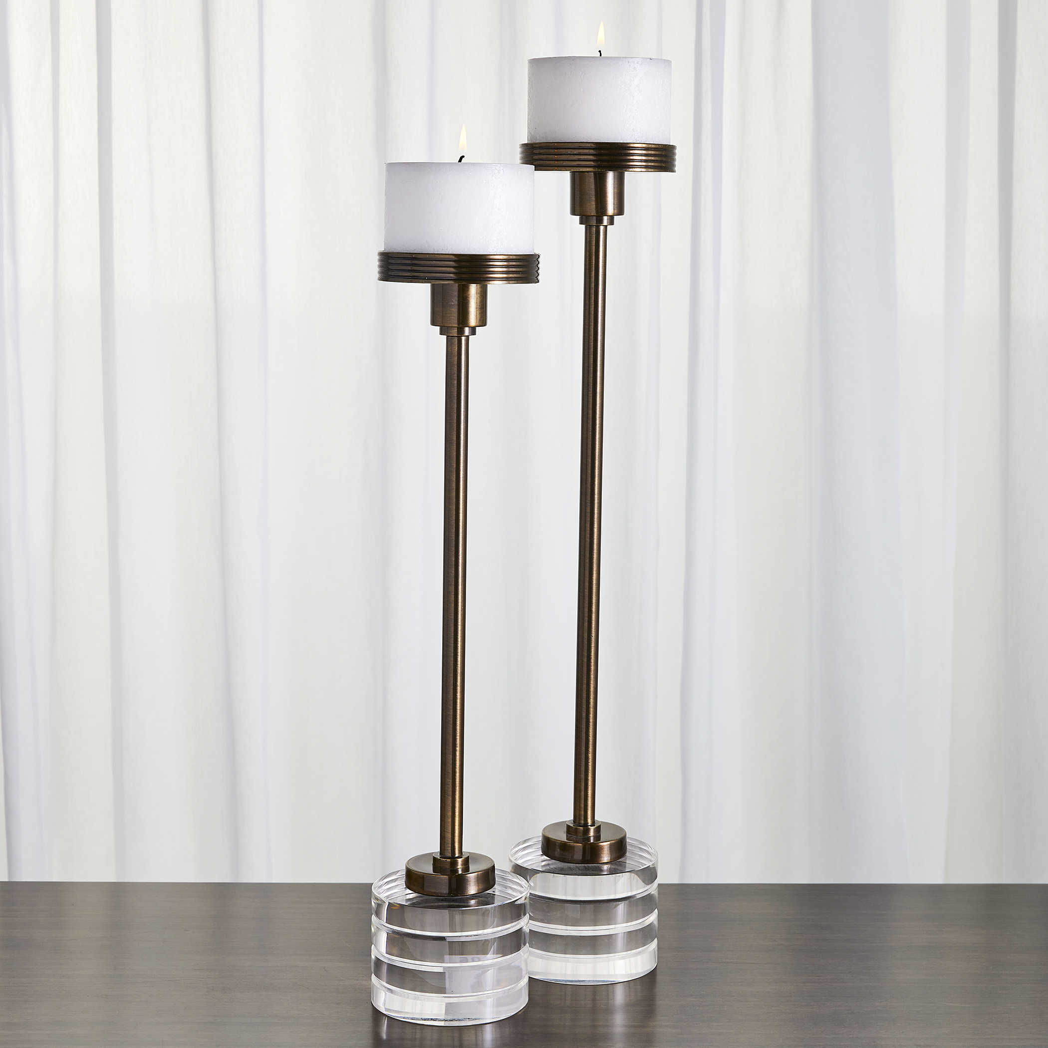 Подсвечник Lia - это символ изысканной элегантности и сдержанной роскоши, способные преобразить ваш дом в настоящий уютный уголок. Изготовленные из матовой кофейной бронзы с изысканным покрытием, эти подсвечники вдохновлены классическим стилем с современным в twist. Толстые ребристые хрустальные круглые основания придают им стойкость и благородство, а также позволяют игре света воплотить в жизнь сказочные отражения.