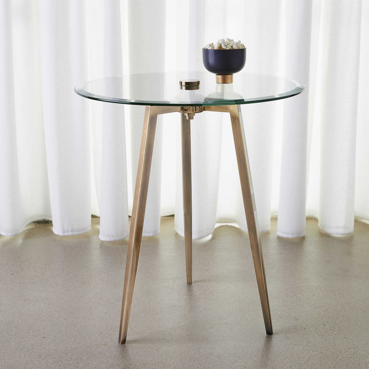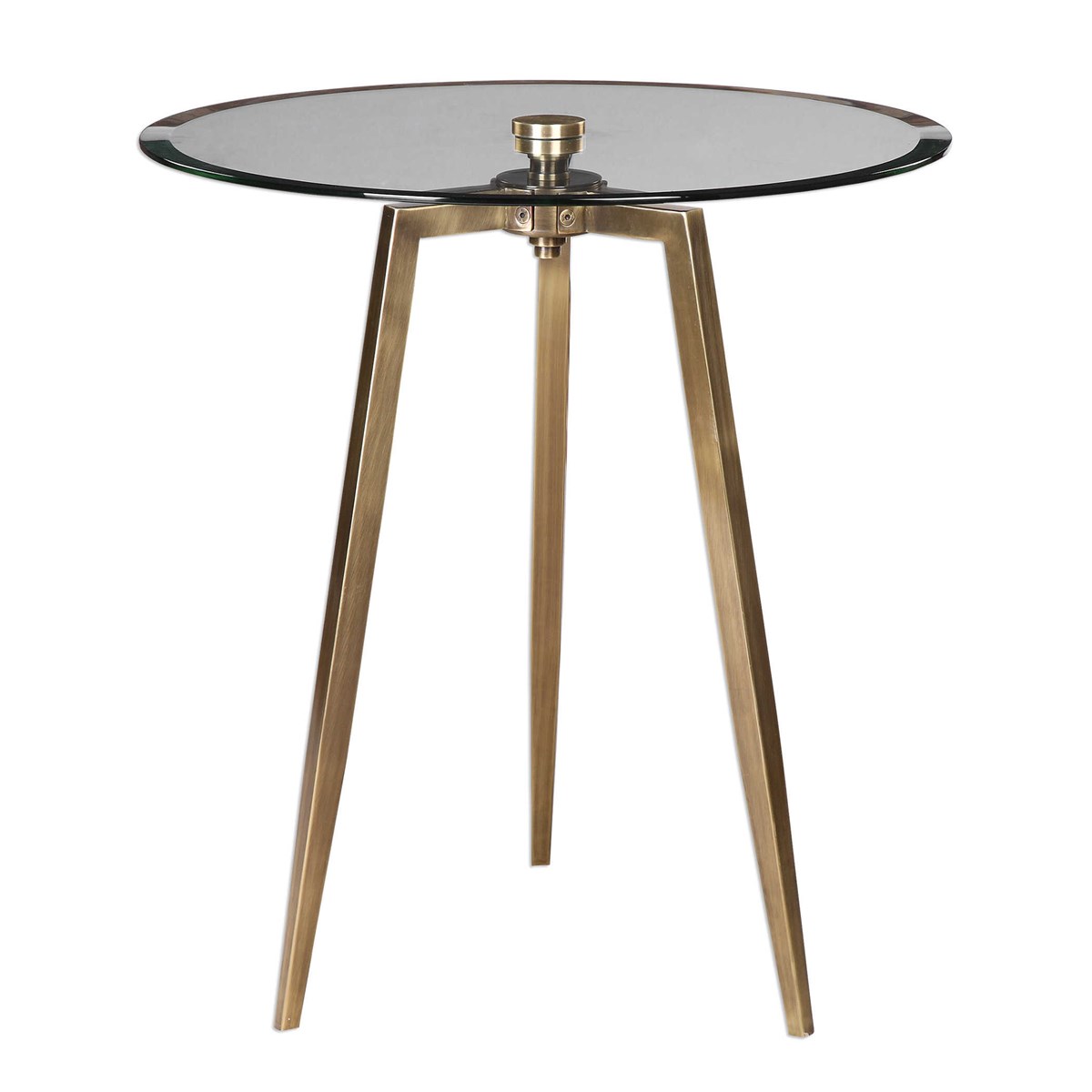 Arwen: Коническая ножка штатива из состаренной латуни с утонченной отделкой, дополняющая столешницу из закаленного прозрачного стекла. Этот элегантный и легкий стол придает вашему интерьеру ноту современной роскоши, а его компактный размер и прозрачная структура создают ощущение светлоты и воздушности. Прекрасно подходит для размещения у боковины дивана, кресла или в прихожей, этот стол обеспечивает удобное место для размещения напитков, книг или декоративных предметов.