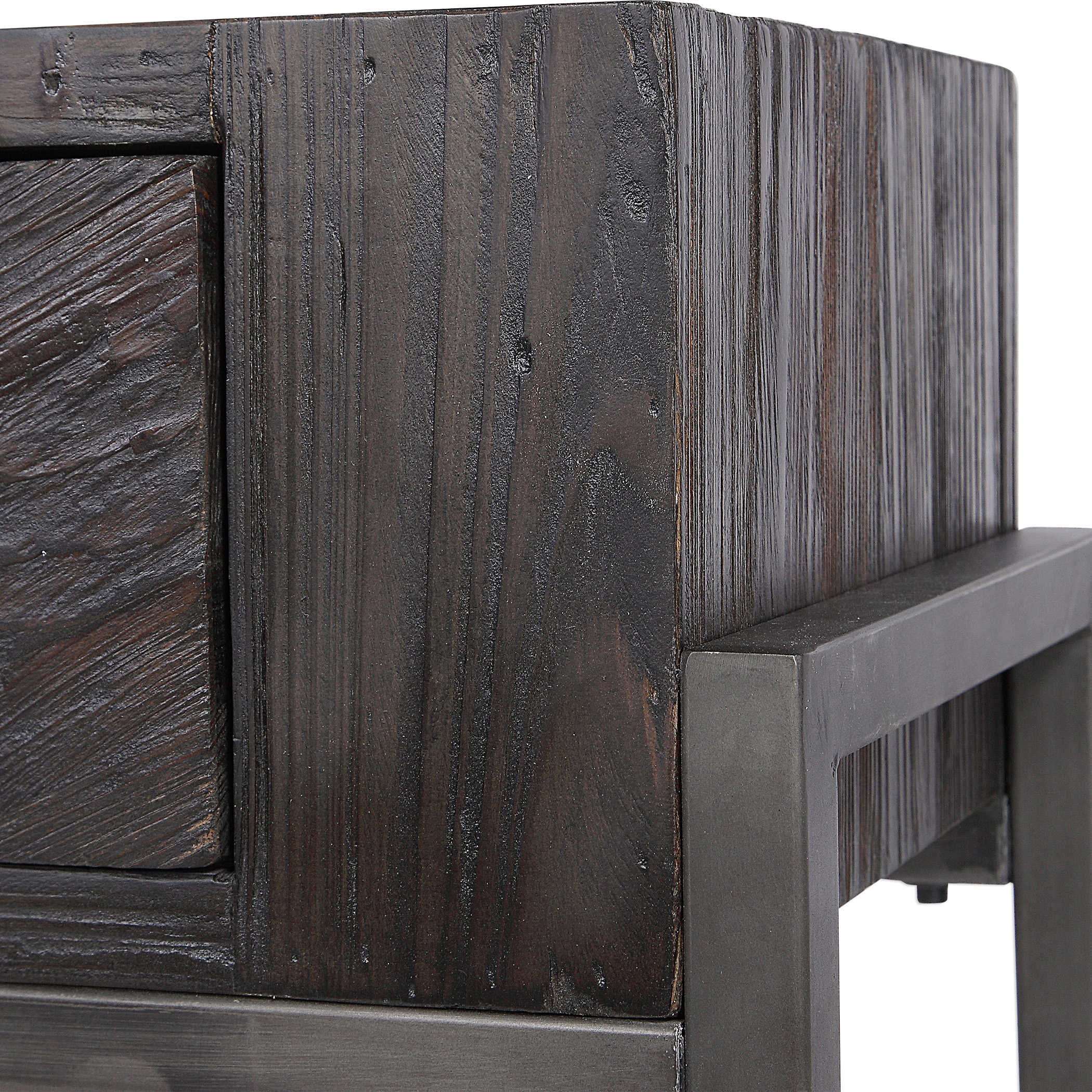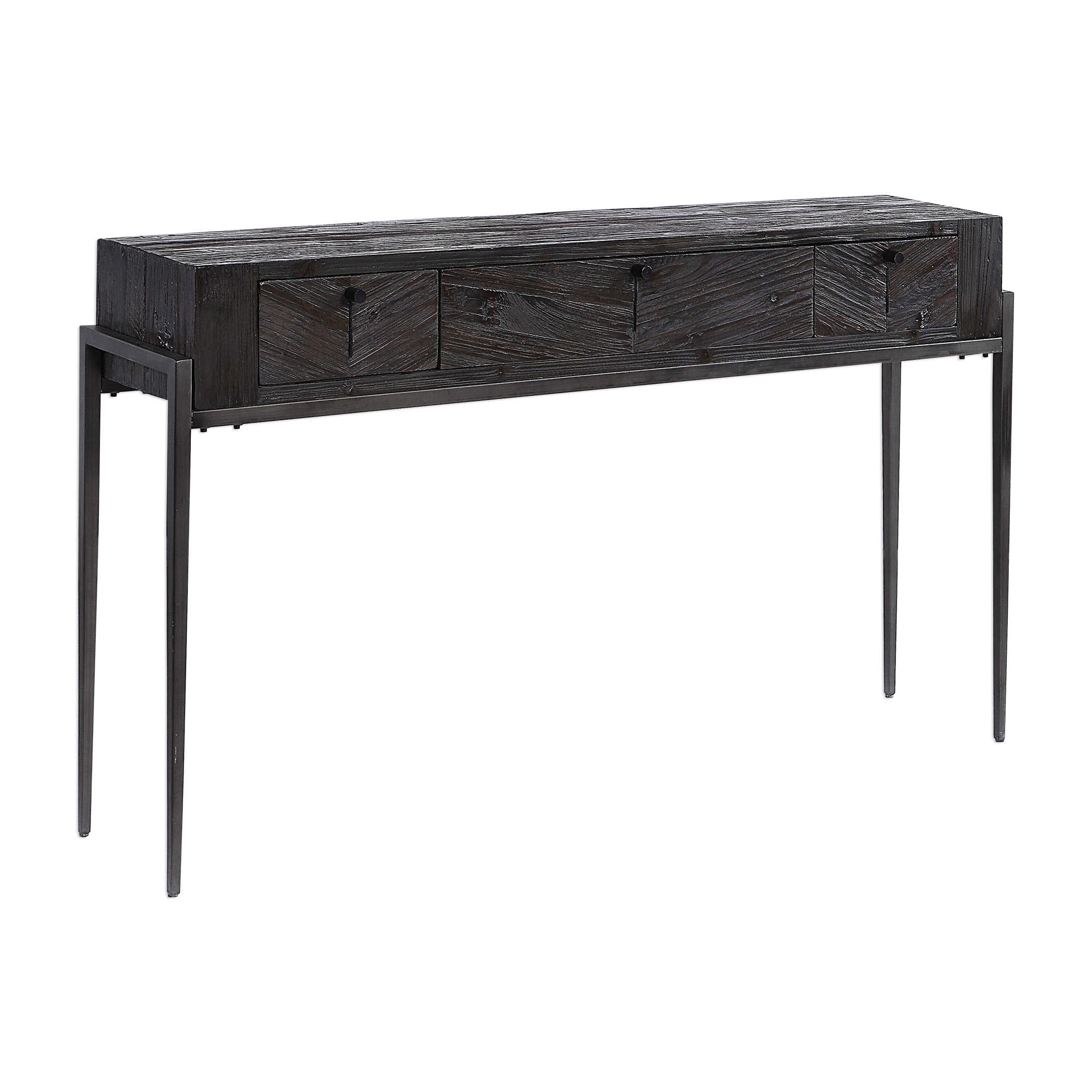 Консоль Mavis - это настоящее произведение искусства, созданное вручную из переработанной сосны с шевронным рисунком, который придаёт ей особый шарм. Отделка тёмным орехом с едва уловимым серым оттенком придаёт консоли изысканность и элегантность. Её оправа из состаренного железа добавляет промышленный шарм и уникальность.