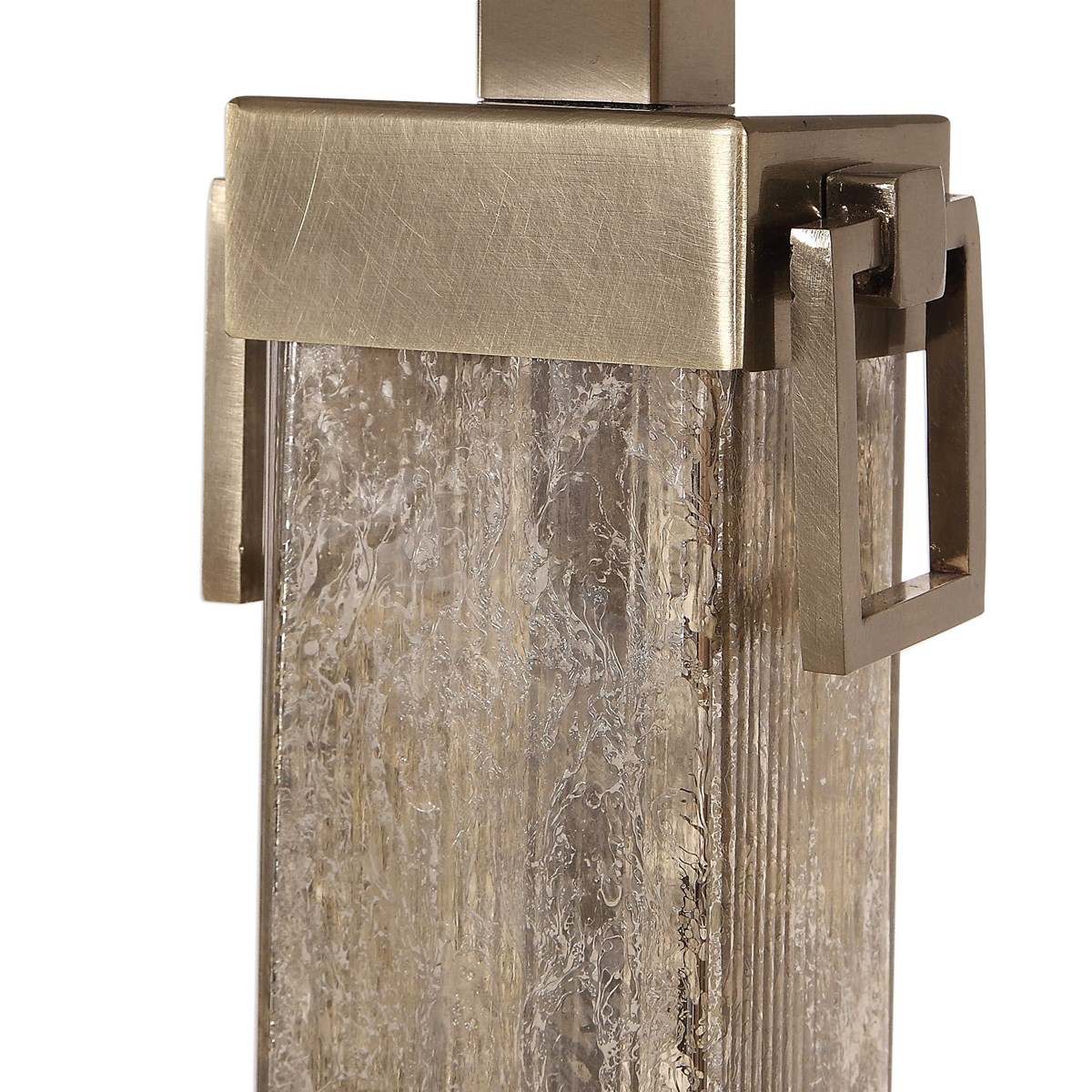 Лампа Stacia - это изящный и впечатляющий дизайн, который привлекает внимание своей элегантной комбинацией старинного ртутного стекла и декоративных стальных деталей. Тонкая колонна из стекла с желобчатой текстурой создает особую атмосферу и добавляет шарма этой настольной лампе. Декоративные стальные элементы, покрытые серебряным оттенком, придают ей изысканность и блеск.