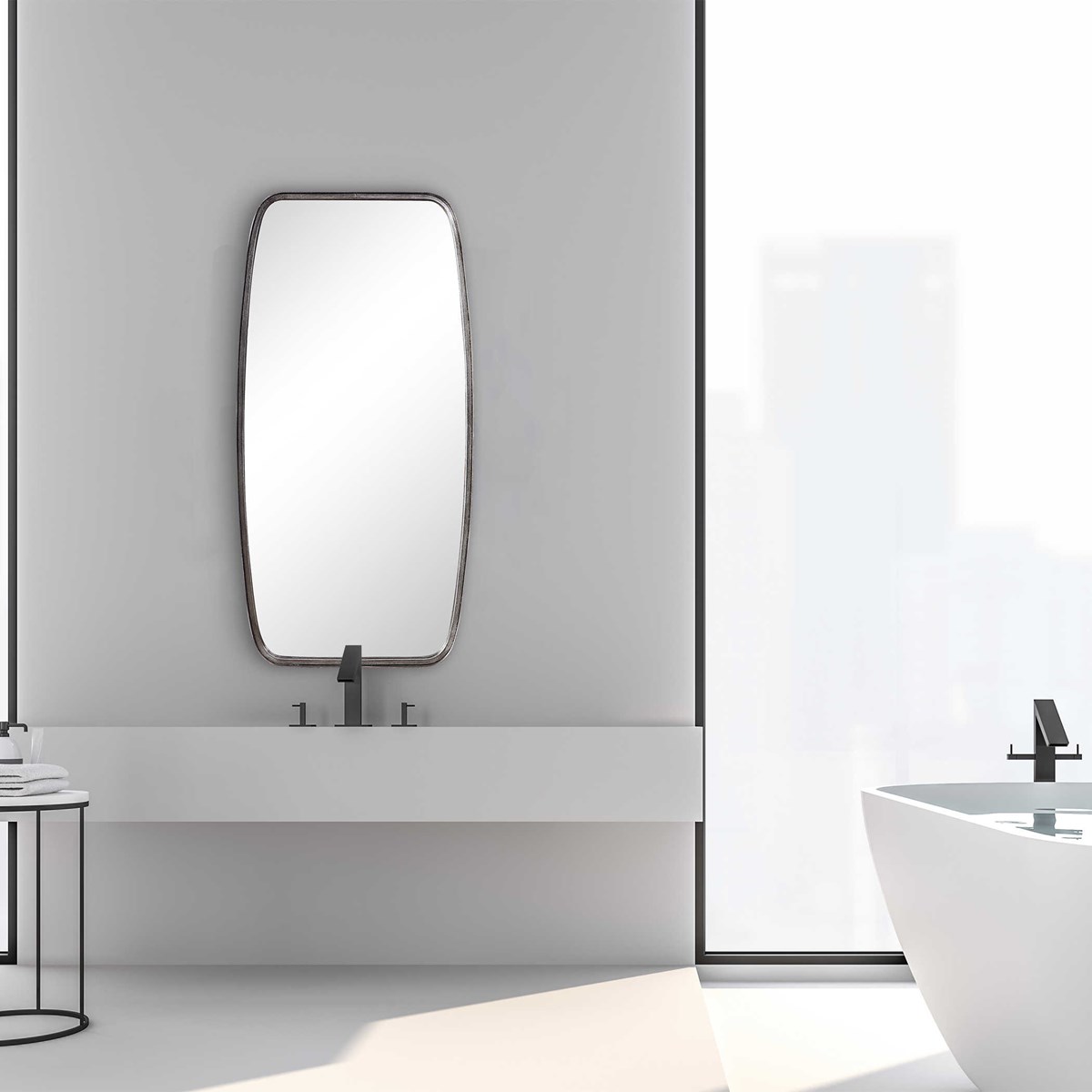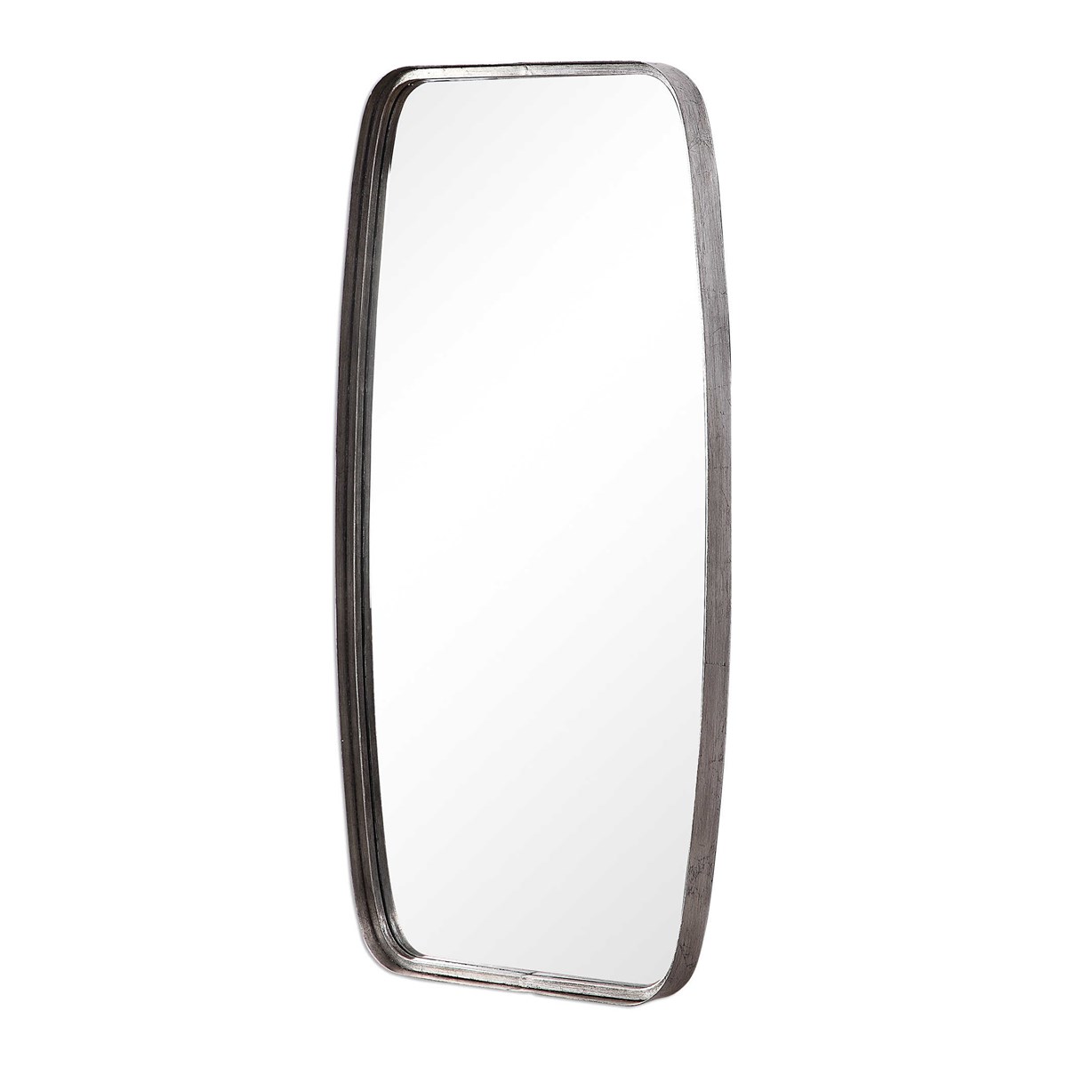 Это уникальное зеркало от американского бренда Uttermost представляет собой выдающуюся оправу с толстой металлической лентой, украшенной закругленными углами, и тонкой внутренней трубкой, окружающей зеркало. Его стиль подчеркивается античным серебряным листом, добавляя элегантности и шарма. Идеально подходит для туалетного столика или в фойе, и может быть повешено как вертикально, так и горизонтально.