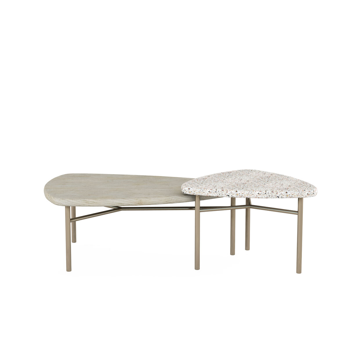 Две поверхности лучше, чем одна. В наборе раскладных журнальных столиков Cotiere сочетаются дерево и столешницы из камня терраццо, создавая винтажный стиль, который обязательно станет центральным элементом жилого пространства. Округлые формы придают столикам привлекательность и элегантность. Металлические основания с бронзовой отделкой завершают этот набор, придавая ему воздушный и открытый вид. Эти столики идеально подходят для создания уютного уголка или как функциональный акцент в современной гостиной.