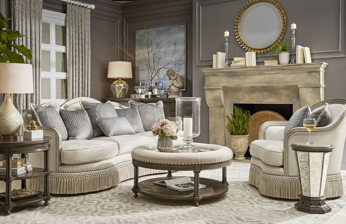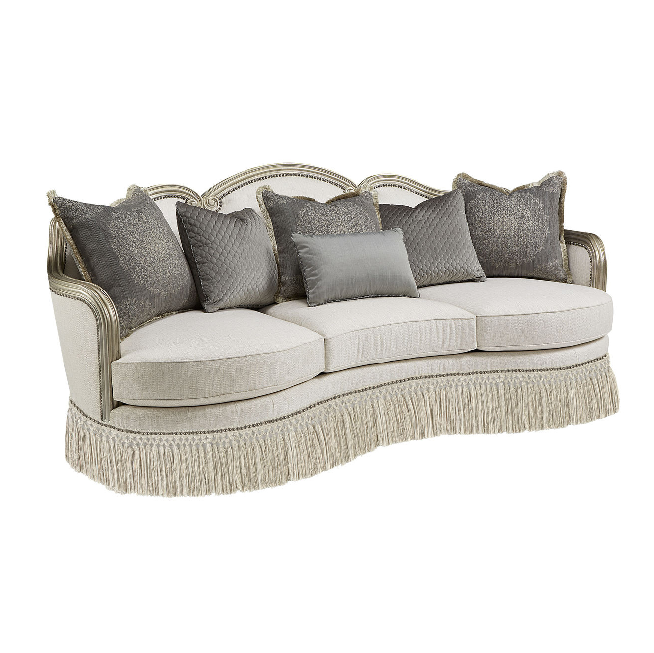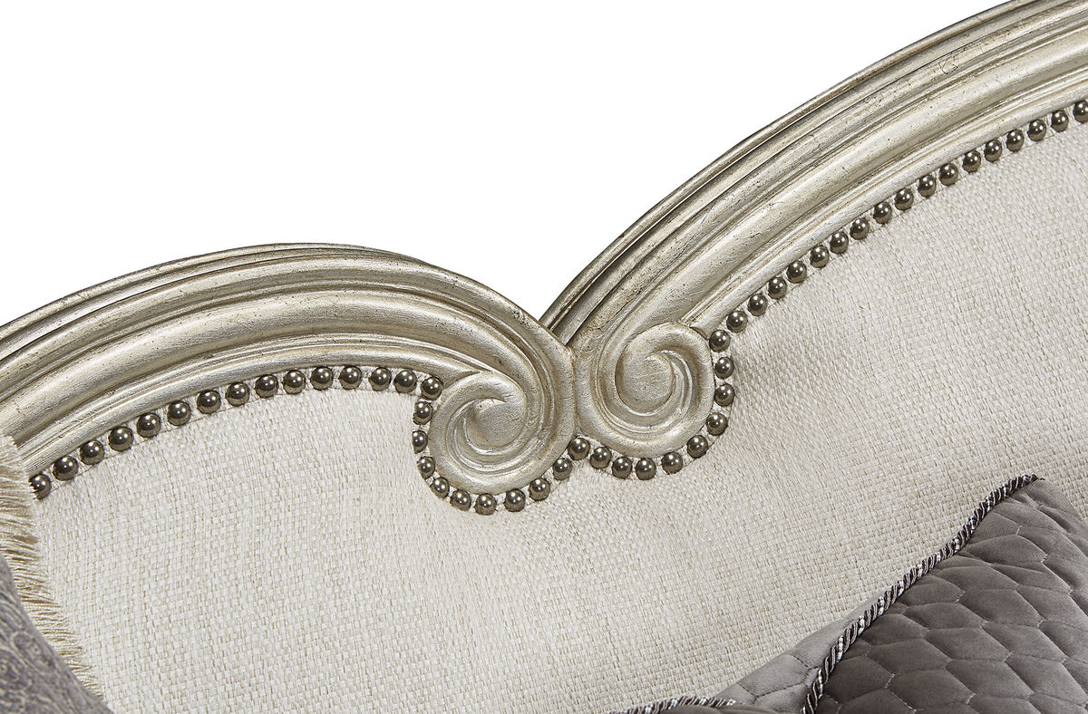 Каркас дивана выполнен из массива дерева с фактурой, подчёркнутой многослойной глэм-отделкой с серебристыми акцентами, что добавляет модели благородства. Детали, такие как изящная отделка в виде декоративных гвоздей, самодельные валики и юбка с бахромой в тон, превращают этот диван в произведение мебельного искусства.