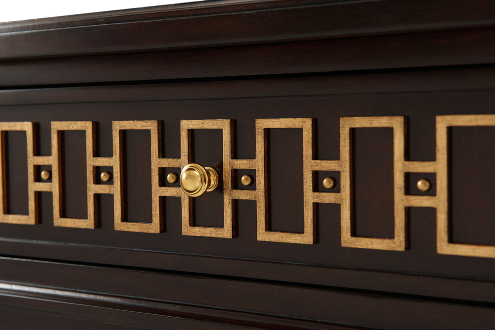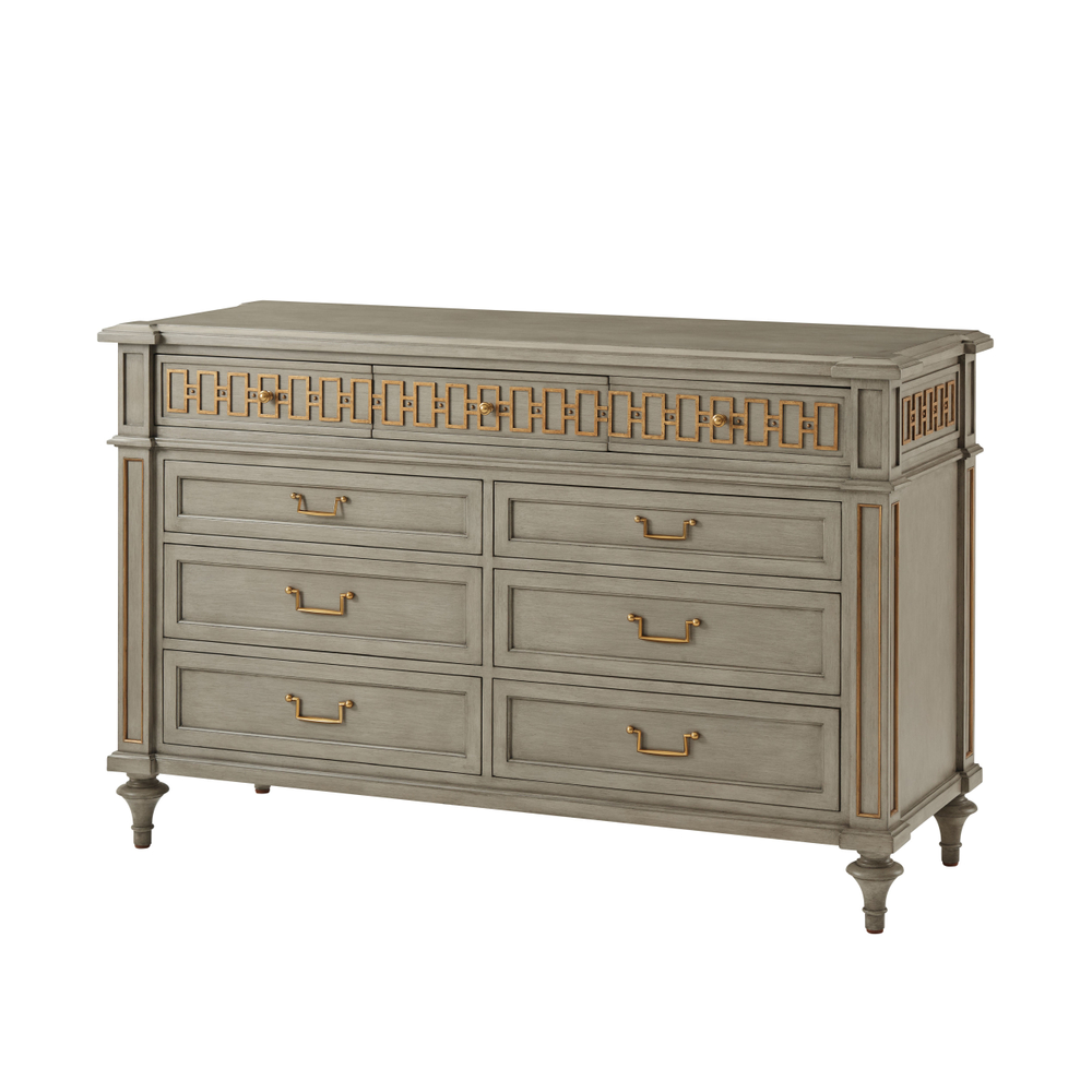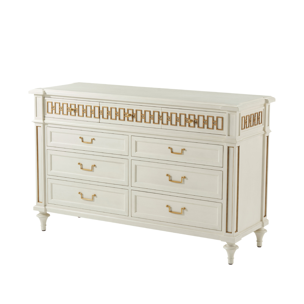Комод McCombs впечатляет элегантностью и функциональностью. Три верхних выдвижных ящика украшены рельефным фризом, а шесть просторных нижних ящиков с латунными ручками в отделке Hampton обеспечивают удобное хранение. Столешница с фаской и конические ножки придают комоду гармоничный и сбалансированный вид, подчеркивая его сдержанную утонченность.