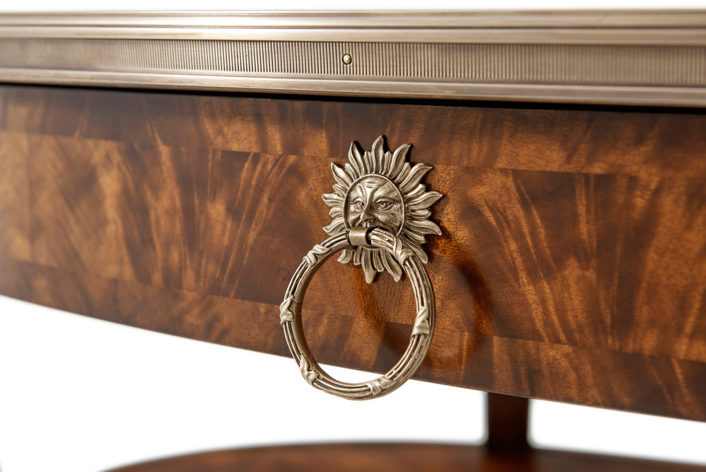 Овальный журнальный столик Around In Circles из красного дерева воплощает гармонию роскоши и утонченности. Латунный шпон на столешнице придает ему благородный блеск, а нижний ярус добавляет функциональности, предлагая дополнительное место для хранения. Четыре изящных полозья с кожаными вставками создают акцент на удобстве и стиле, а саблевидные ножки завершают образ, придавая столу неповторимый элегантный вид.