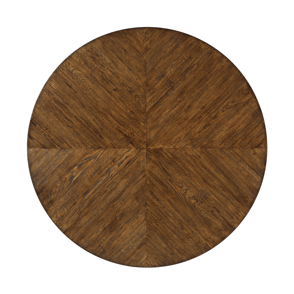 Основное внимание привлекает столешница, выполненная из дубового паркета с радиальным дизайном, что добавляет столу неповторимый характер и текстуру. Кроме того, его коническая ножка придает ему классический вид и устойчивость.