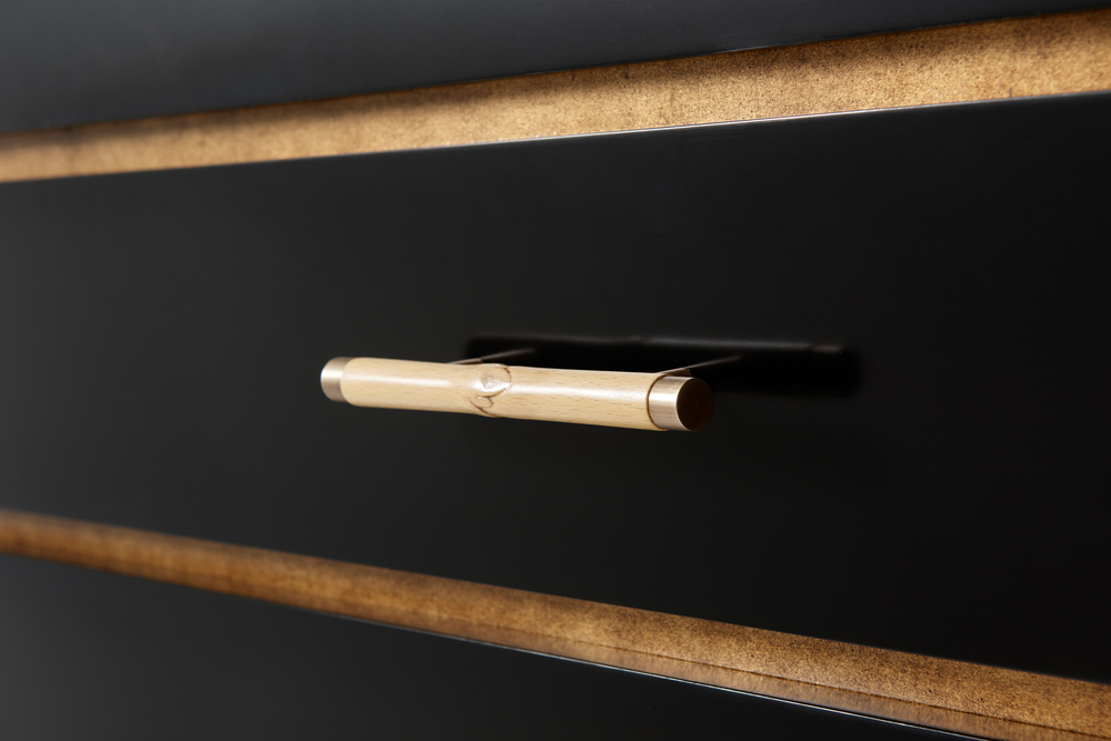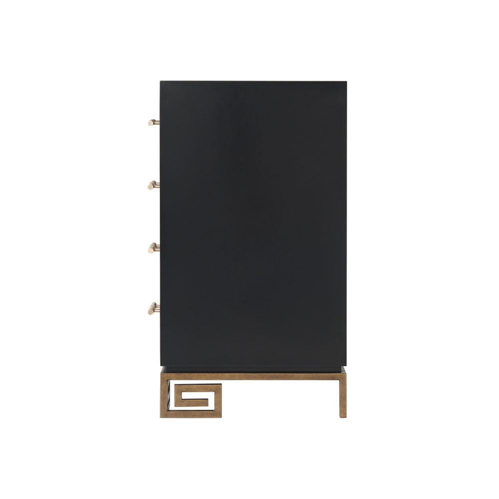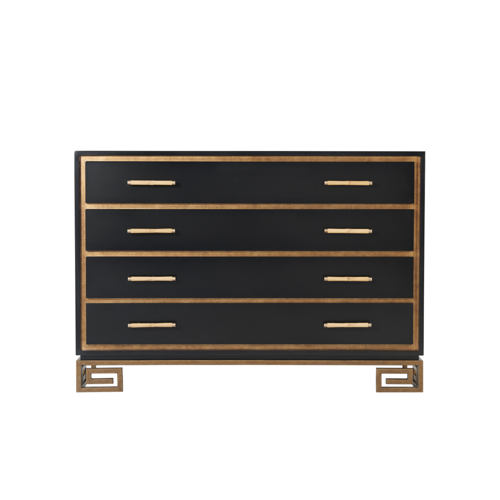 Комод Inky представляет собой стильное сочетание элегантности и функциональности. Окрашенный в глубокий черный цвет и украшенный позолотой, он привлекает внимание прямоугольной столешницей, установленной над четырьмя выдвижными ящиками, обрамленными позолоченной рамкой. Ручки в виде бамбуковых стеблей и латунные акценты добавляют изысканные детали. Комод установлен на старинной позолоченной стальной подставке с греческим ключом, что подчеркивает его уникальный дизайн. В комплект входит набор для защиты от опрокидывания, а также бегунки для ящиков с плавным закрыванием, обеспечивающие комфорт и безопасность в использовании.