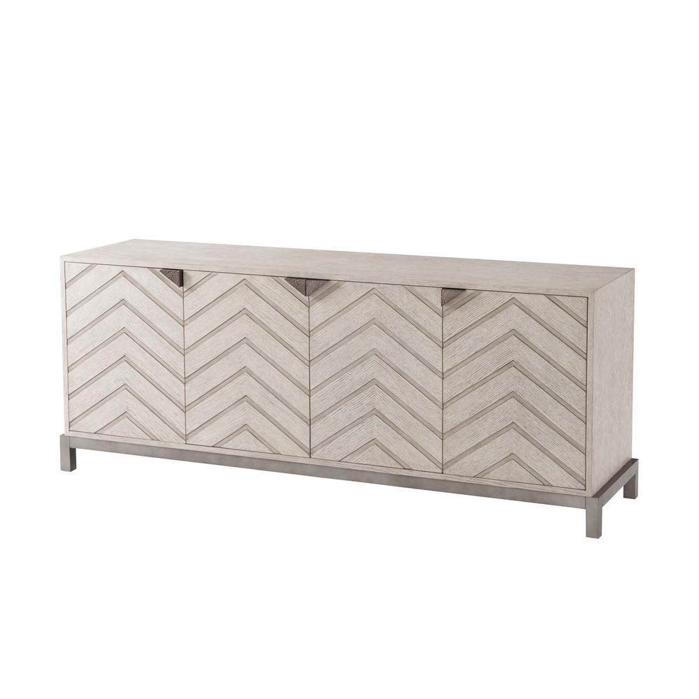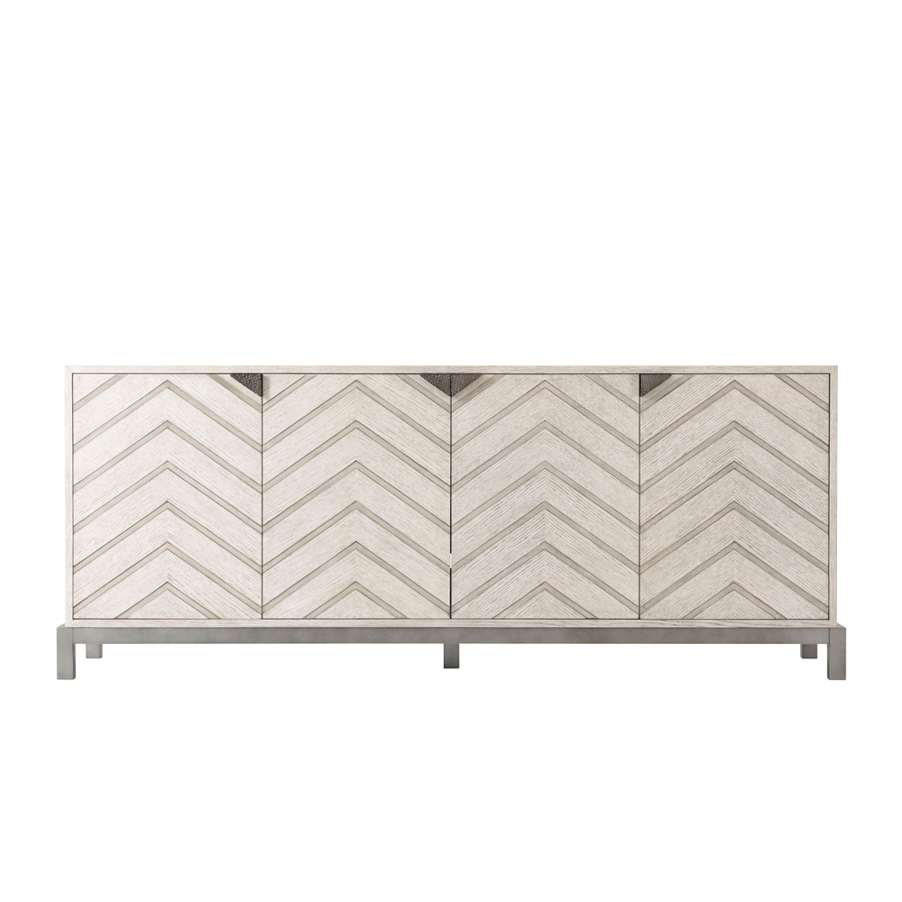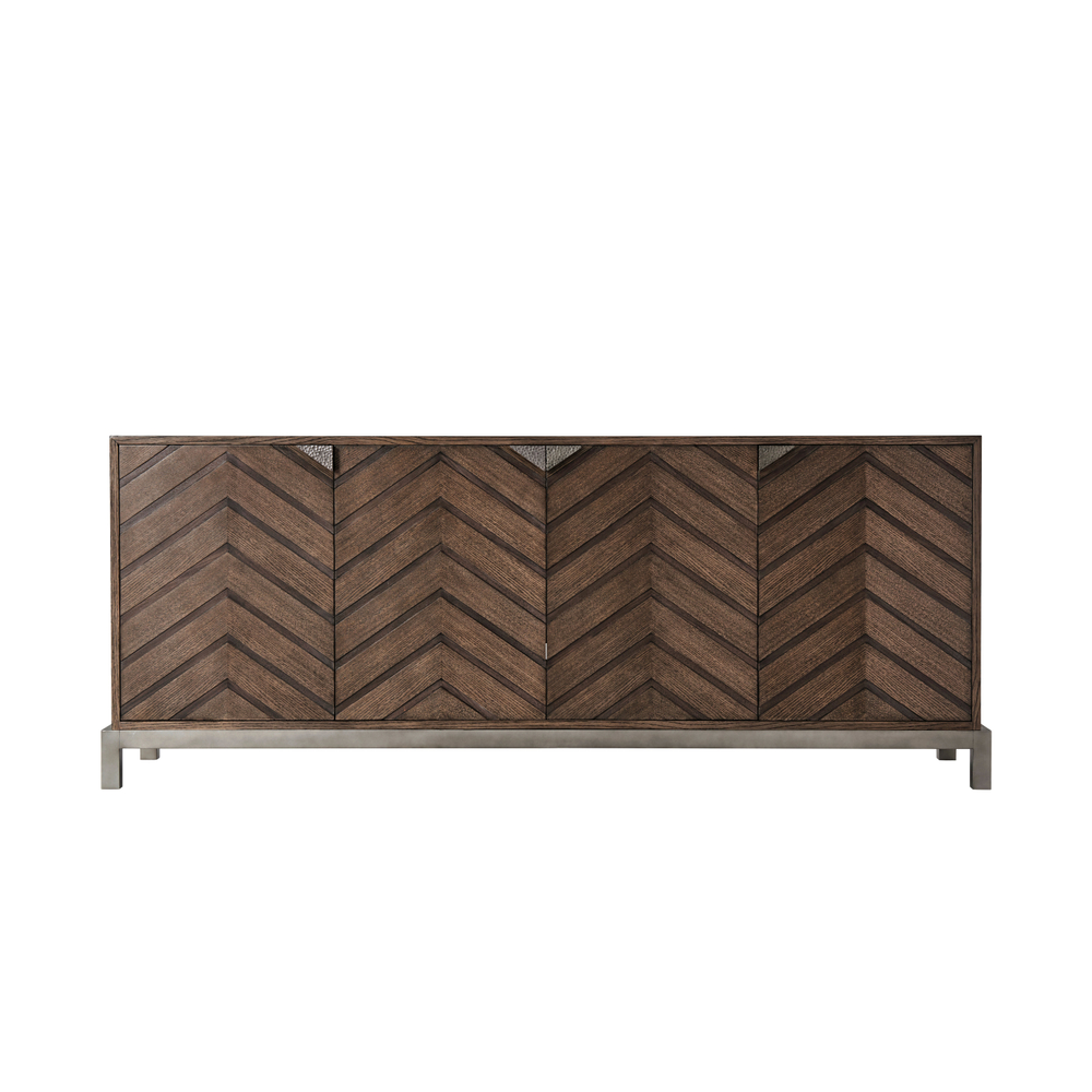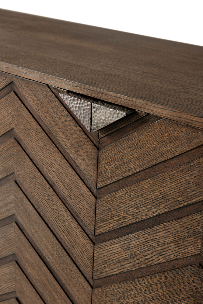 Телевизионная тумба Leonardo - это превосходное сочетание качественных материалов и утонченного дизайна. Ее прямоугольная столешница выполнена из шпона дуба, придавая ей природный и теплый вид. Четыре двери тумбы украшены рельефными панелями в стиле Chevron, что придает ей изысканный характер.