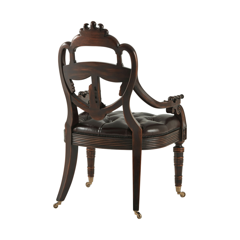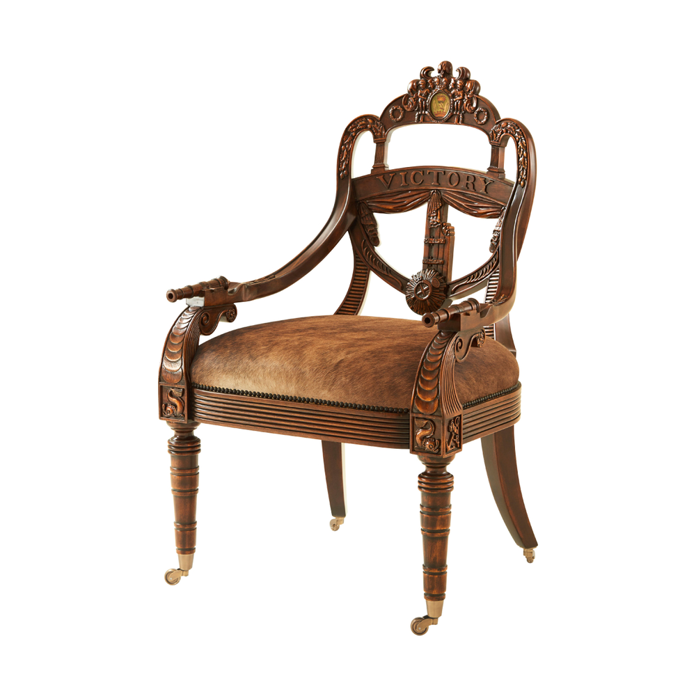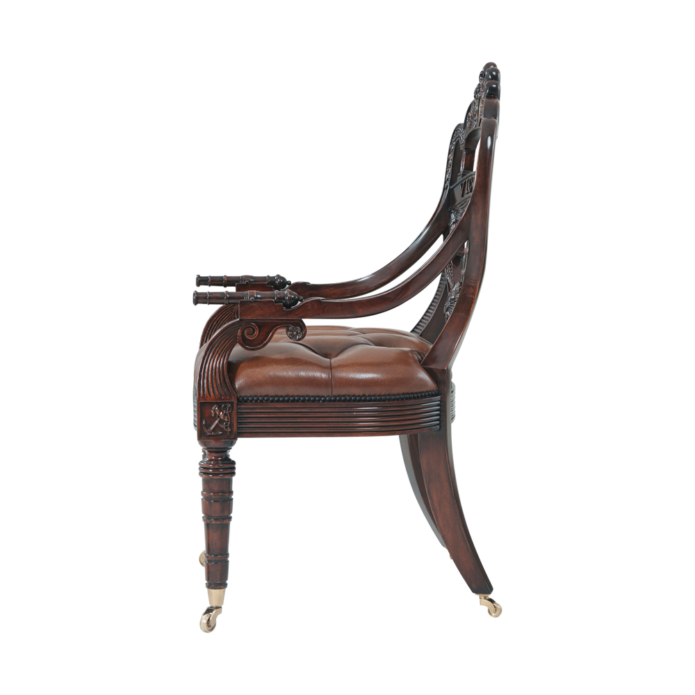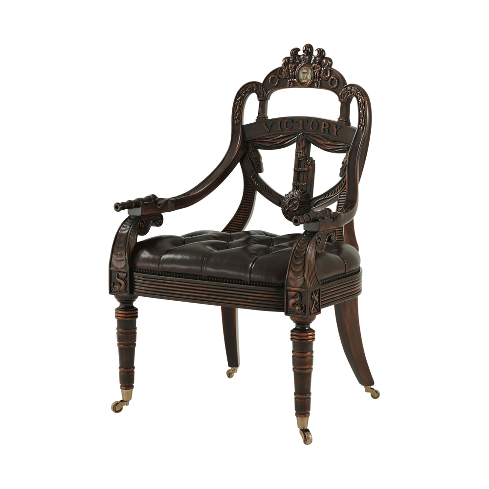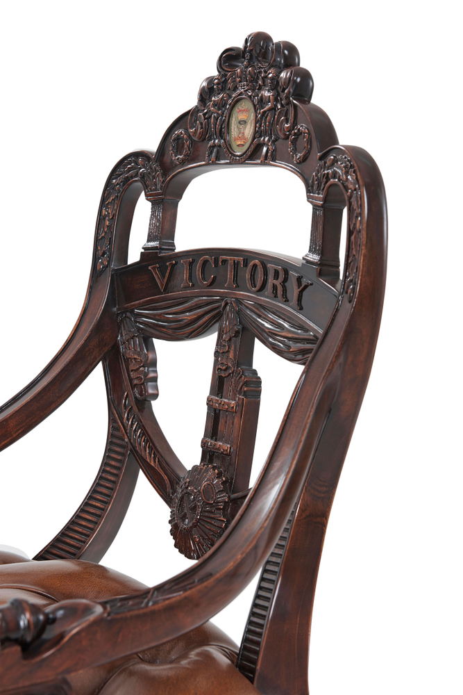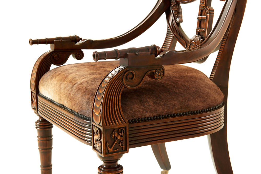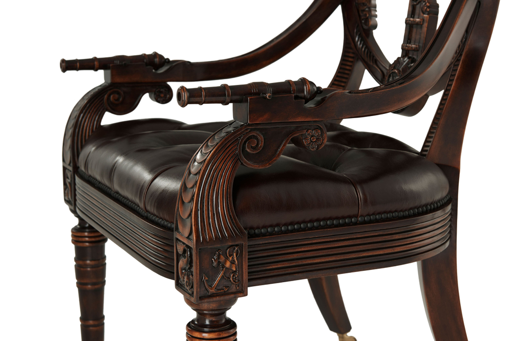 Этот библиотечный стул, созданный вручную из красного дерева, вдохновлен морской тематикой и носит в себе дух истории. Спинка стула вырезана в форме транца корабля, что придает ему уникальный и запоминающийся внешний вид. На центральном месте расположен герб Спенсера, окруженный символами Победы и венками, что подчеркивает его благородное происхождение.