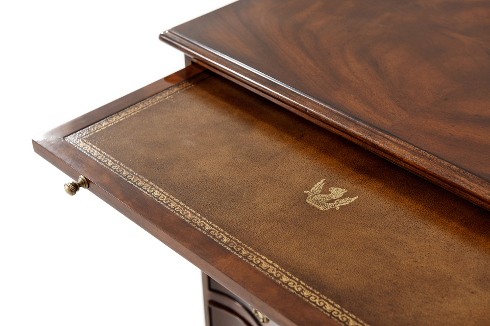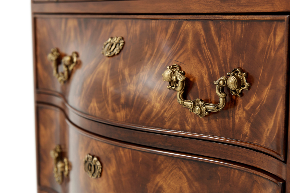 Этот прикроватный комод в стиле бомбэ, изготовленный из шпона красного дерева и массива красного дерева, впечатляет своим изяществом. Его верхняя часть имеет прямоугольный формованный край, который дополняется полкой для щеток. Ниже вы найдете три фигурных змеевидных ящика, которые украшены тонколитыми латунными накладками и откидными ручками для легкости использования.
