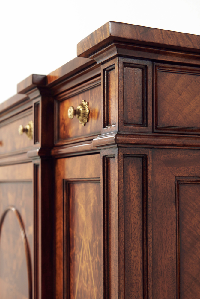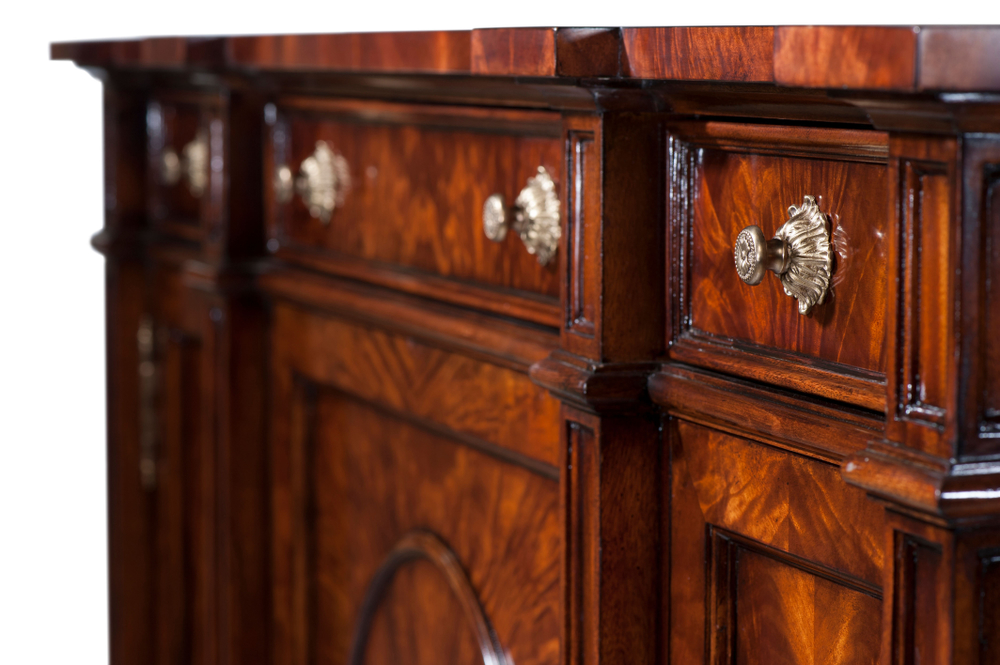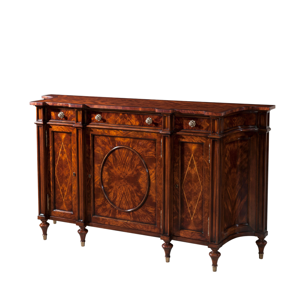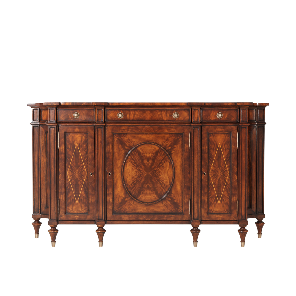 Изящный буфет Concave из красного дерева, украшенный шпоном пламени и капом, демонстрирует элегантный дизайн с тремя выдвижными ящиками с фризом, размещенными над овальными дверцами с изысканной инкрустацией в виде ромбов. За дверцами скрываются регулируемые полки, обеспечивающие практичное хранение. Вогнутые боковые стороны и витые ножки с латунными накладками придают буфету особую утонченность и стиль.