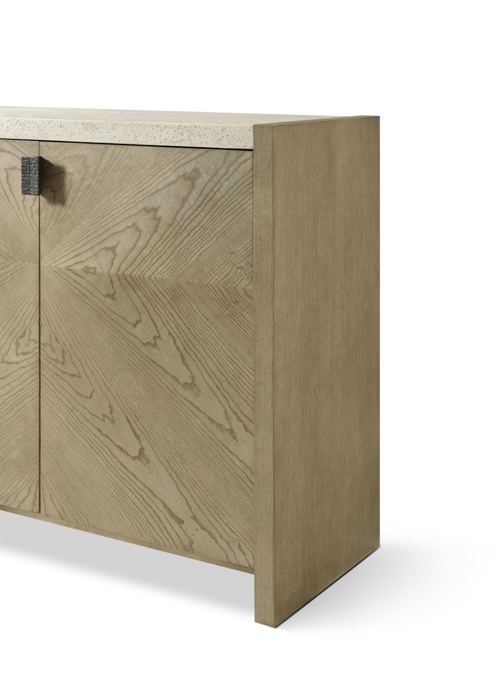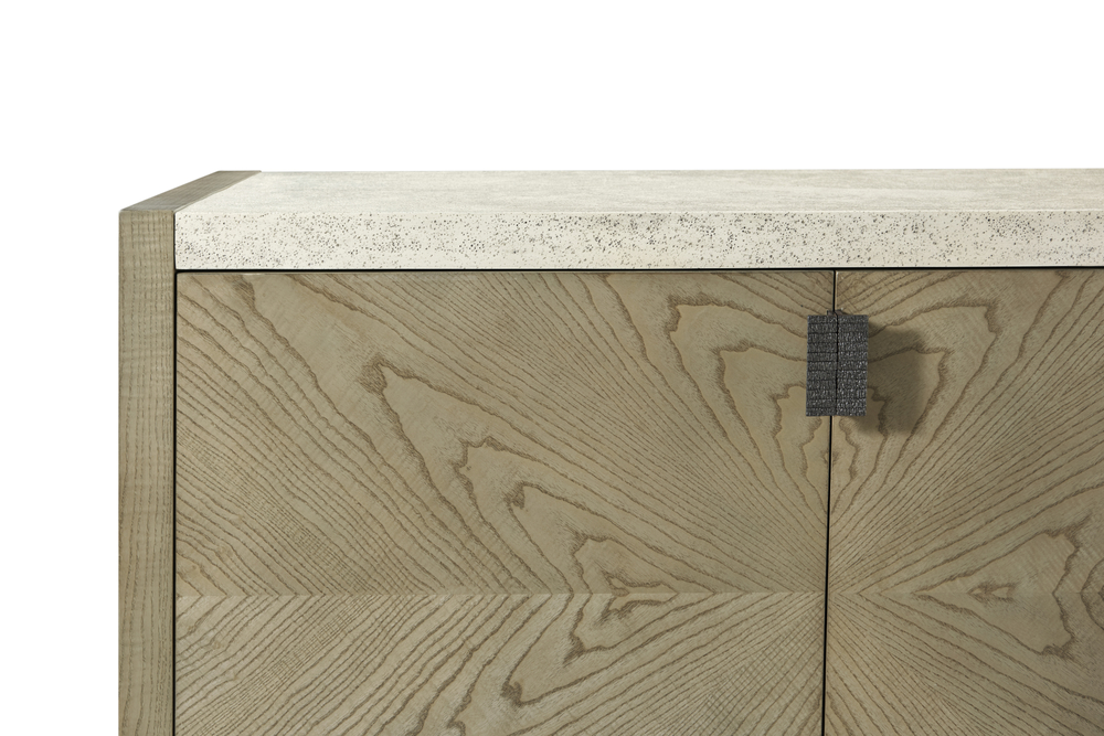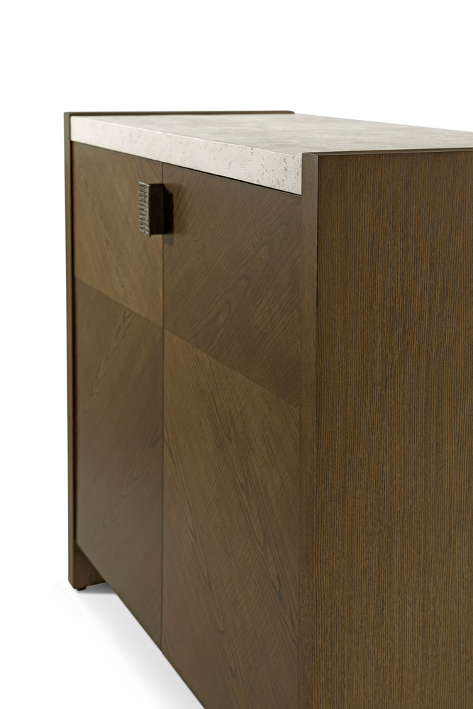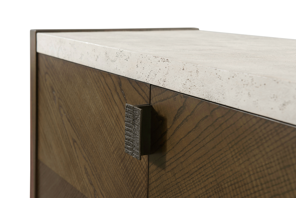 Шкаф Catalina поставляется с текстурированными металлическими вставками в новой отделке Ember, которая добавляет уникальность и эстетическую привлекательность. Пористая поверхность, похожая на камень, в эксклюзивной отделке Mineral придает шкафу особый шарм и создает впечатление изысканной природной красоты.