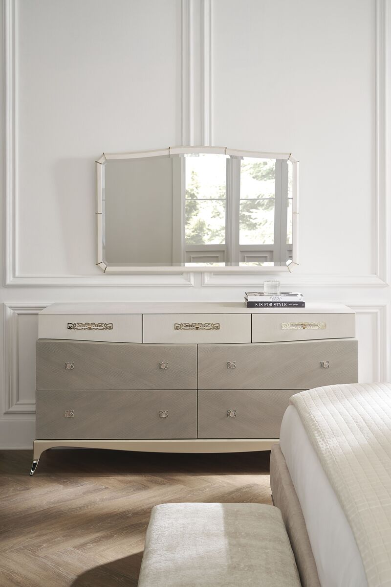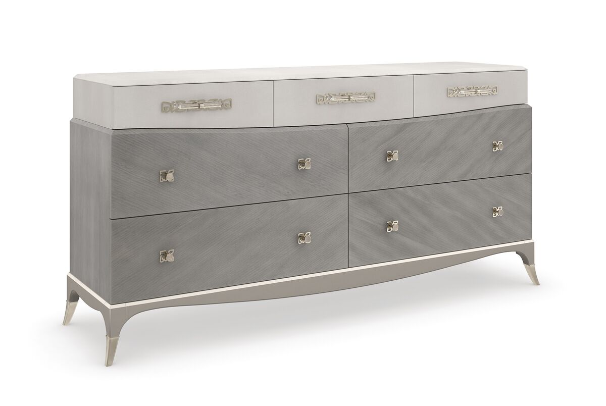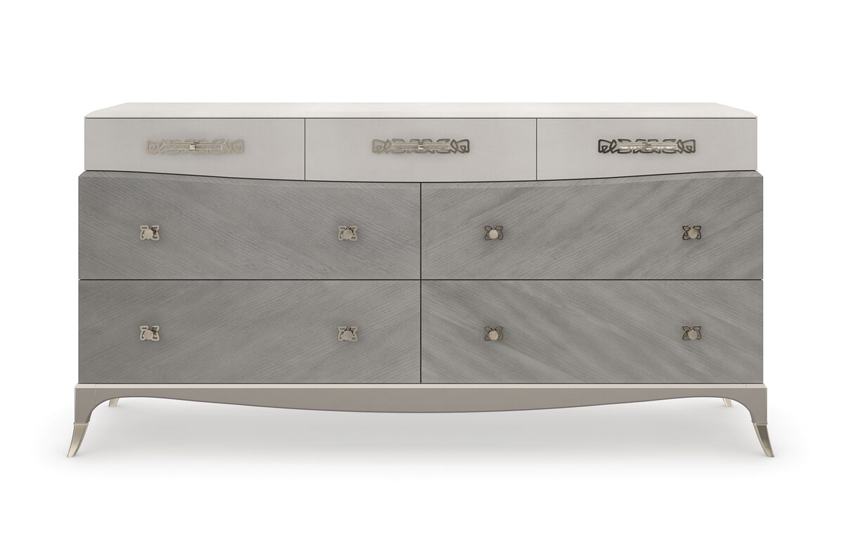 Комод Tempo имеет драматически очерченный верхний ящик, покрытый искусственной шагренью, и окрашенный в цвет алебастра. Он воплощает искусство украшения в современной форме. Кремовая отделка Cappuccino подчеркивает линейную зернистость шпона Coffee Platano, который дополнен декоративными задними панелями цвета шампань и фурнитурой с керамической вставкой. Наружные ножки изогнуты наружу и увенчаны металлическими обоймами, имитируя мягкие ниспадающие волны вдоль верхнего и нижнего перил.