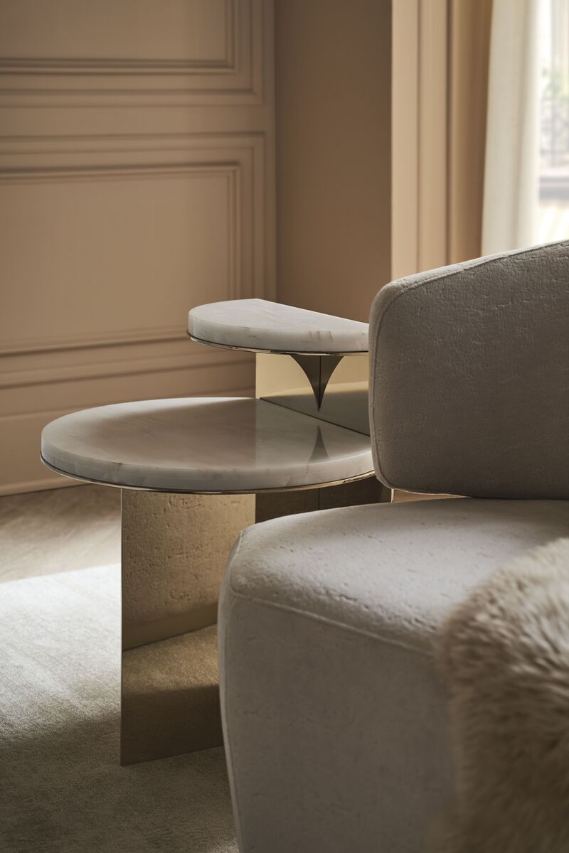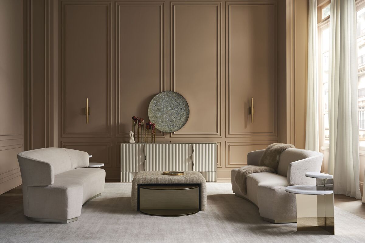 Простой, но впечатляющий диван Olympia в стиле Klismos обладает длинной и низкой изогнутой спинкой, размещенной на узком сиденье с четко обрезанными краями. Поддерживаемый деревянным цоколем с отделкой Sparkling Argent, его гладкий силуэт в оттенке слоновой кости создает впечатление, будто он вырезан из камня.