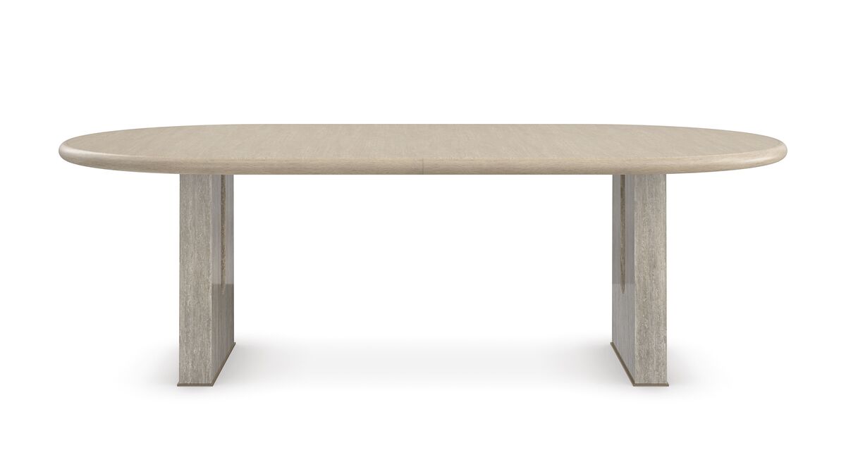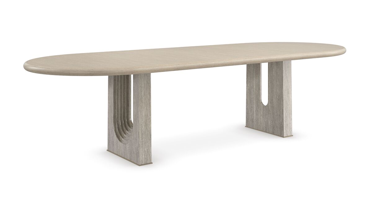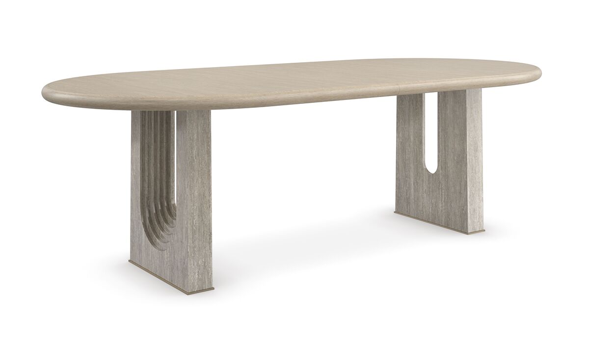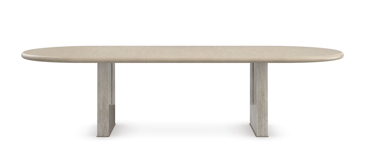 Обеденный стол Emphasis с расширенной столешницей выделяется благодаря изысканным деталям, призванным привлечь внимание и подчеркнуть  уникальность. Элегантная овальная столешница из дуба, искусно обработанного солнцем, создает пространство, достаточное для комфортного уединения гостей. Неотразимыми особенностями этого стола являются ножки в стиле парсуны с резко расширяющимися арками, тщательно выделанные из камня Silver Travertine и дополненные отделкой металлом Lucent Bronze Metallic.