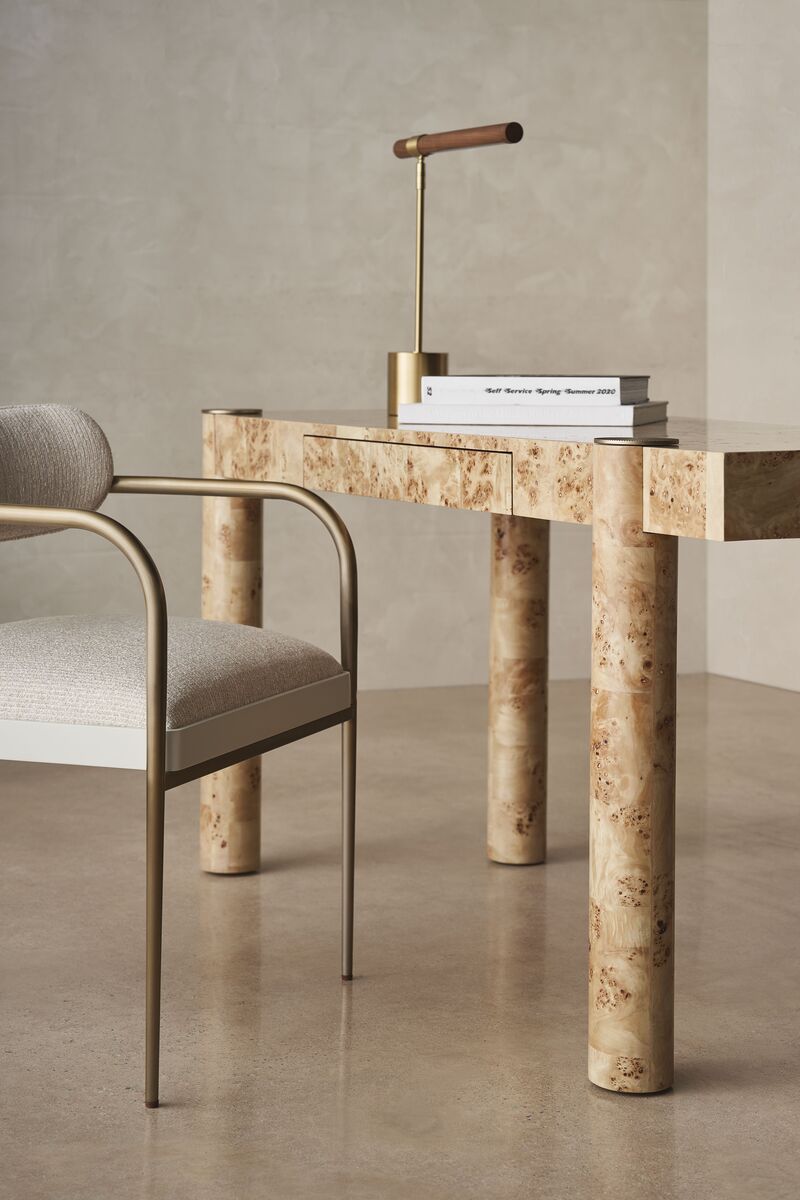 Письменный стол Rhythm – идеальное сочетание современной элегантности и функциональности. Необычная красота фанеры Mappa Burl, выдвижной ящик с шоколадной отделкой и мягкие закругленные ножки из металла Lucent Bronze Metallic создают роскошный и уникальный образ. Rhythm станет ярким акцентом в кабинете, спальне или гардеробной и может использоваться как туалетный столик.