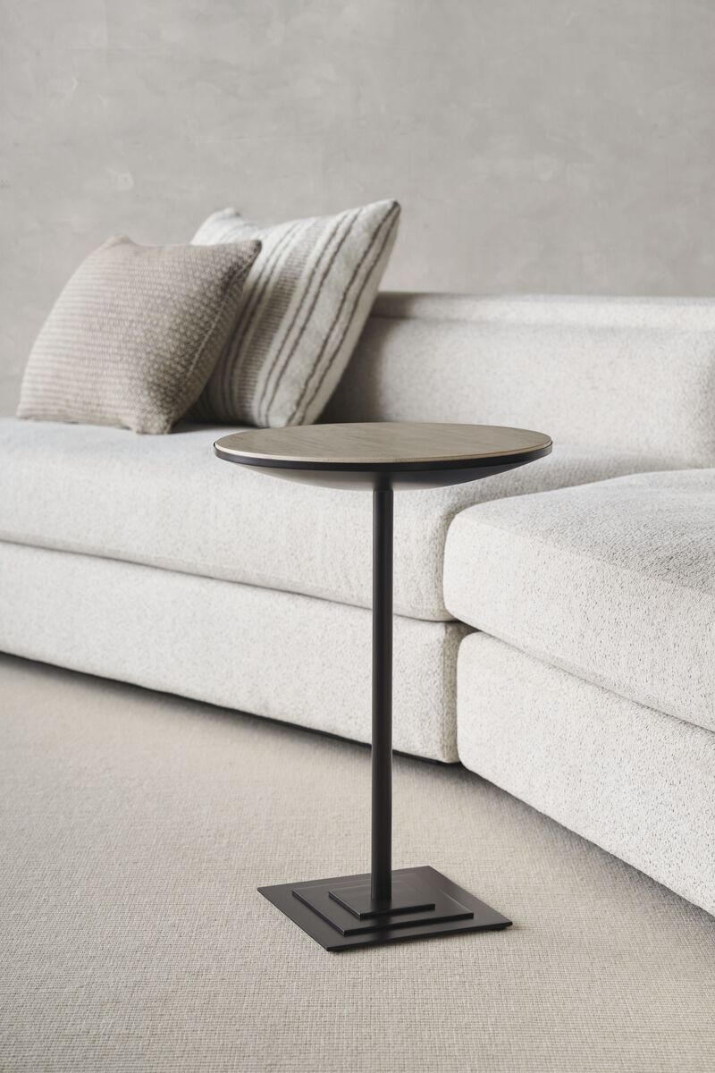 Минималистичный боковой столик Contrast – элегантное решение для интерьера. Простая форма, использование негативного пространства и контраст материалов создают стильный и современный образ. Столик изготовлен из высококачественных материалов: тонкое основание из металла цвета шоколадной бронзы и роскошная столешница из камня Cre`me Travertine.
