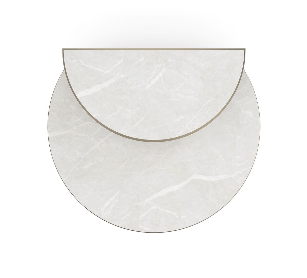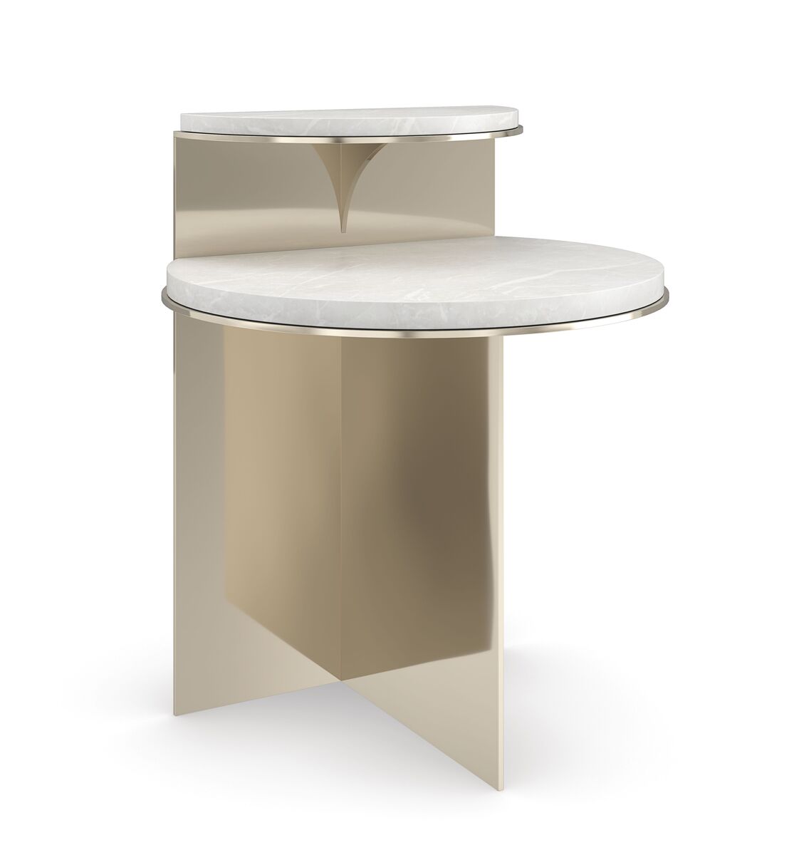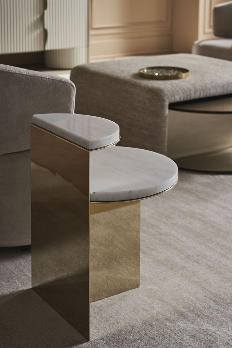Простой, но элегантный, с акцентом на функциональность, боковой столик Touche' Light добавляет глубину и отражение в зону отдыха. Два яруса белого камня Rhino на угловатом металлическом основании с золотистой отделкой – это не просто столик, это произведение искусства.