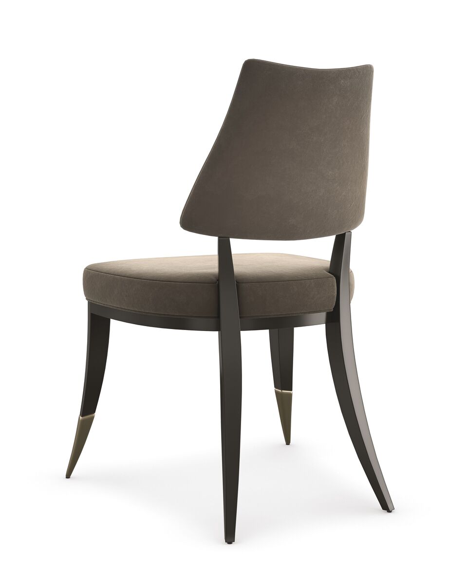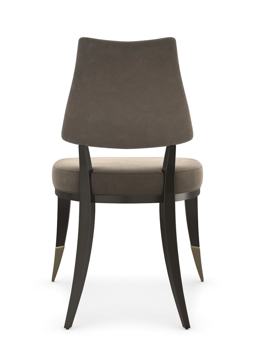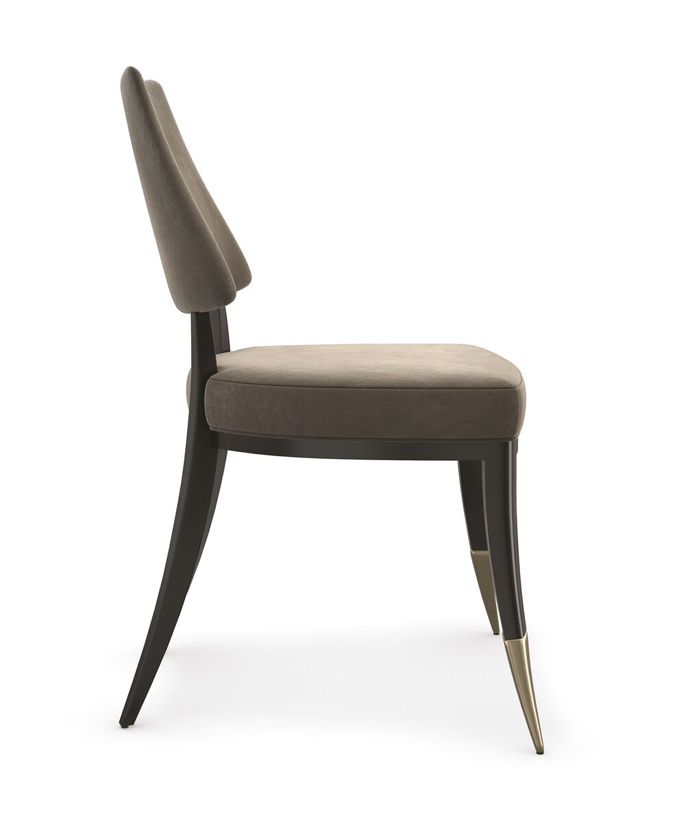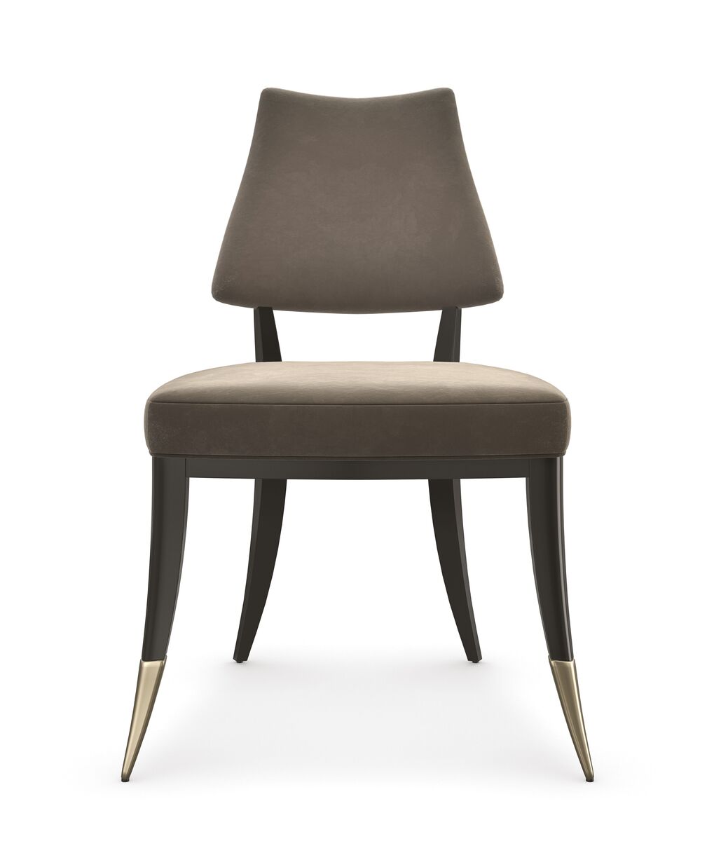 Высокие конические ножки с изгибом наружу придают стулу легкость и элегантность. Обивка из дымчато-таупового бархата создает ощущение роскоши и уютной атмосферы.
