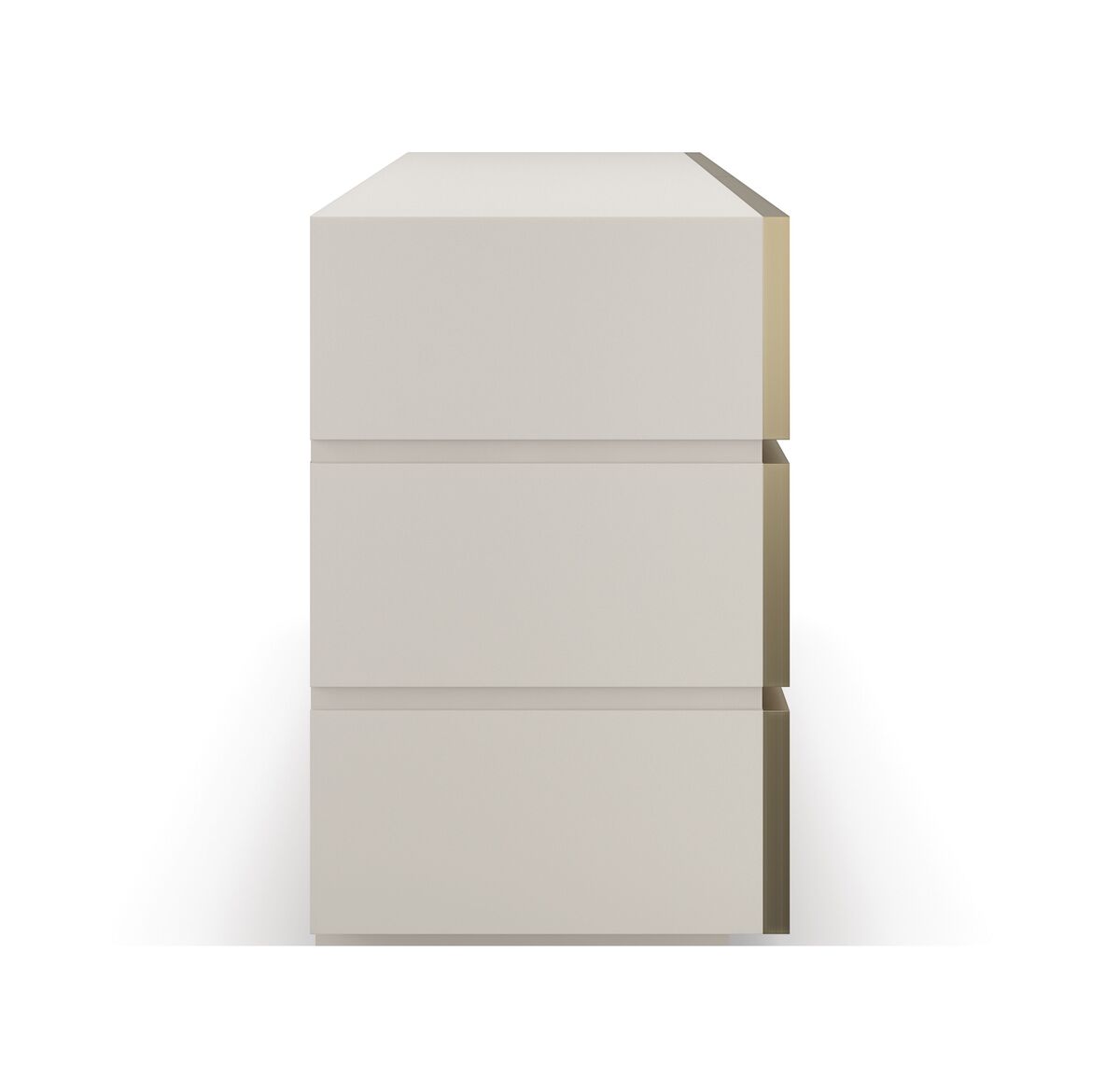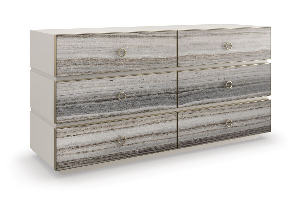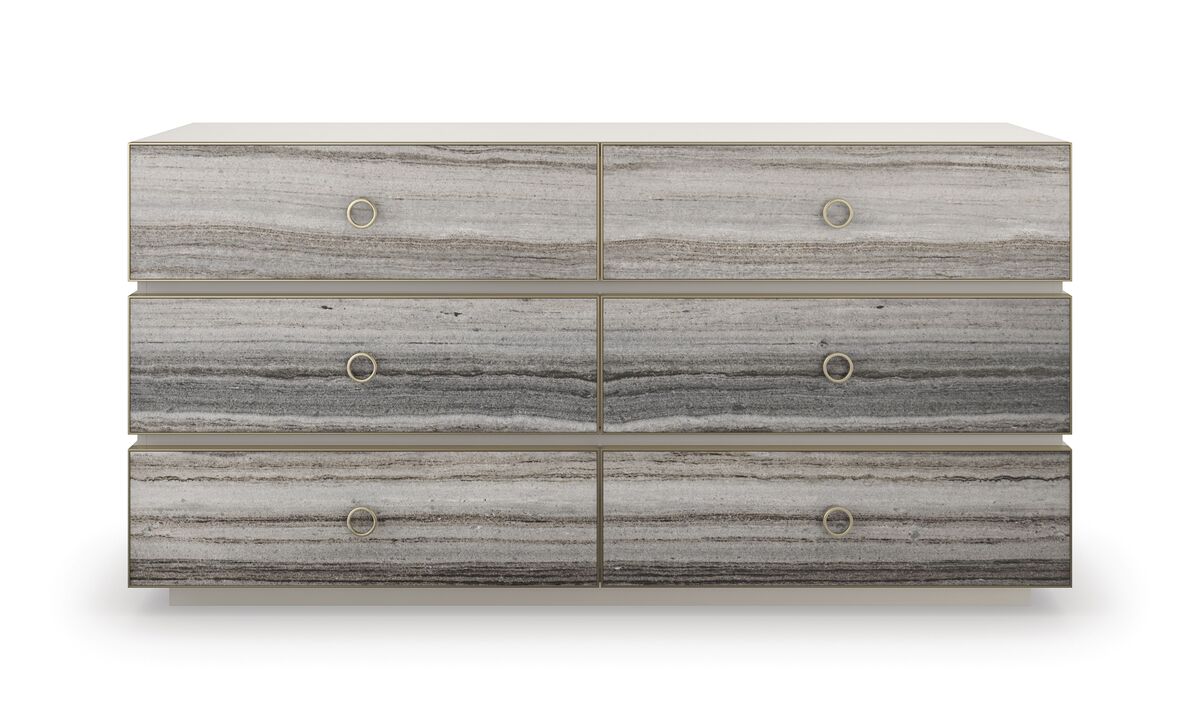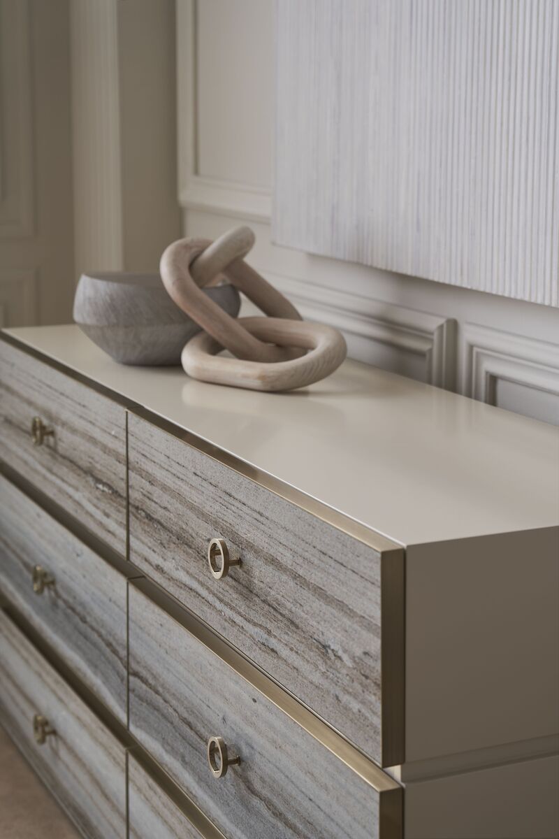 Фасады ящиков, выполненные из полированного серого песчаника с изысканными полосами и естественными переходами цветов, добавляют комоду изысканности и шарма. Минималистичная металлическая отделка и кольцевые ручки цвета Champagne Gold придают изысканный вид, подчеркивая стиль и роскошь.