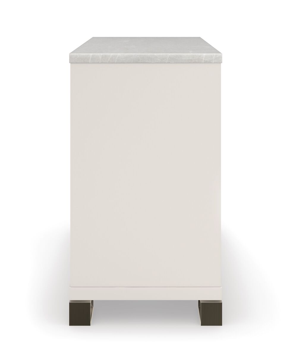 Столешница из белого мрамора Rhino придает комоду изысканный и роскошный вид, подчеркивая превосходство в дизайне. Основание и торцевая панель выполнены из гладкого белого жемчуга, придающего мебели утонченный и изысканный вид.