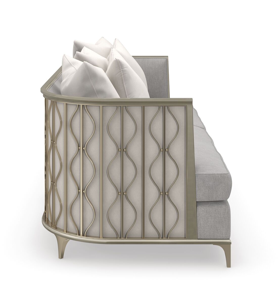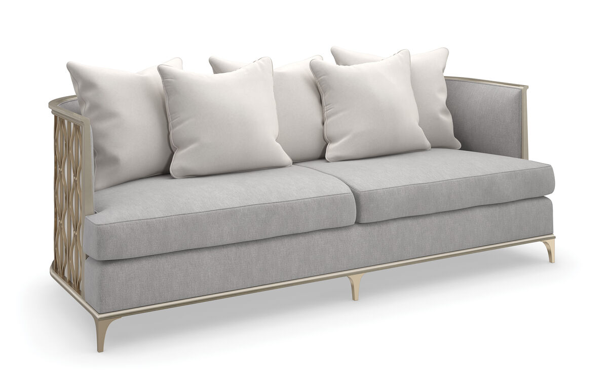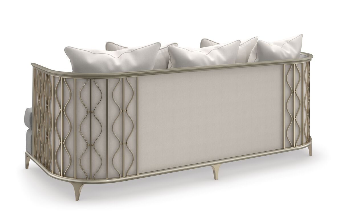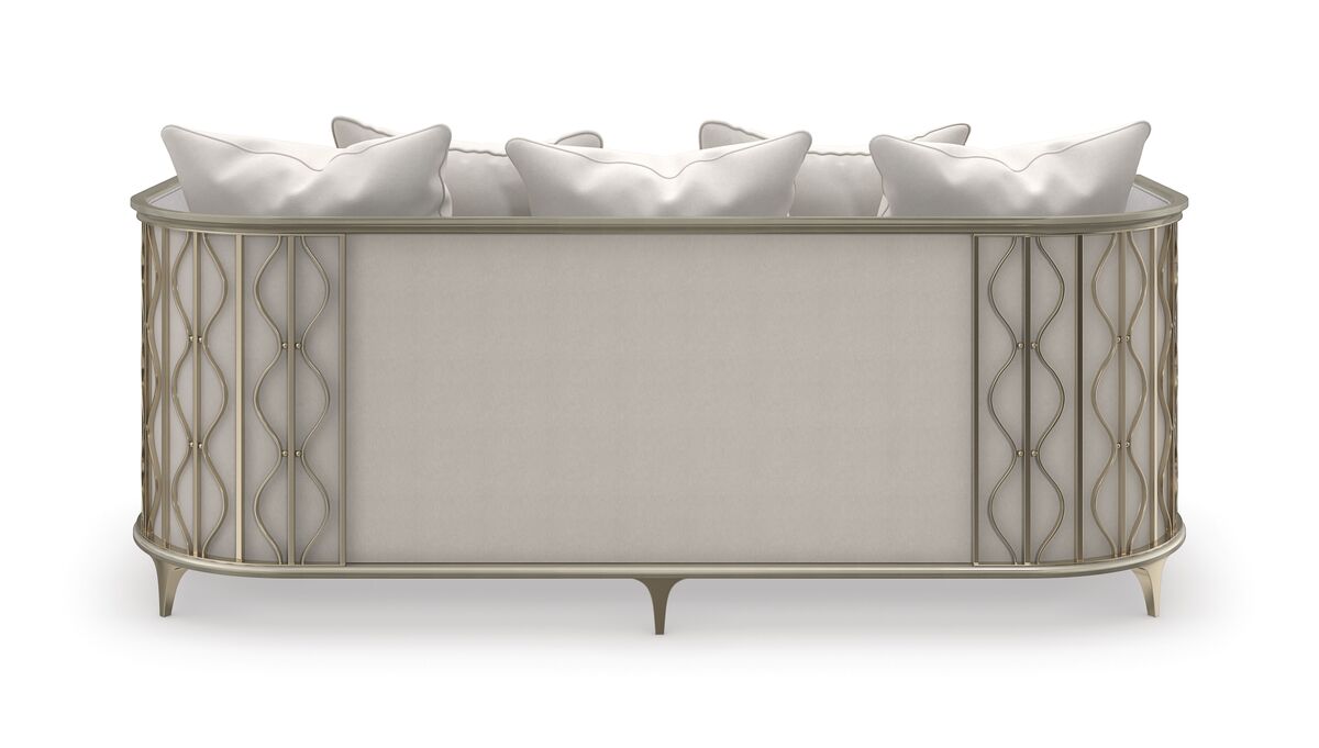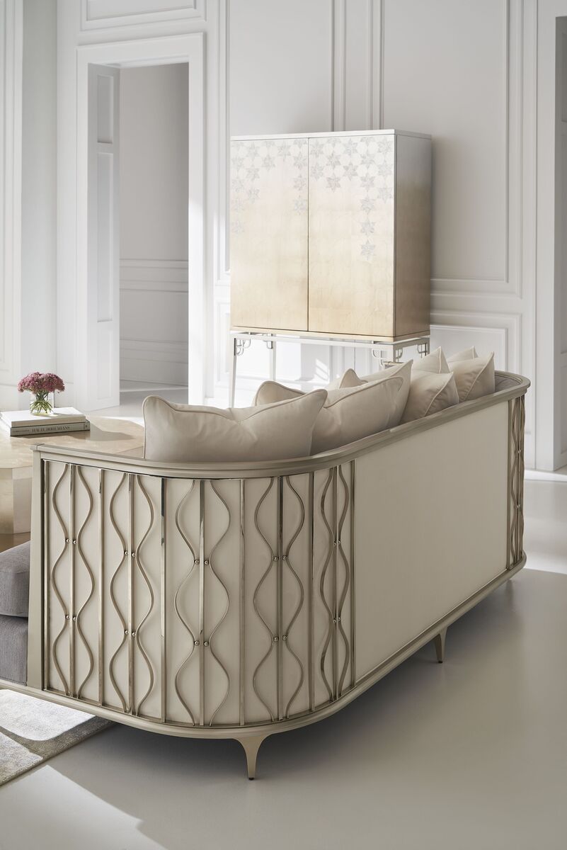 Искусный и притягательный, диван Back In Style передает спокойную красоту плавно колышущихся лент ламинарии под волнами кораллового рифа. Спинка дивана покрыта мерцающим искусственным шелком цвета шампанского, обрамленным металлическими лентами и жемчужными бусинами золотистого оттенка для придания дополнительного объема. Обивка дивана выполнена из серебристого микрошенилла с акцентными нитями из золотой фольги для дополнительного мерцания.