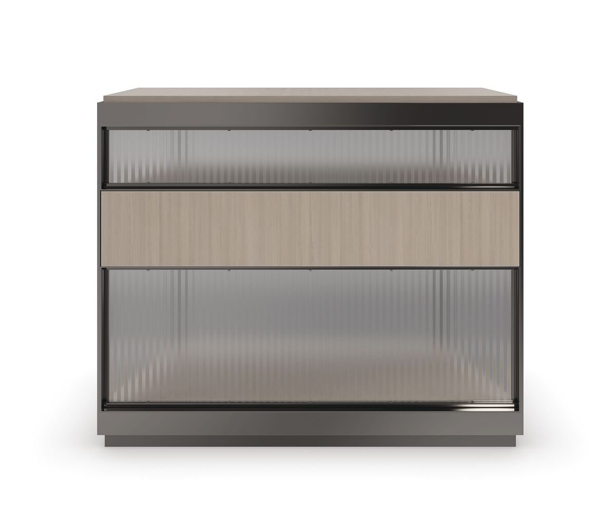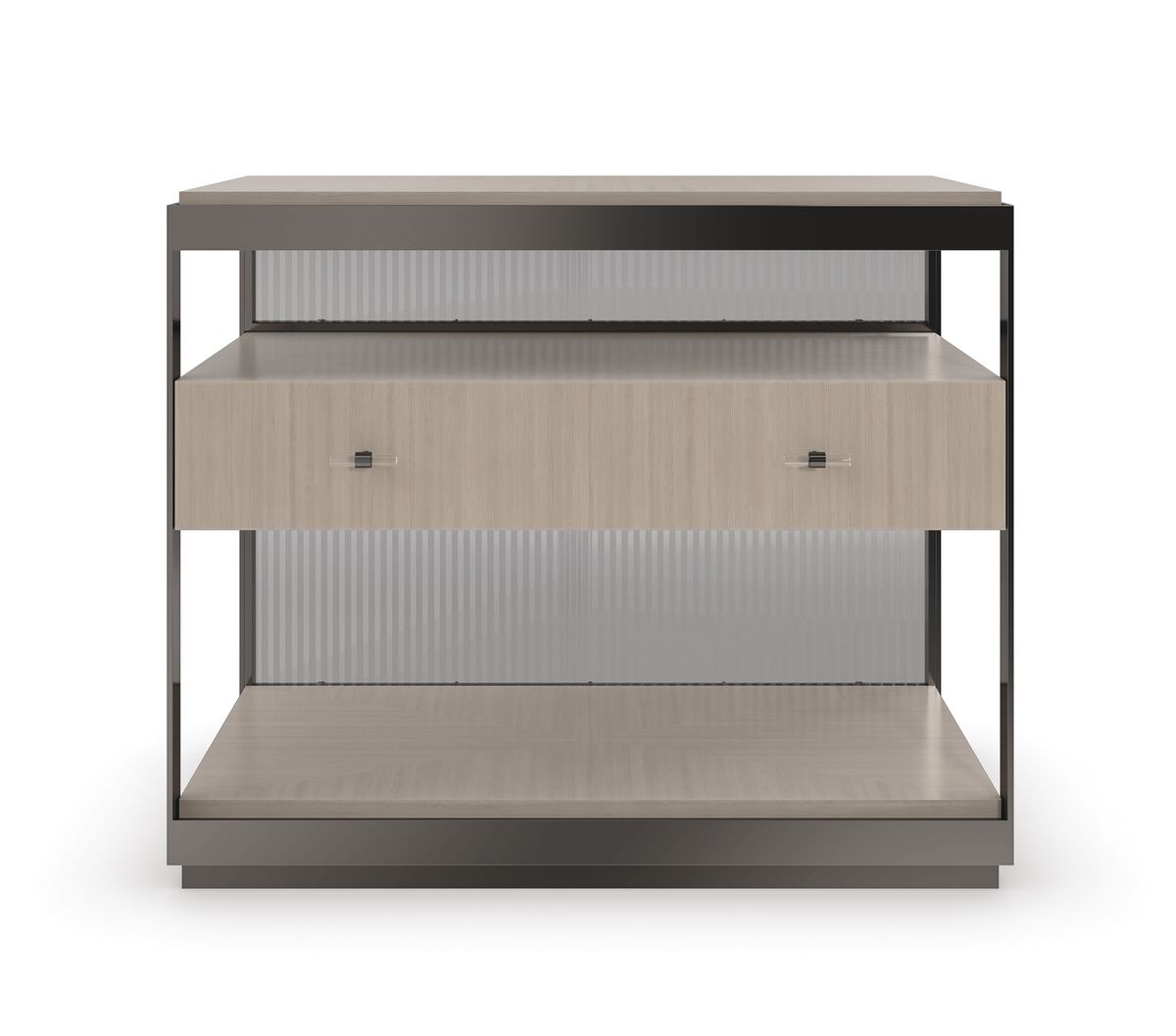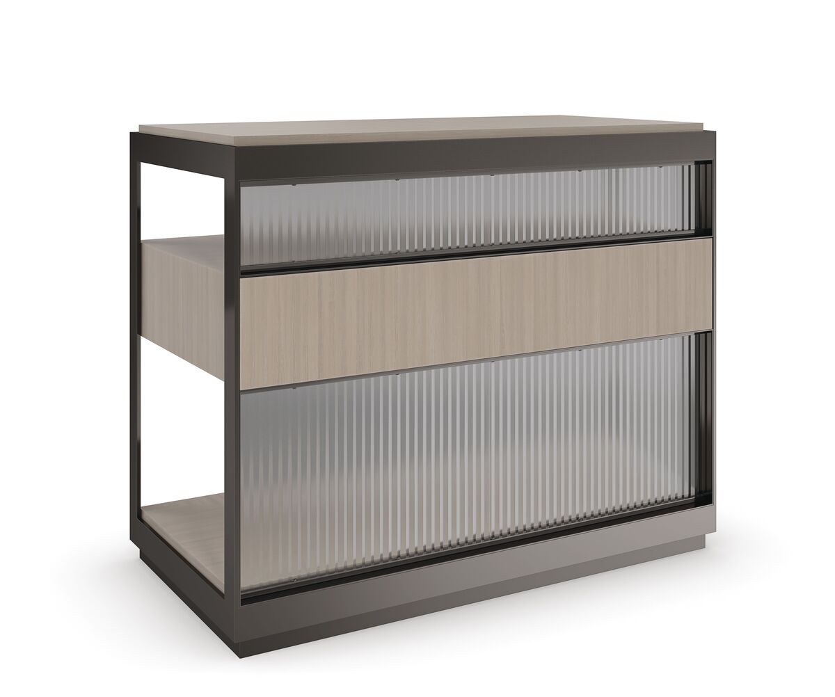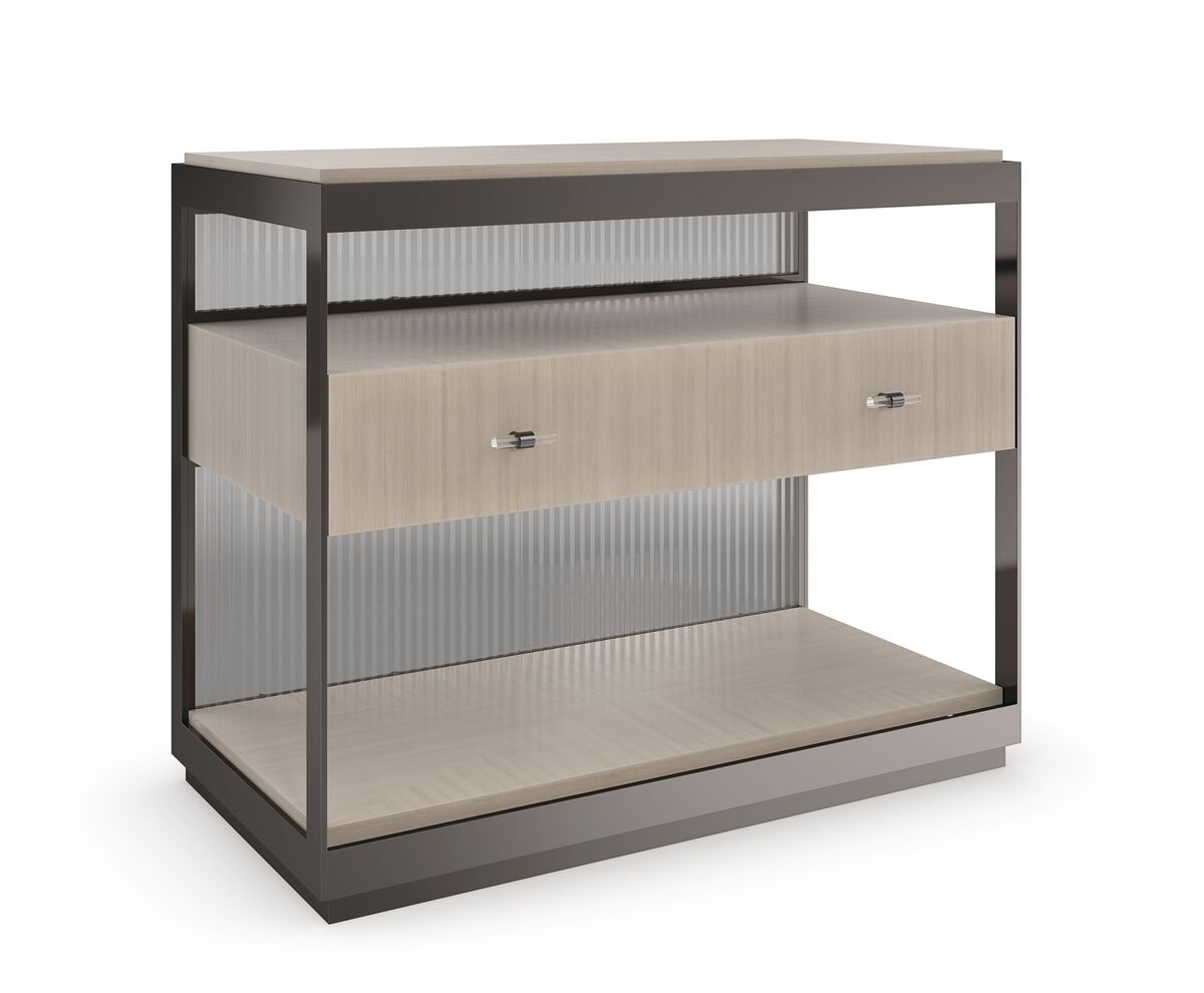 Прикроватная тумба Falling Waters — воплощение утончённого дизайна и функциональности, идеально подходящее для стильных современных интерьеров.Её конструкция включает один вместительный ящик и открытую полку, выполненные из изысканного шпона японского дерева сен. Каскадная рифлёная стеклянная панель добавляет глубины и мягко отражает свет, создавая эффект объёма.