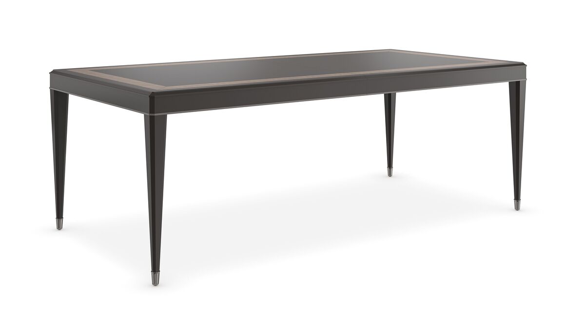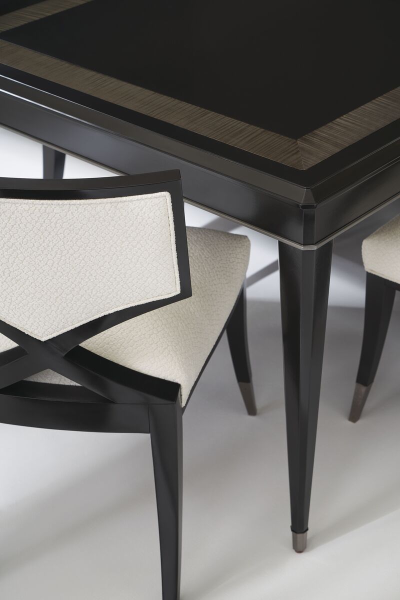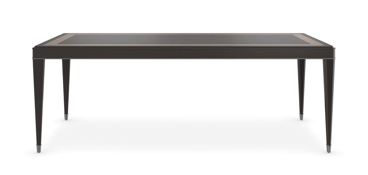 Просторный обеденный стол Full Score олицетворяет изысканность и роскошь. Параллельные линии на столешнице, напоминающие музыкальные жезлы, инкрустированы в темный тигровый клен, создавая изящную кайму. Тонкая полоса угольной краски подчеркивает угловой скос, протягивающийся по длине каждой ножки и завершающийся элегантными металлическими наконечниками цвета глубокой бронзы. Этот стол, спроектированный для великих собраний, легко раскладывается до 3,81 метров благодаря трём 56-сантиметровым створкам и центральной опоре, обеспечивая уютное место для 14 гостей.