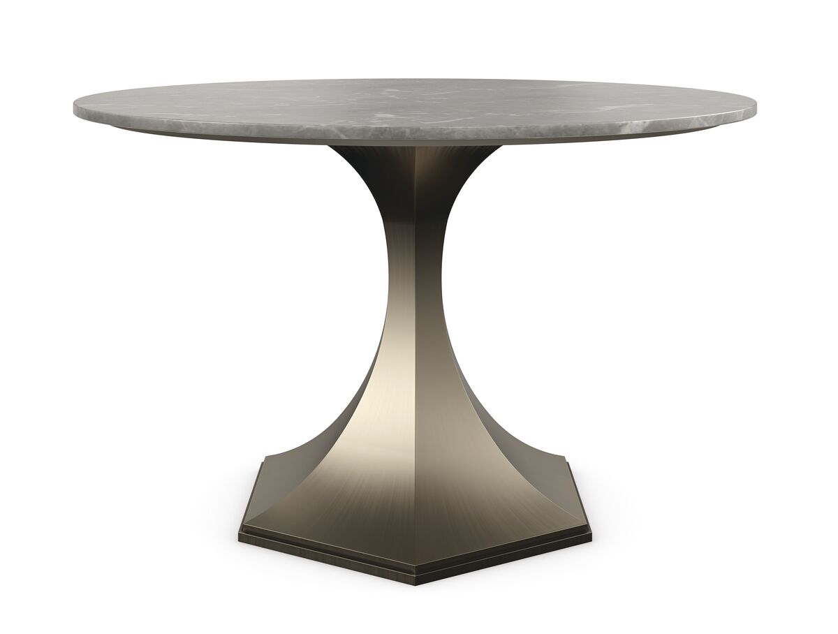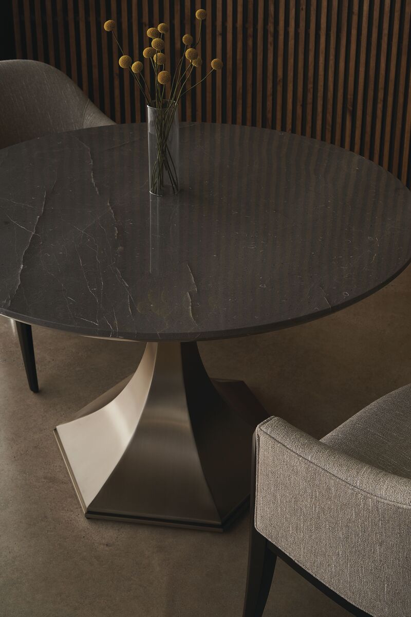 Обеденный стол Top Brass - идеальное дополнение для любого интерьера, будь то прихожая, библиотека или небольшая столовая. Его роскошная, но прочная столешница из серого камня, с классическим мраморным видом и прожилками, прекрасно сочетается с рифленым основанием, отделанным Brushed Antique Brass. Стол вмещает до шести человек, создавая идеальное место для уютных семейных ужинов или приятных встреч с друзьями.