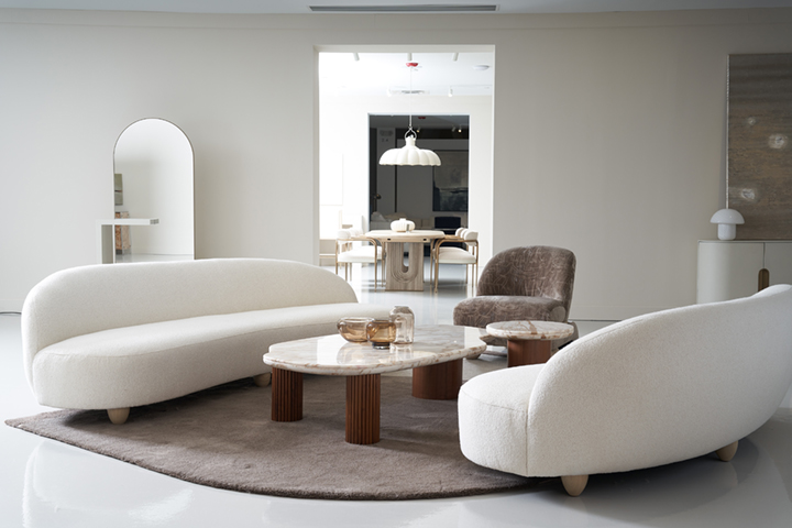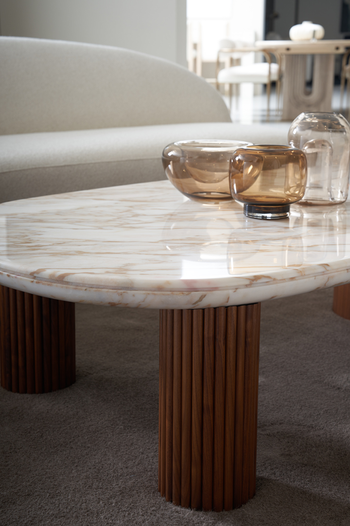 Его плавные, органические линии подчёркиваются сочетанием благородных материалов: столешница из мрамора Calcutta Oro с изысканными карамельными прожилками создаёт ощущение роскоши и скульптурности. Текстурные элементы из тростника добавляют тактильное очарование и утончённый контраст к ножкам в тёплой отделке Retro Walnut.