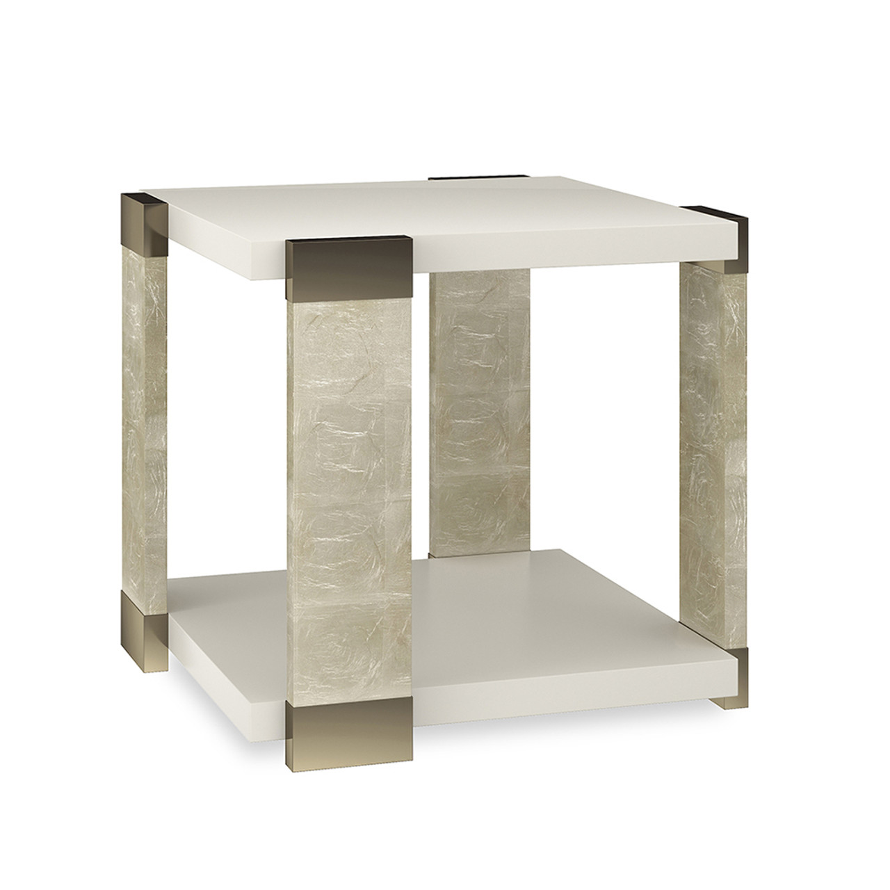Его столешница и нижняя полка цвета миндального молока словно парят между стойками, выполненными из дерева с элегантной аппликацией из листьев Oracle. Этот утончённый дизайн привлекает внимание, сохраняя при этом сдержанность. Металлические акценты оттенка Whisper of Gold украшают верхнюю и нижнюю части каждой стойки, добавляя тонкие мерцающие детали и подчёркивая эксклюзивность стола.