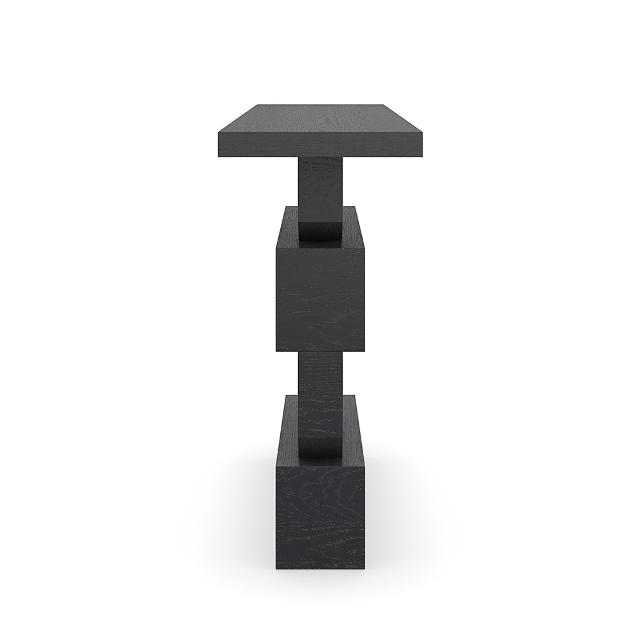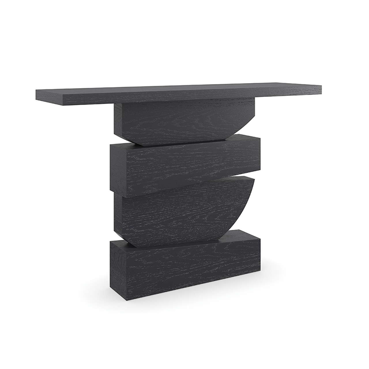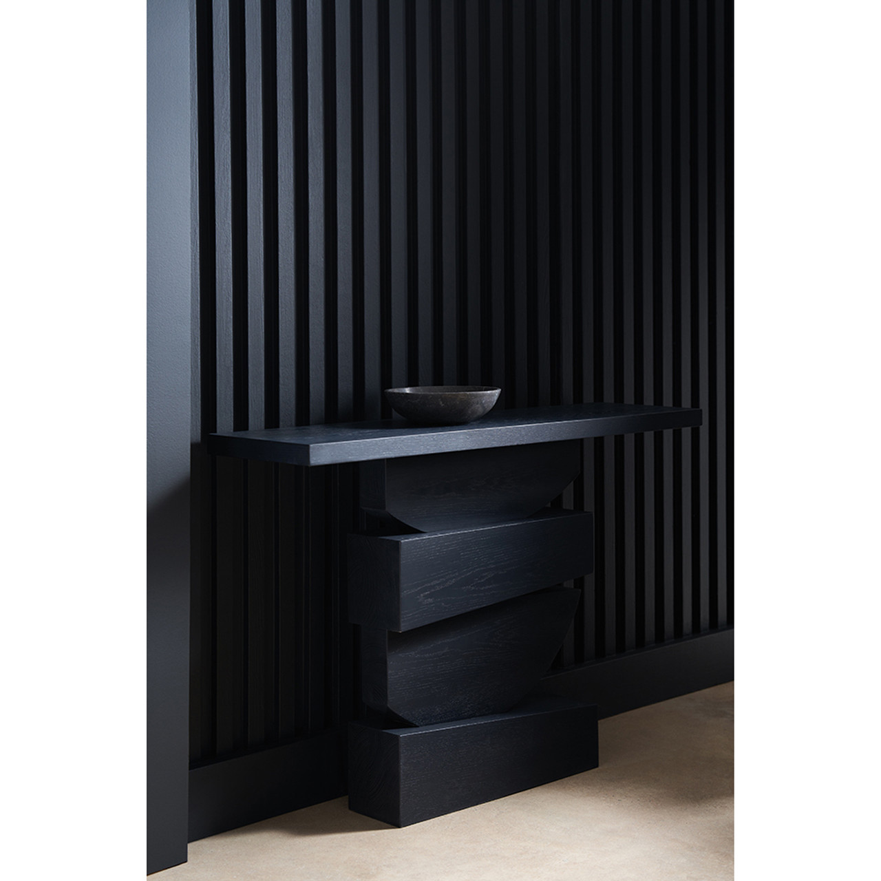 Её многослойная конструкция форм создаёт впечатляющую визуальную динамику, где каждый элемент гармонично перекликается с другим. Базальтовая отделка с глубоким драматическим оттенком придаёт консоли эффектный и современный вид, подчеркивая её архитектурный характер.
