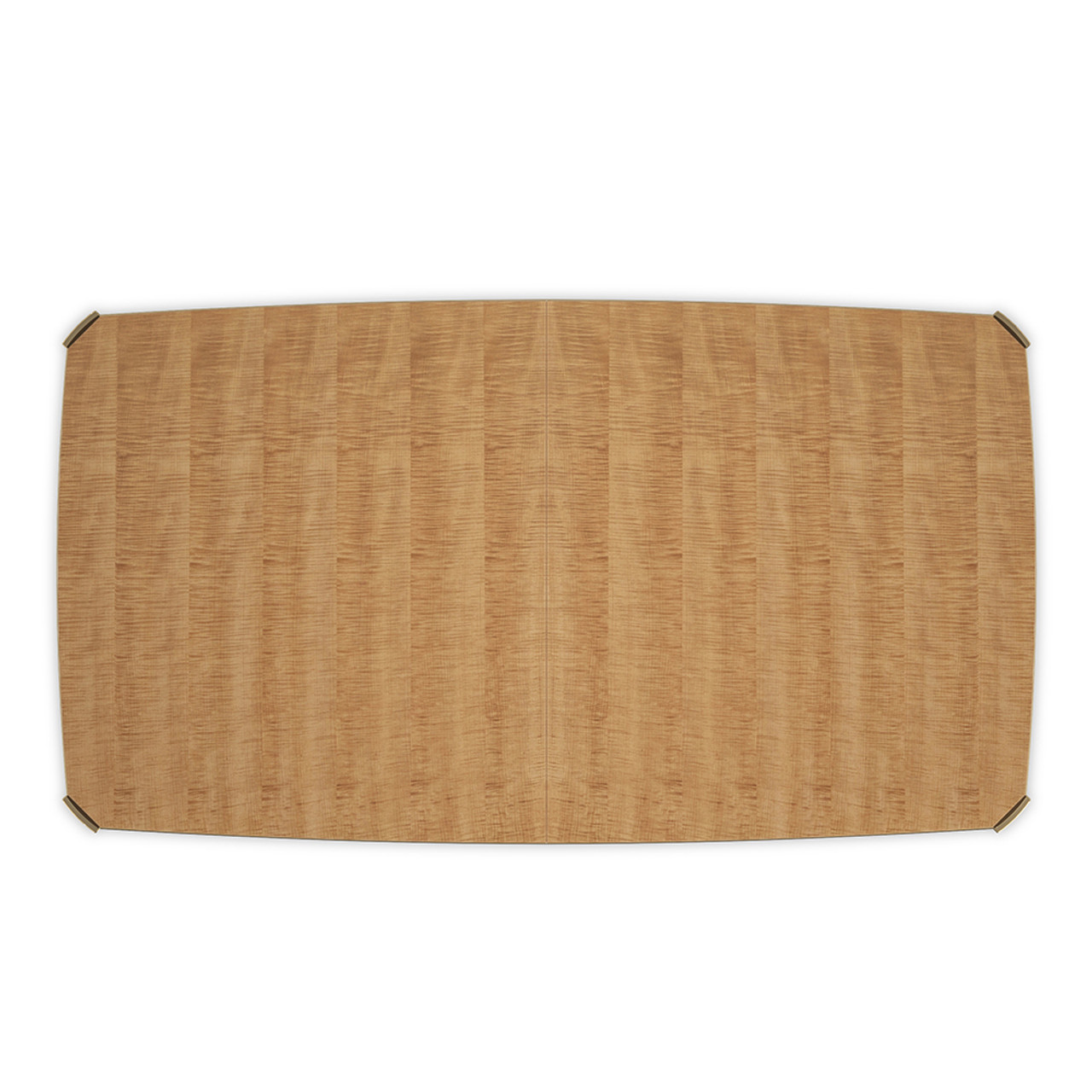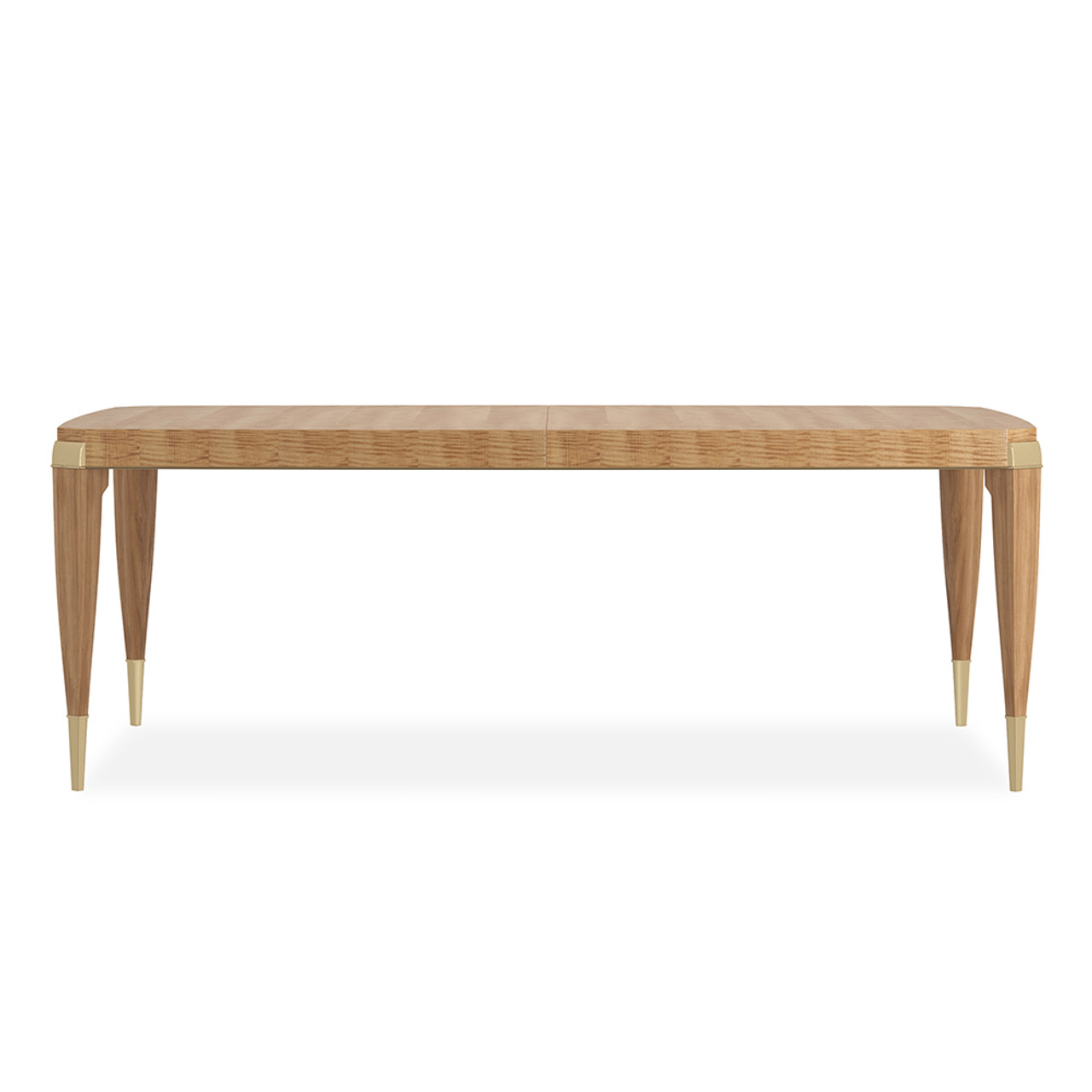 Его столешница из древесины Toasted Sycamore имеет утонченную прямоугольную форму с изящно скошенными углами, украшенными элегантными металлическими колпачками в оттенке Whisper of Gold. Фартук обрамлен тонким золотым бисером, придающим столу утонченность, а его современный дизайн дополняют ножки-кабриоли с золотыми наконечниками, изготовленными на заказ.