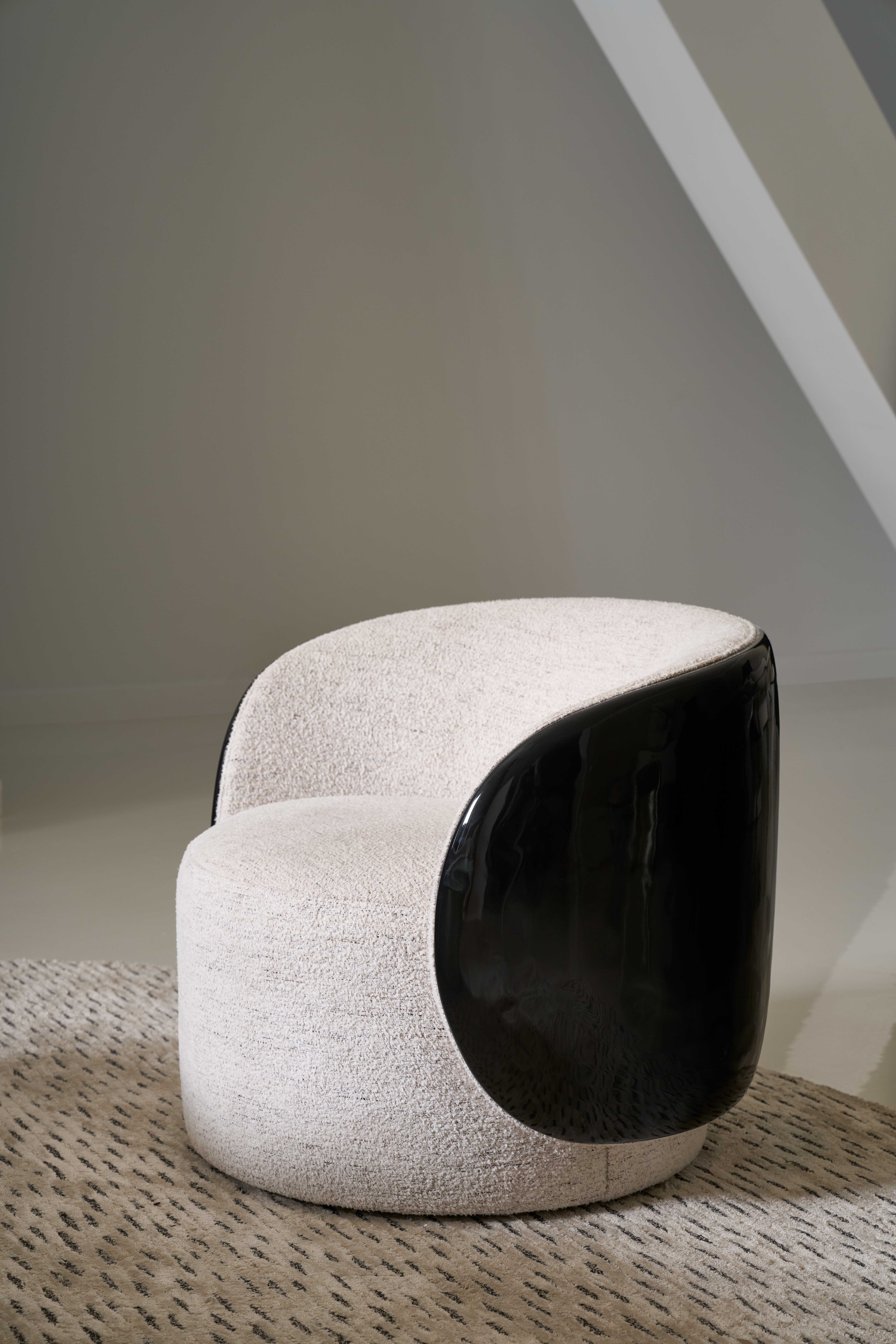 Сиденье и спинка обиты мягкой шенилью цвета слоновой кости, что дарит ощущение уюта и мягкости. Глубокое плотное сиденье и изогнутая спинка обеспечивают комфорт, обволакивая тело. Манжеты из открытой древесины с тонкой волнистой текстурой, выполненной вручную, дополнены элегантной отделкой текстурированного чёрного Piano Black, придающей модели скульптурный, эффектный вид.