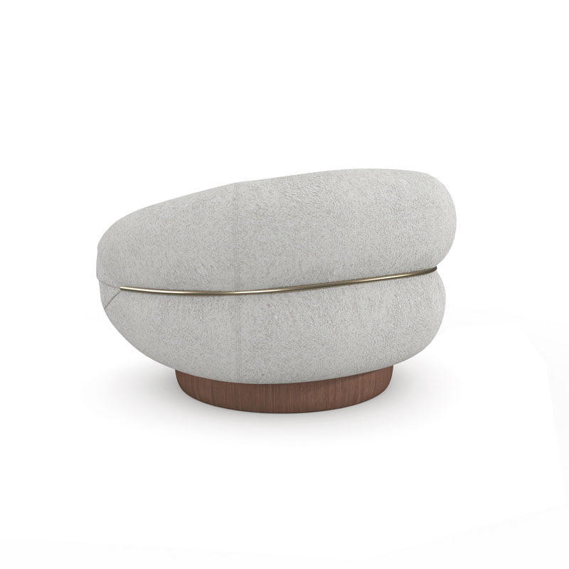 Это современное кресло с ретро-оттенком и обновлённым стилем предлагает максимальный комфорт благодаря глубокому сиденью и мягкой обивке. Оно полностью покрыто меланжевой тканью Ivory Mélange Performance Bouclé, а тонкая металлическая планка цвета золота шампань элегантно собирает спинку, придавая ей форму. Вращающееся основание из ореха с отделкой Retro Walnut имеет мягкий изгиб — подчёркивая плавность силуэта.