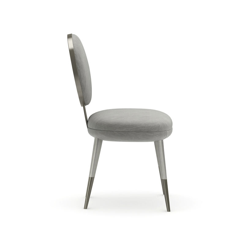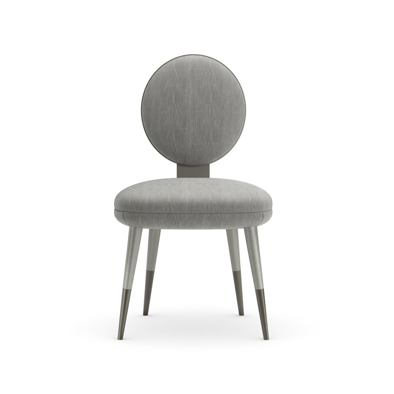 Обеденный стул APOLLO с круглой спинкой в стиле современного неоклассицизма добавляет интерьеру тёплую атмосферу и лёгкий гламурный акцент. Обтянут тёмно-серой тканью с металлическим отливом, тщательно проработанной и тактильно приятной. Каркас цвета Smoldering Paint перекликается с эстетикой атомного века, конические ножки и узнаваемые бронзовые обоймы придают образу характер. Стул одинаково уместен за обеденным столом, у туалетного столика или в рабочем уголке спальни, там где стиль встречается с комфортом.