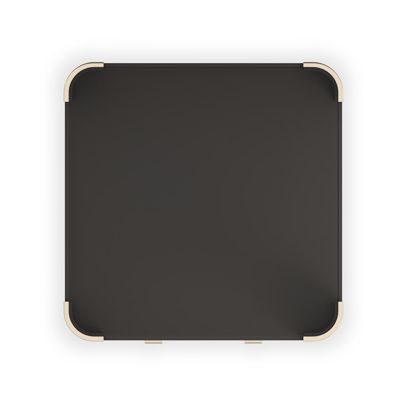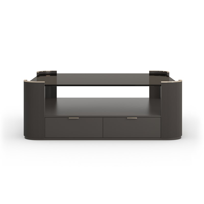 Квадратный журнальный стол LOVE добавляет гибкости в оформление пространства и легко сочетается с другими элементами мебели. Прозрачная стеклянная столешница придаёт композиции лёгкость, а на каждом закруглённом углу расположены полулунные рифлёные накладки с ручной аппликацией в цвете Dark Chocolate. В нижней части предусмотрено открытое отделение для хранения журналов и два выдвижных ящика с металлическими защёлками и фурнитурой с плавным закрыванием. Фурнитура оформлена тиснением Caracole в оттенке Whisper of Gold. Внутренняя отделка ящиков выполнена в тон внешней палитре.