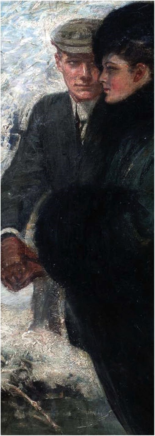 Американский художник, график и иллюстратор Кларенс Фредерик Ундервуд хорошо известен людям, которые любят литературу, акцентирующую внимание на романтической любви. Дамы и джентльмены, пароходы и террасы, светские балы и театры, свидания у околицы и расставания, поцелуи и слезы - все это можно найти в произведениях Ундервуда. В начале 20 века им было сделано два цикла иллюстраций: «Песни любви - старые и новые» и «Американские типы». Гламурно и красиво... Его творчество можно отнести к стилю «пинап», который изображал идеализированную версию того, как должна выглядеть красивая или привлекательная женщина, а рядом с ней мужественный, импозантный денди-мужчина. У Ундервуда есть свой идеал женской и мужской красоты, которые повторяются из произведения в произведение. Легко скользят по льду молодой человек и его дама, с которой он не сводит взгляд. Диагональная композиция, развевающиеся меховая горжетка и полы пальто девушки способствуют передачи романтического порыва двух молодых людей. Их силуэты хорошо просматриваются на фоне пейзажа со свежевыпавшим снегом. Белый снег, солнечные пятна на нем, деревья, покрытые инеем и снегом - самый лучший фон для показа начала романтической любви.